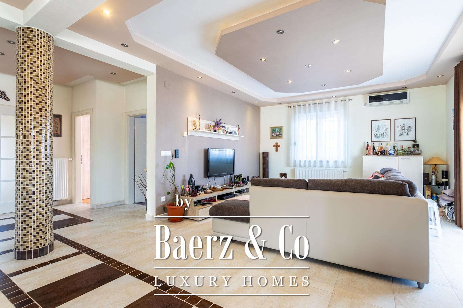 The first floor reveals a 100 m² apartment, thoughtfully furnished, with two bedrooms, two bathrooms, and a spacious living area that integrates its kitchen and dining room. An expansive 32 m² terrace opens towards tranquil sea views, instilling a sense of calm each day. Additional amenities include paved, covered parking and a dedicated storeroom.
