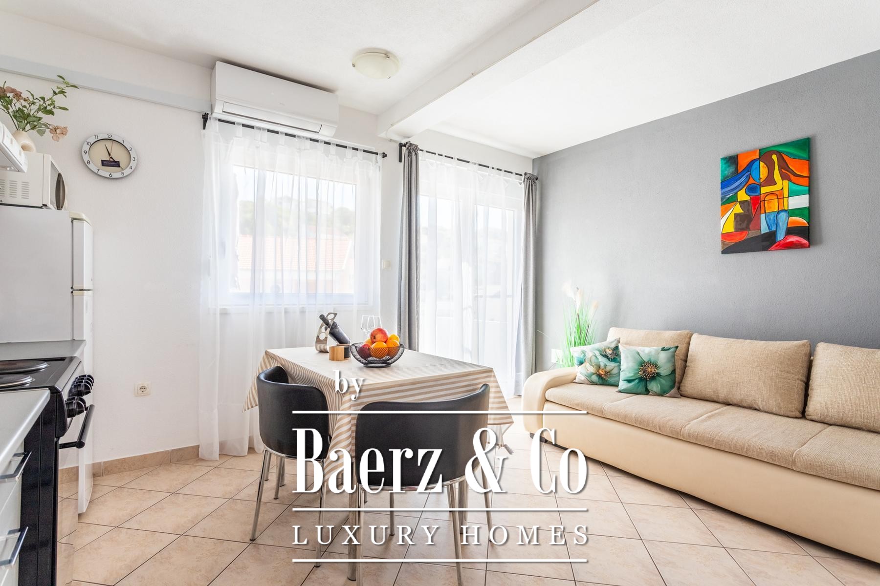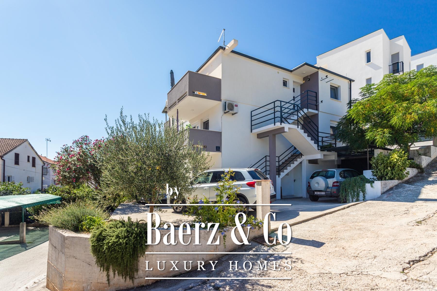Ground floor: comprises a spacious one-bedroom apartment and a beautifully landscaped yard. The apartment includes a living room, kitchen with dining area, a large bedroom, bathroom, and a covered terrace with a dining table.Outdoor space features a well-maintained Mediterranean garden with olive trees, rosemary, grapevines, palms, and a variety of flowers, creating an ideal setting for relaxation. There is also an outdoor kitchen equipped with a fireplace, sink, and oven - perfect for gatherings in the shade of the grapevine.The apartments face east, south, and west, ensuring plenty of sunlight throughout the day, while the higher floors offer beautiful sea views.Five parking spaces are available directly next to the house.Further information available upon request.