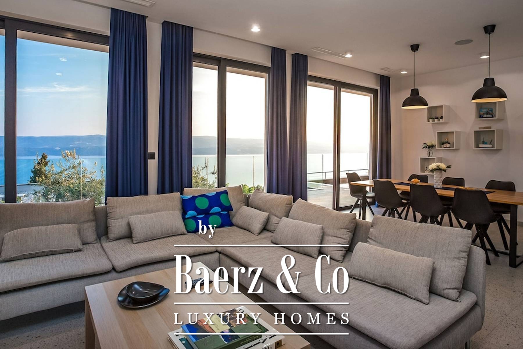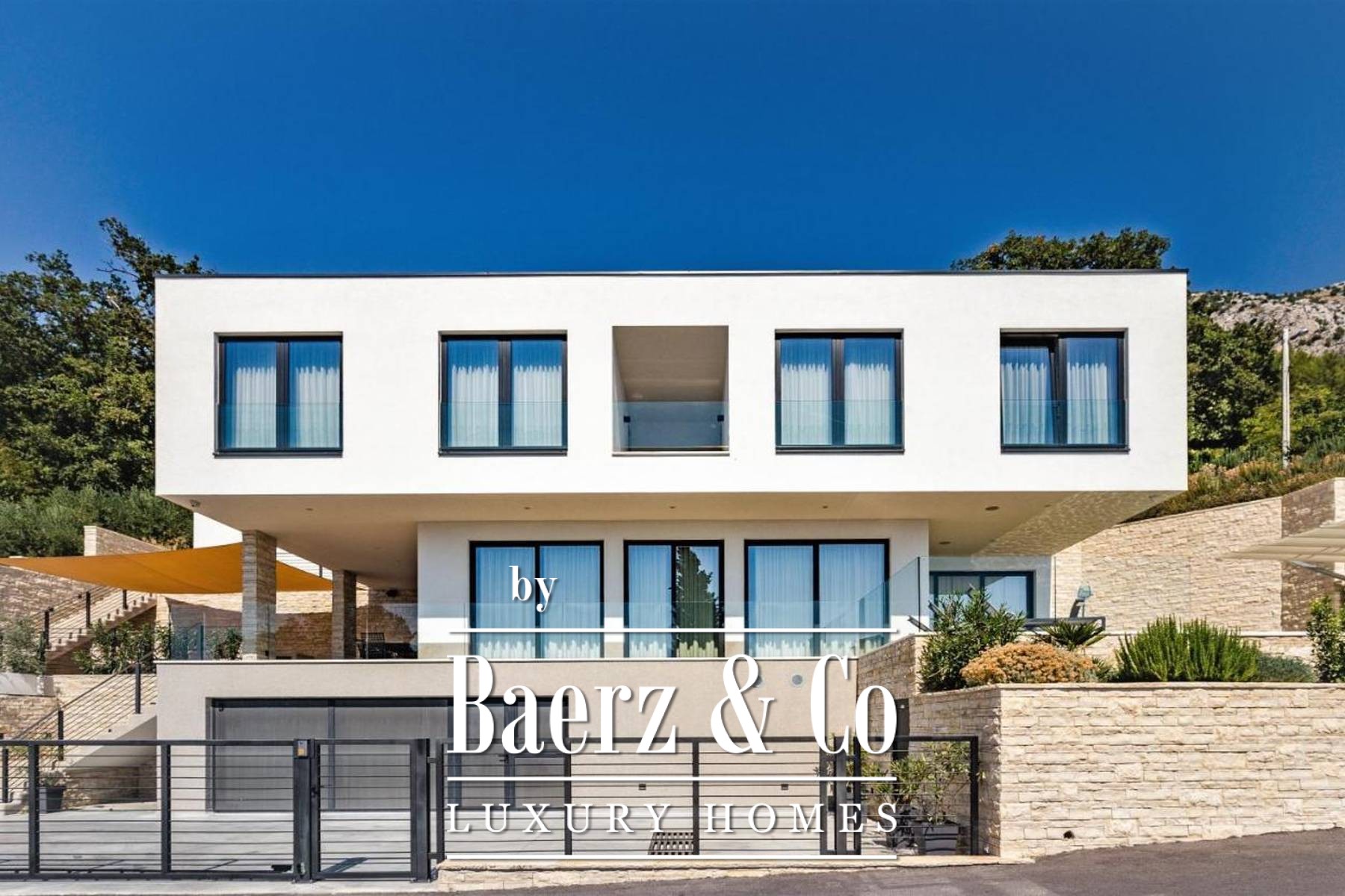 area with a sauna and a spa bathtub, a cinema and a gaming room, as well as a laundry room, and behind the villa there is a children's playground. The elegant appearance of the villa complements the Mediterranean environment and is a perfect combination of nature and modern architecture. The villa is located on a cliff, above the sea and pine trees, in the arms of the mountains, under a clear sky and warm sun. 5 kilometers from Omiš, 47 kilometers from Split airport and 33 kilometers from Makarska. It is possible to buy neighboring villas for the same price, depending on the owner. real estate company, no sales tax is paid on real estate. Other information on request