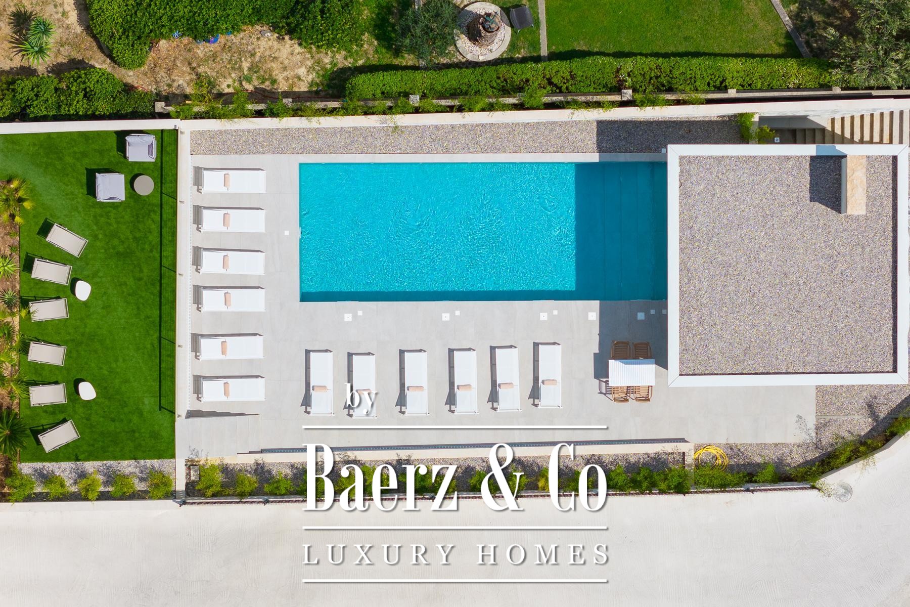 Well-designed outdoor amenities enhance the offering: a saltwater pool with massage and waterfall features, sunbathing terrace, sauna and a summer kitchen create effortless transitions between interior and exterior living. The auxiliary building accommodates poolside showers, a toilet and a storage area of 30 m². Environmental mindfulness is apparent through solar plant infrastructure and a 50,000-litre rainwater tank with landscape irrigation.
