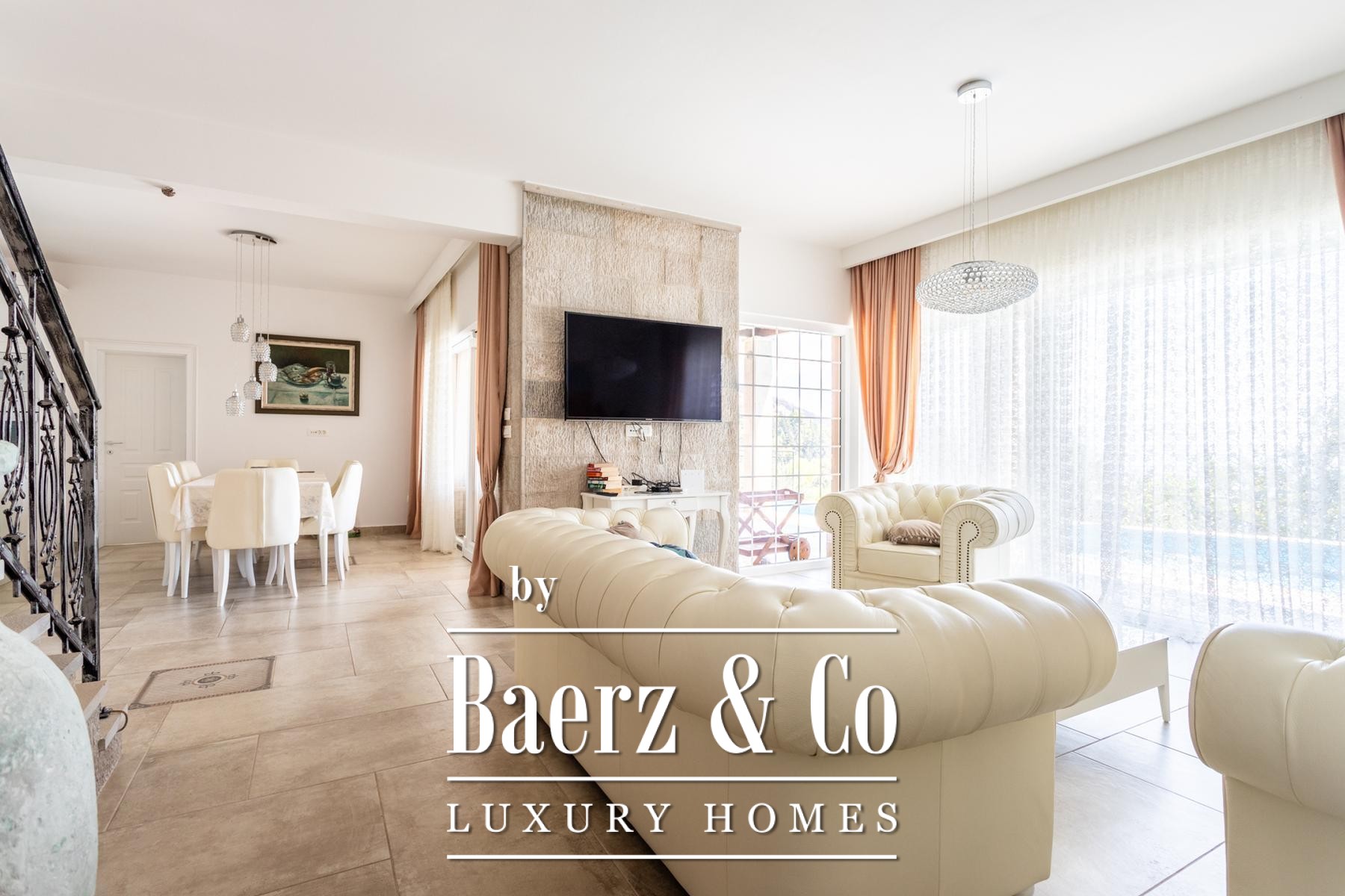 Mimice, on a plot of 1378 m2, there is a beautiful two-story house with a heated pool and an equipped outdoor kitchen.