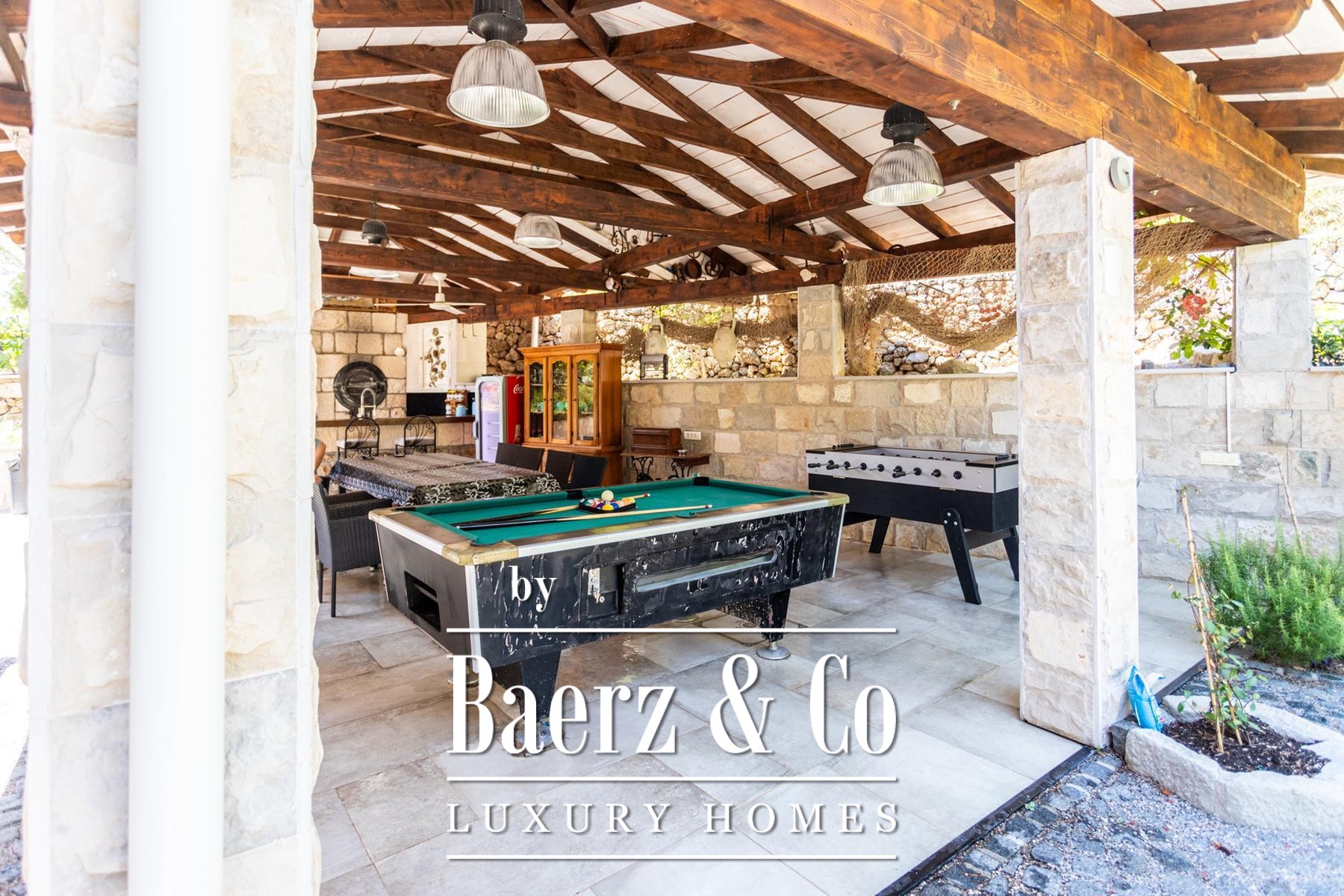 The fenced and cultivated garden hides a heated pool (40 m2), a sunbathing area, an outdoor shower and parking sufficient for three cars on the south side, while on the north side there is a fully equipped outdoor kitchen with a barbecue, a large dining