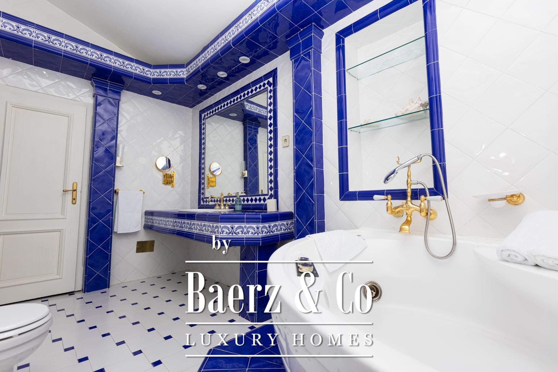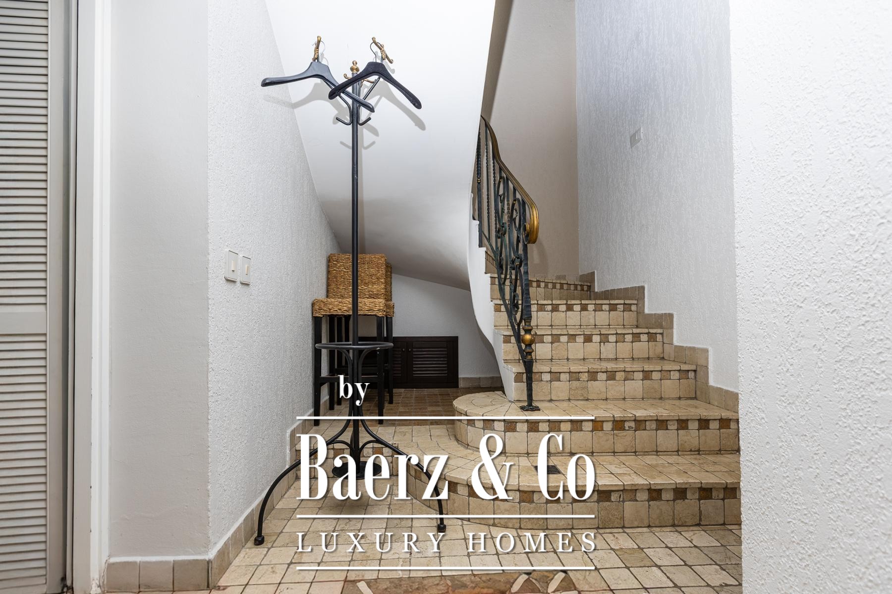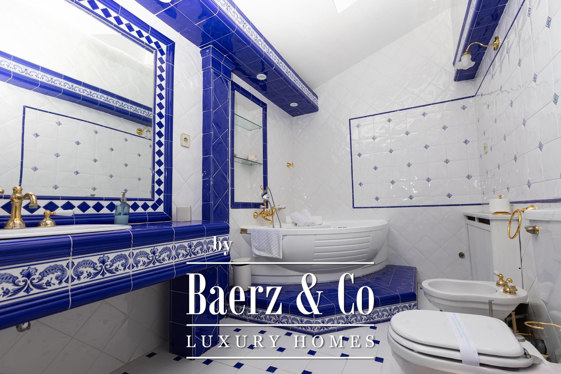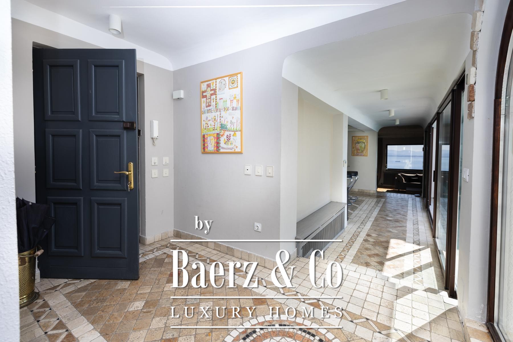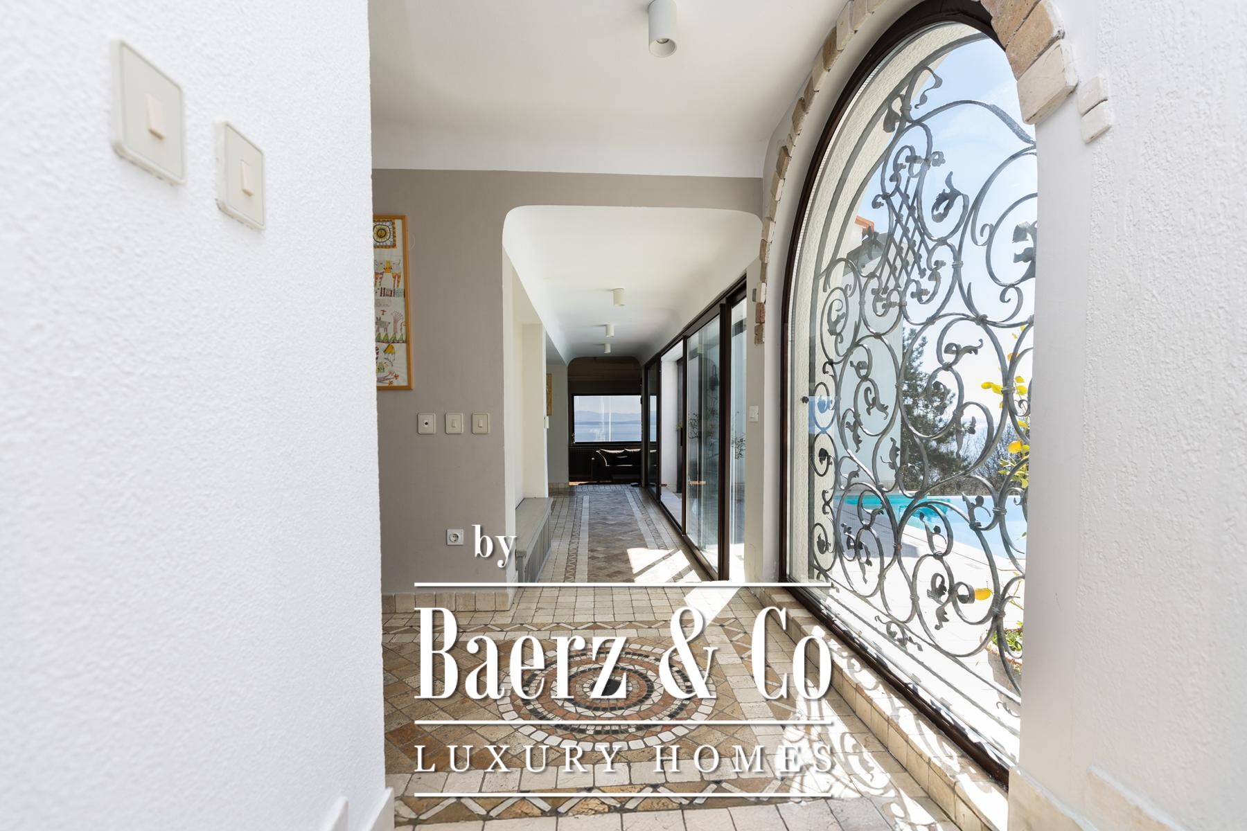 Comprising three independent residential units, the villa accommodates seven bedrooms and seven bathrooms, creating flexibility for family living or hosting guests. Two studio apartments, each with private terrace, kitchen, and ensuite, offer privacy and independence. The main house unfolds over two levels: the ground floor reveals a flowing open living and dining space, two master bedrooms with en-suite bathrooms and walk-in closets, as well as gallery, guest facilities, storage, and utility rooms. Upstairs, two further bedrooms share a large terrace overlooking the bay.