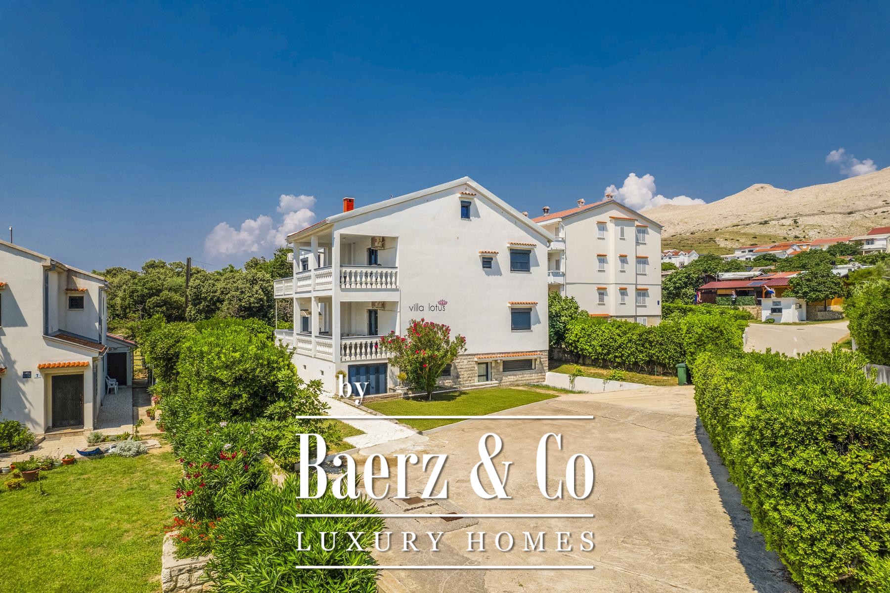 Townhouse Pag stands just 50 meters from the Adriatic, offering eight apartments distributed across four floors, shaped by a 694 m² plot and a total living area of 407 m². This townhouse Pag, set in a peaceful enclave enveloped by greenery, invites a quiet pace of life balanced with coastal accessibility.