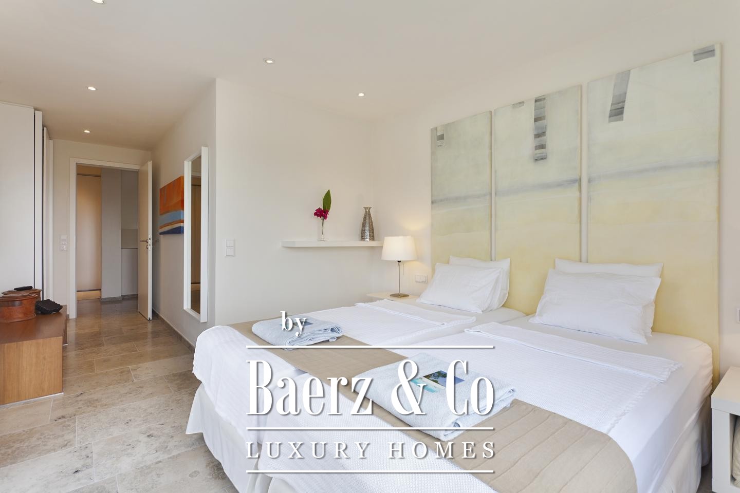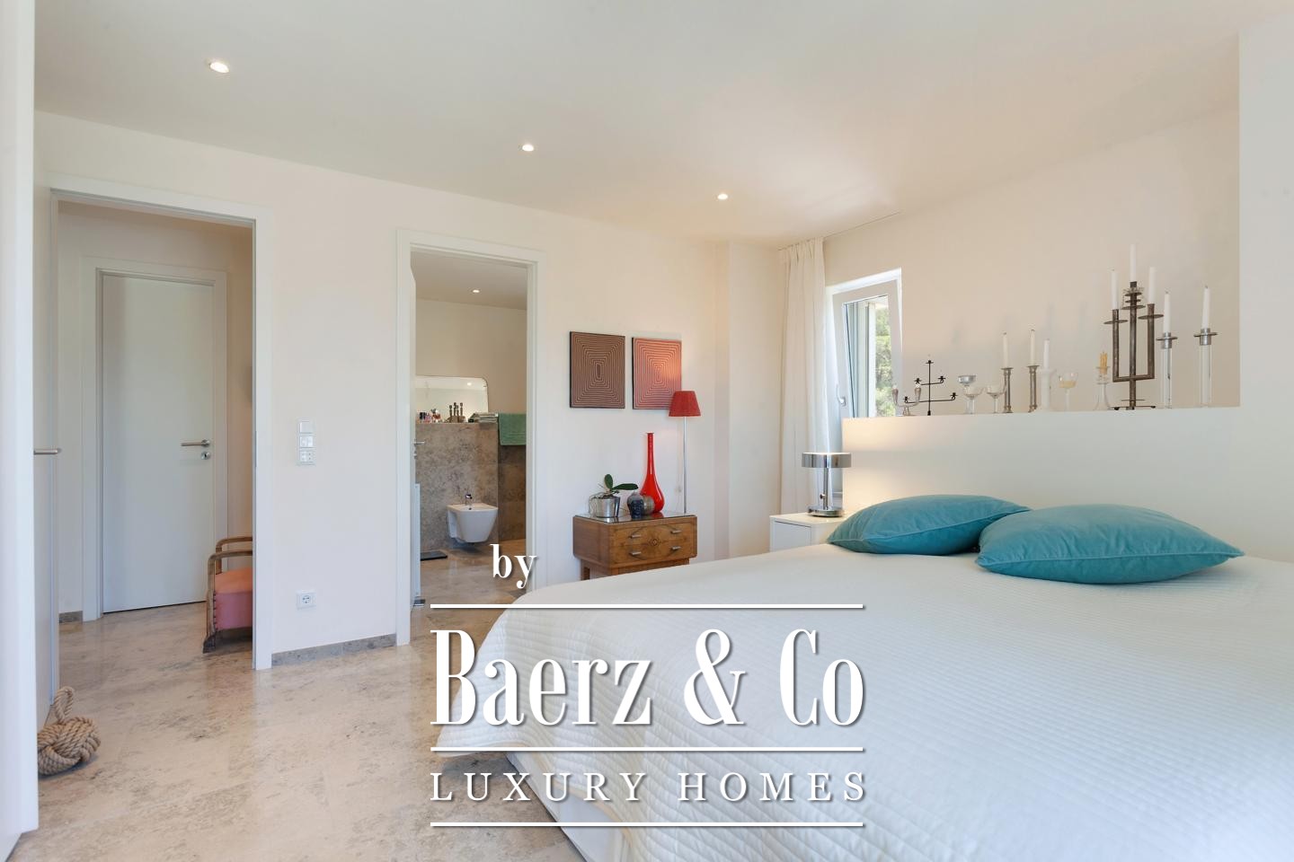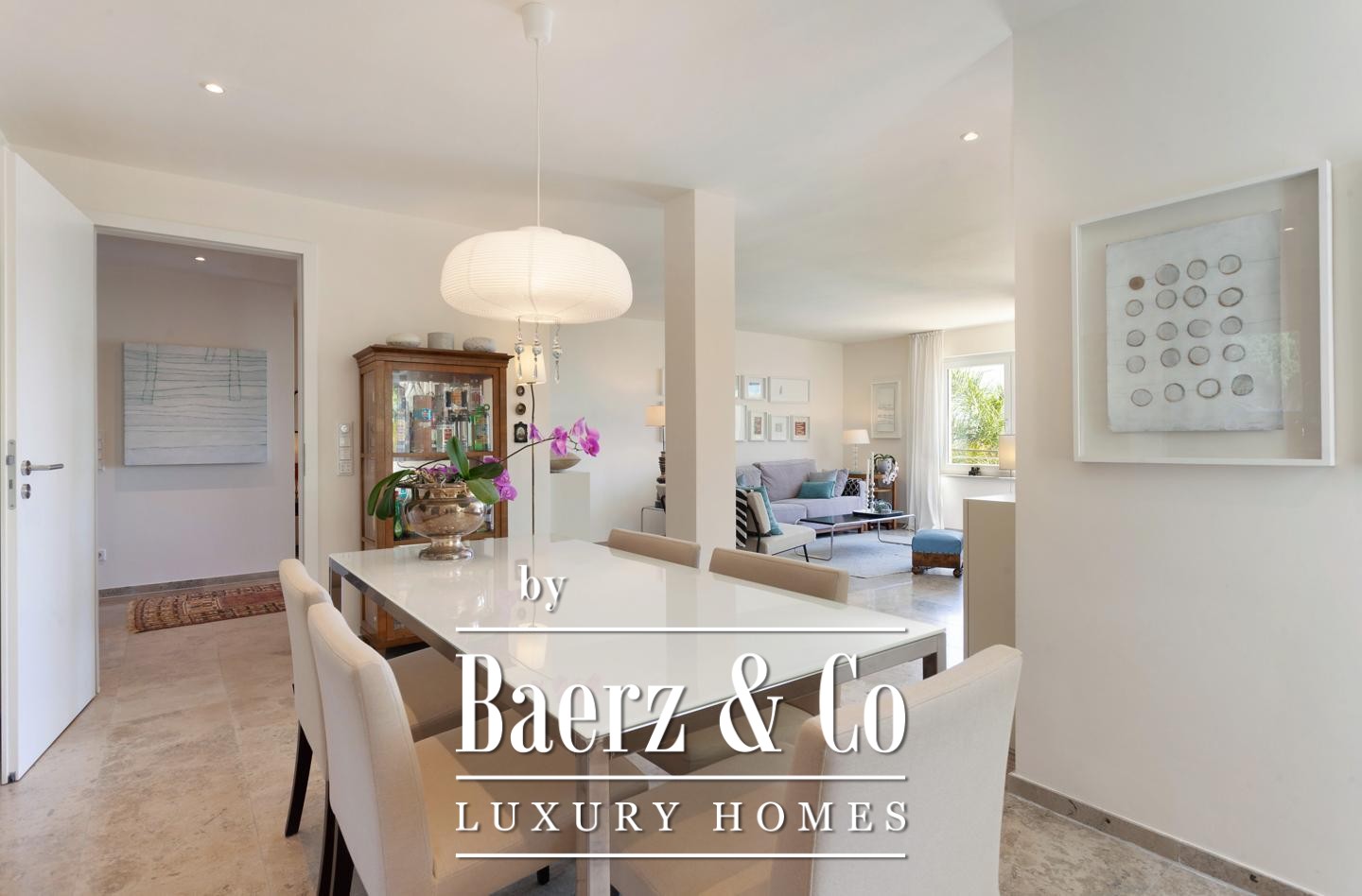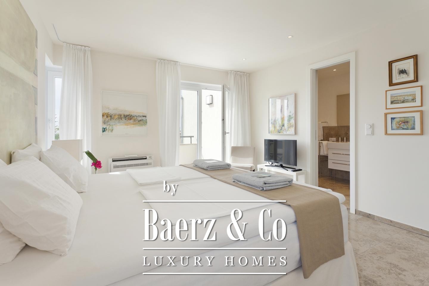 The guest house, nestled beyond the saltwater pool, comprises two apartments, each with a living room, bedroom, bathroom, and private terrace, serving as an intelligent investment or an elegant retreat for guests. Thoughtful outdoor zones include a carefully landscaped garden and the possibility for a summer kitchen to heighten outdoor living.