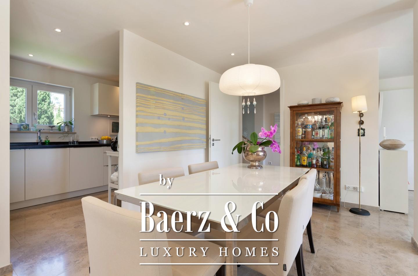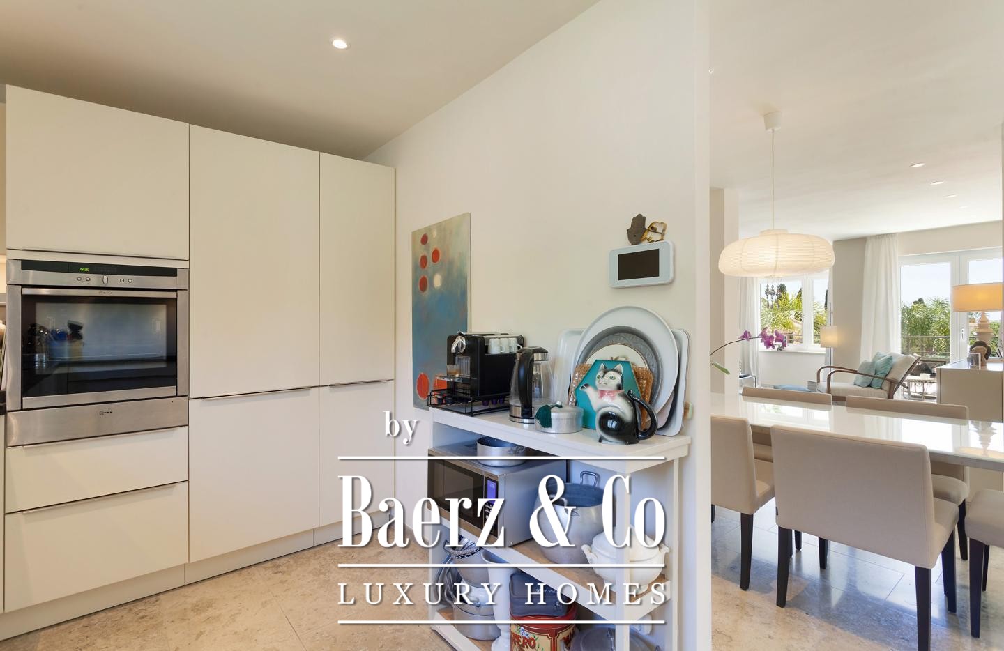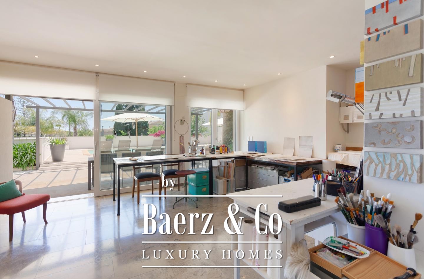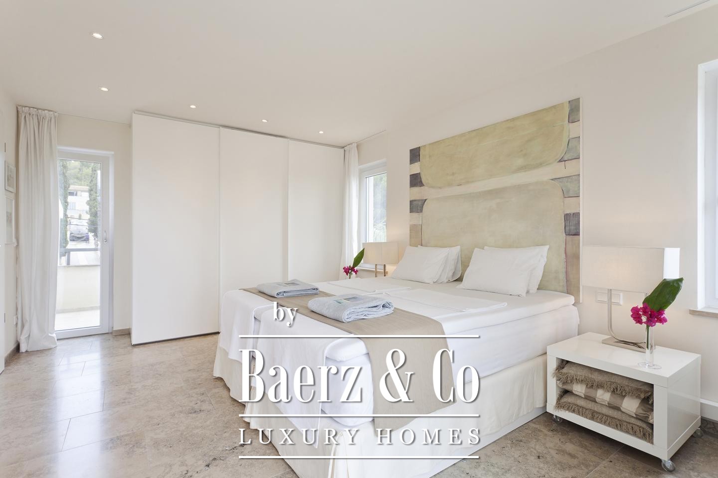 The guest house, nestled beyond the saltwater pool, comprises two apartments, each with a living room, bedroom, bathroom, and private terrace, serving as an intelligent investment or an elegant retreat for guests. Thoughtful outdoor zones include a carefully landscaped garden and the possibility for a summer kitchen to heighten outdoor living.