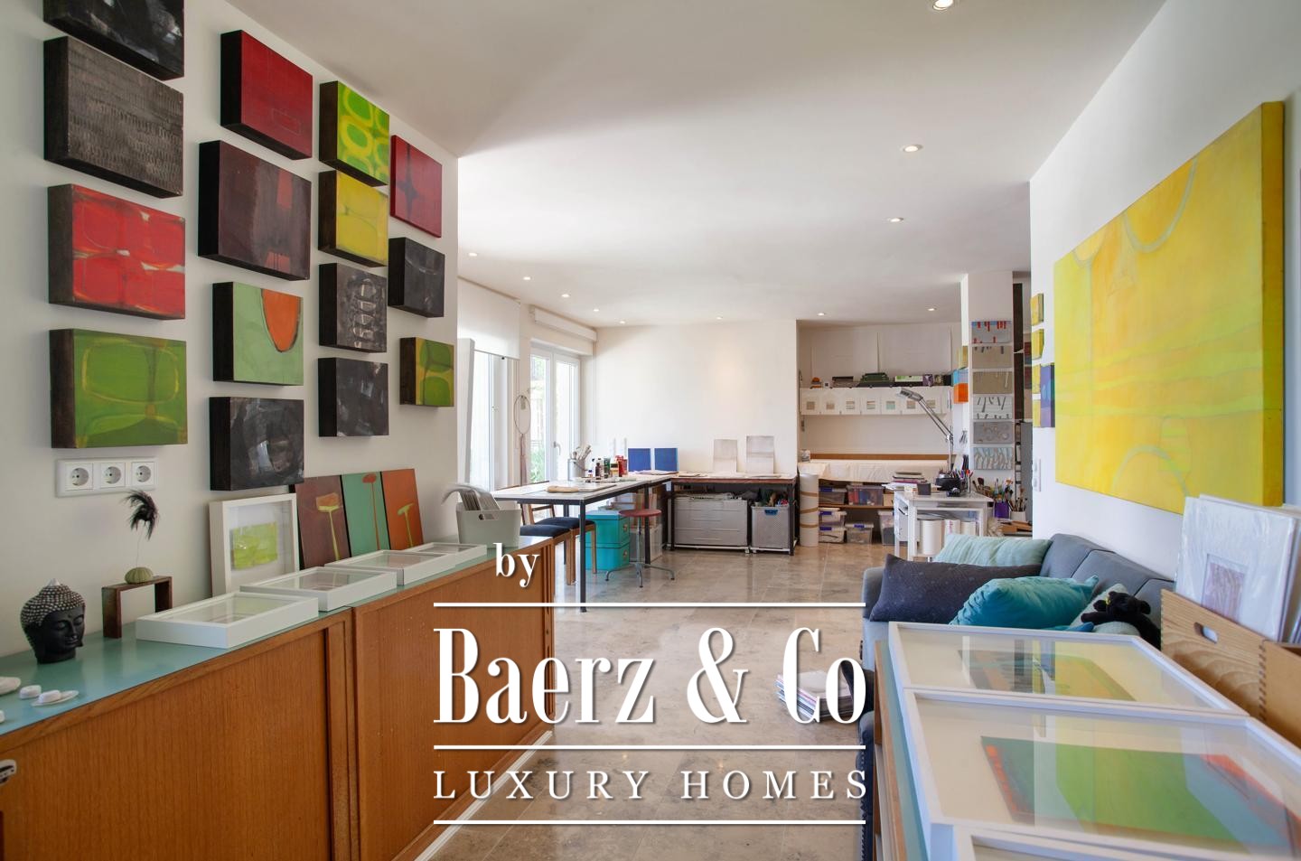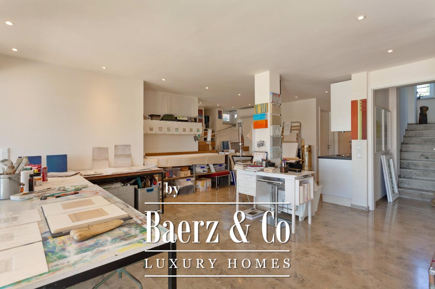 The main villa, shaped by an owner with expertise in architecture, design, and art, offers a layout focused on harmony and functionality. On the main floor, a luminous living-dining room opens onto a terrace and Mediterranean garden, while an equipped kitchen and a bedroom suite ensure privacy and comfort. Upstairs, three bedrooms with balconies invite light and air, complemented by two distinct bathrooms. The ground floor provides studio space with pool access, a laundry room, and an integrated garage, enhancing the spatial experience. Underfloor heating, air conditioning, and marble floors ensure ease in every season.