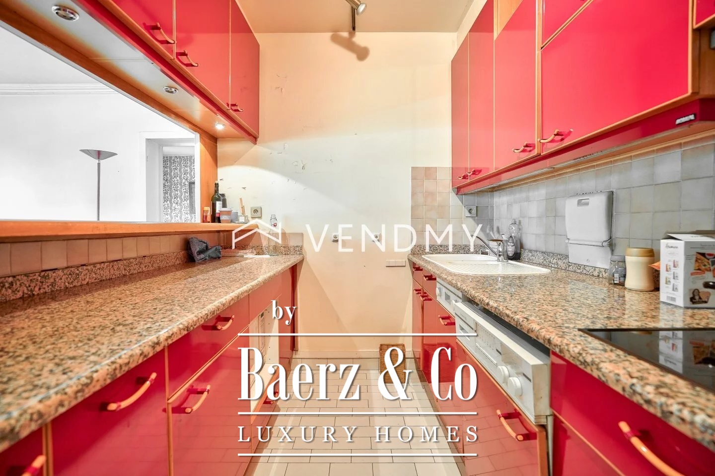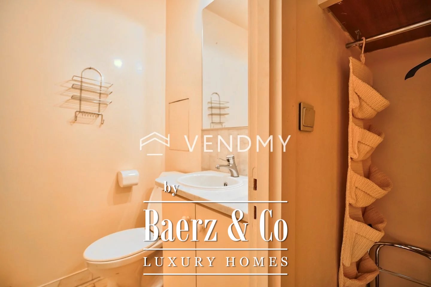 Clean lines carry from the light-filled entrance through to a private dressing area, guest toilets, and a living room with space for both leisure and dining. Glass doors open to the balcony, creating easy flow between the indoor volumes and the natural outlook. The partially open kitchen offers flexibility, designed to be revealed or concealed to suit any occasion. The bedroom includes an en-suite bathroom featuring both a bath and separate shower, and thoughtful storage. A cellar and the option for a secure underground parking space, serviced by elevator, further enhance convenience and peace of mind.