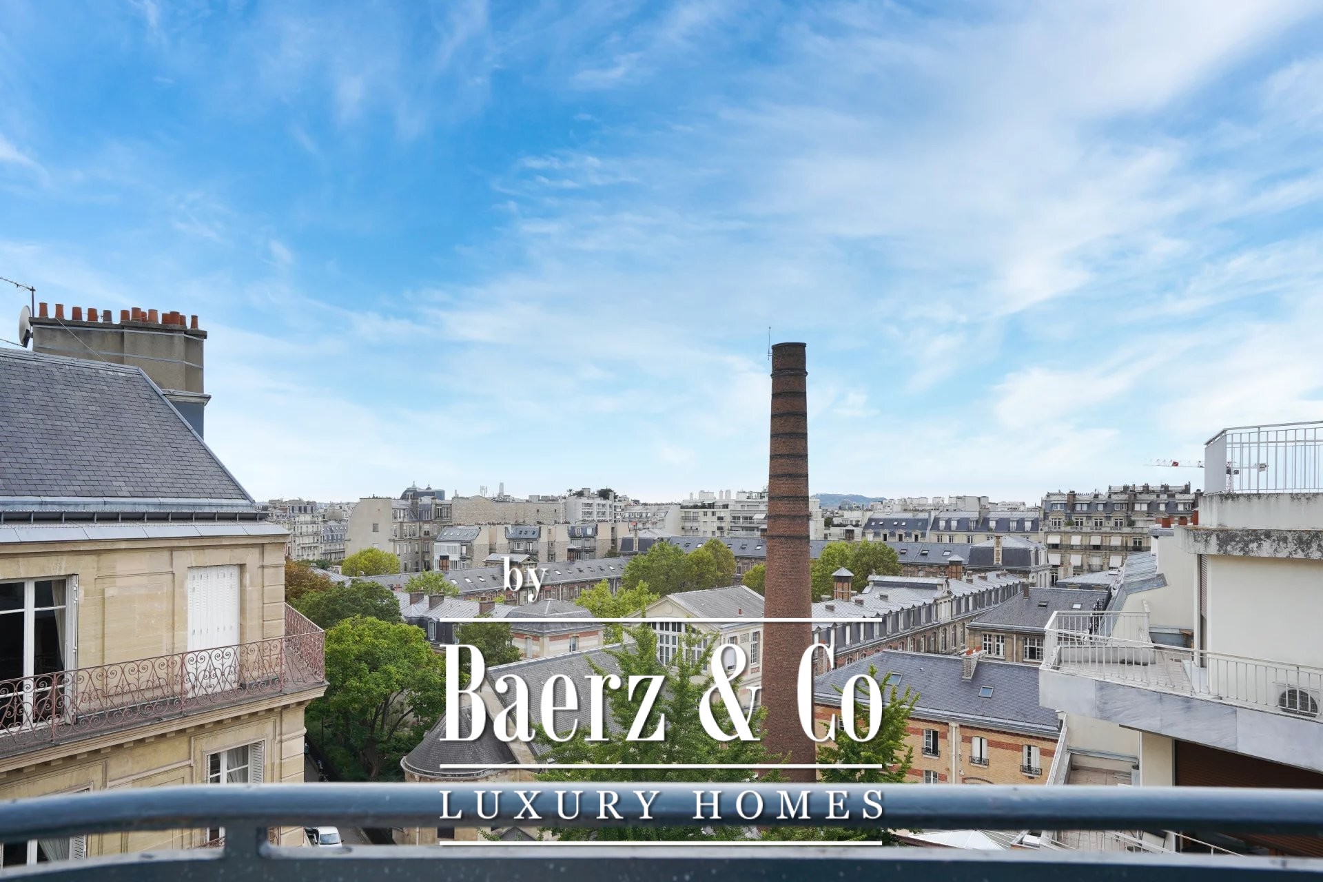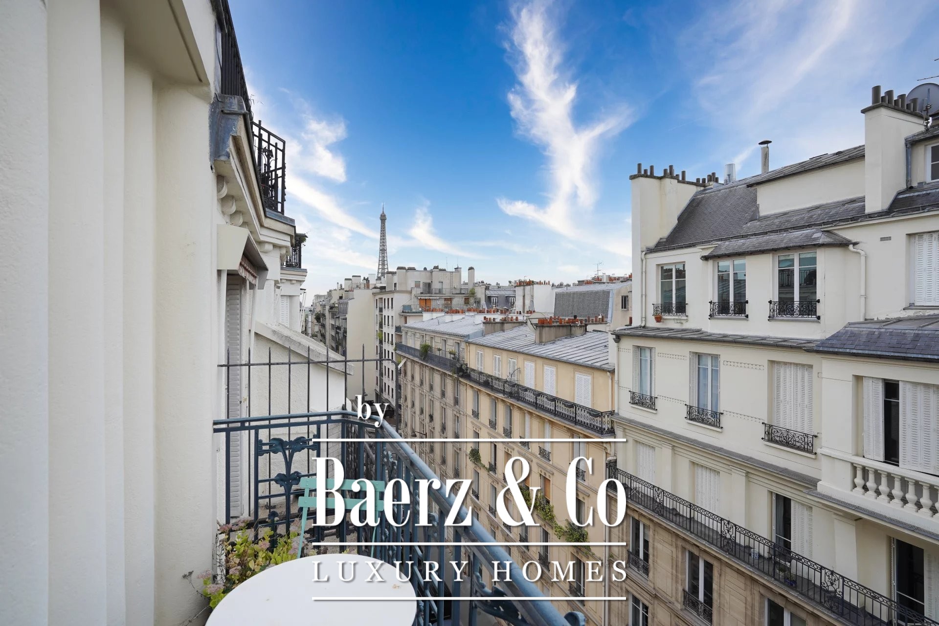 The dual North-West and South-West exposure provides abundant natural light to the apartment, with views of the Parisian rooftops and the Eiffel Tower from the multiple balconies.