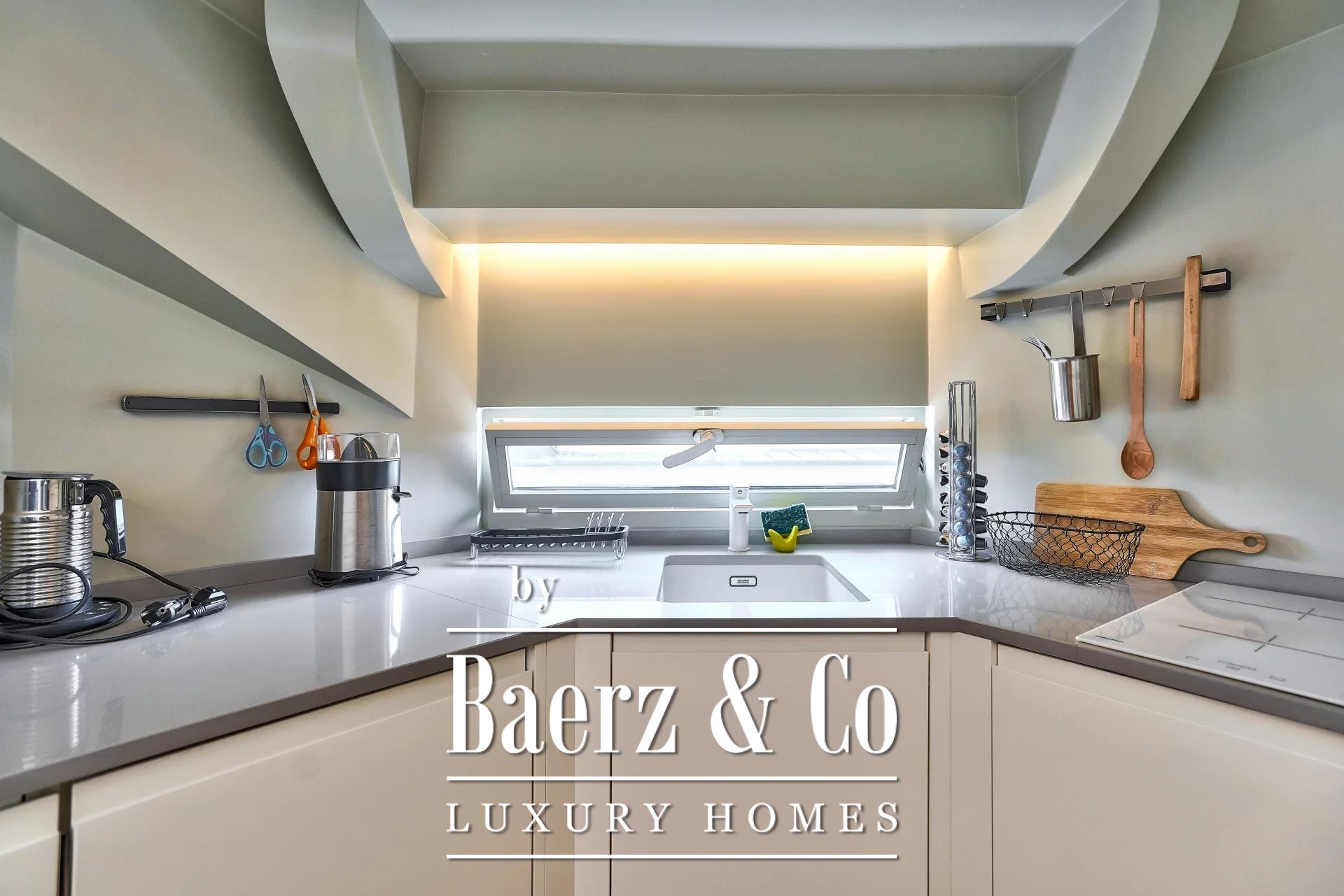 The apartment consists of an entrance leading to a well-designed, fully equipped kitchen, a spacious living room with high ceilings and direct access to a continuous balcony offering an unobstructed view to enjoy every sunset.
