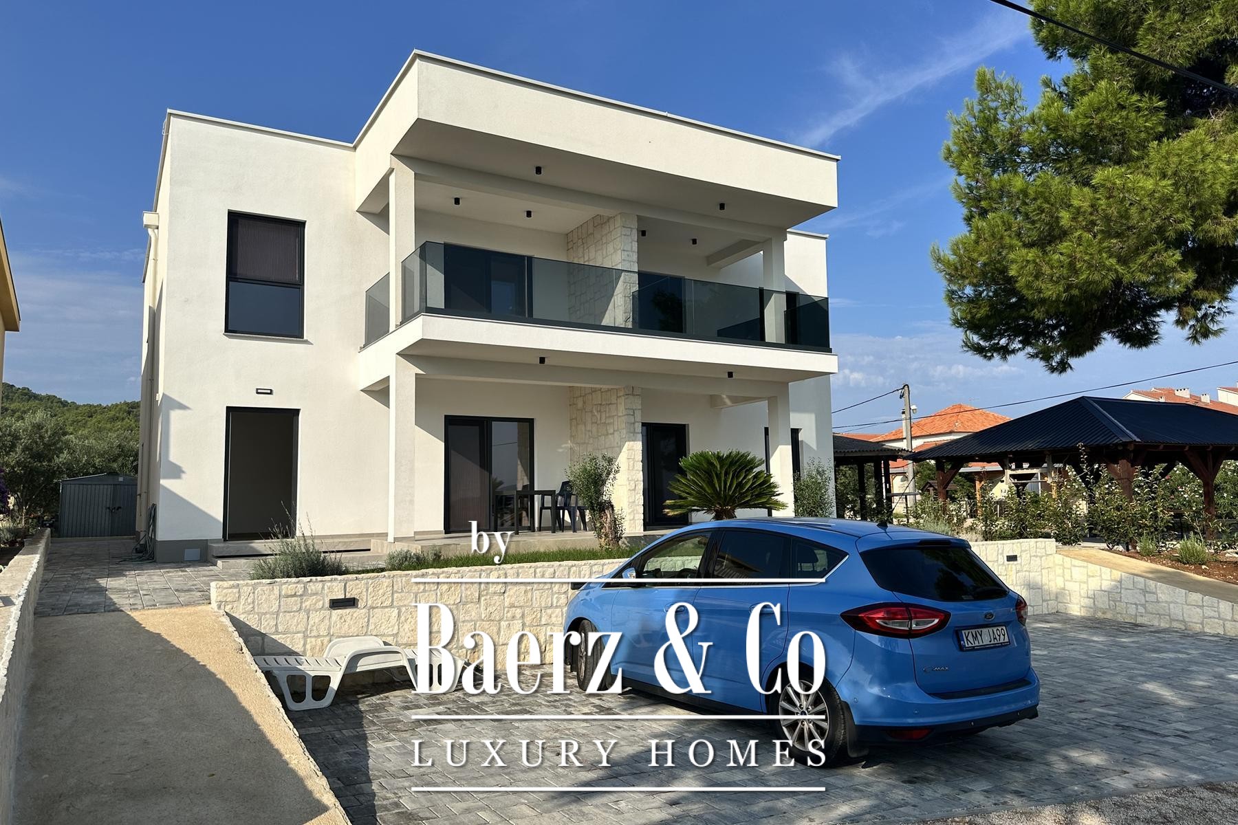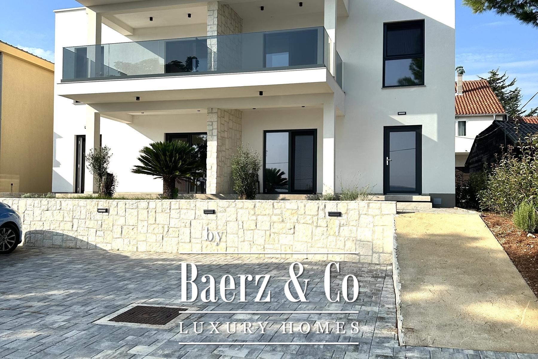 Townhouse Pašman Croatia presents a rare intersection of modern design and tranquillity, positioned in the first row to the sea on the quiet shores of Neviđane. This contemporary residence, shaped over 318 m² of living space, sits directly in front of a sandy beach and is oriented to maximize uninterrupted sea views throughout its interiors.