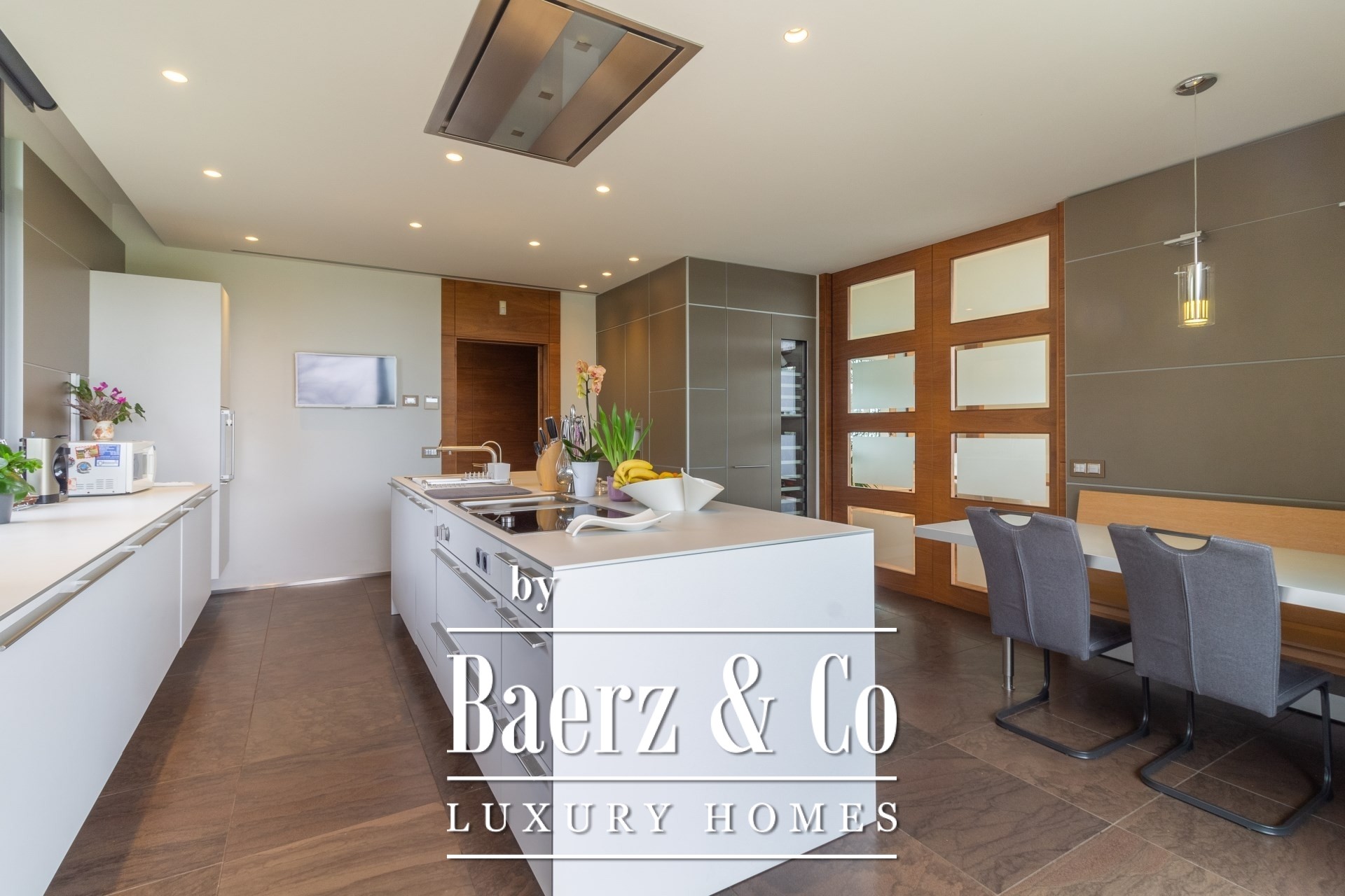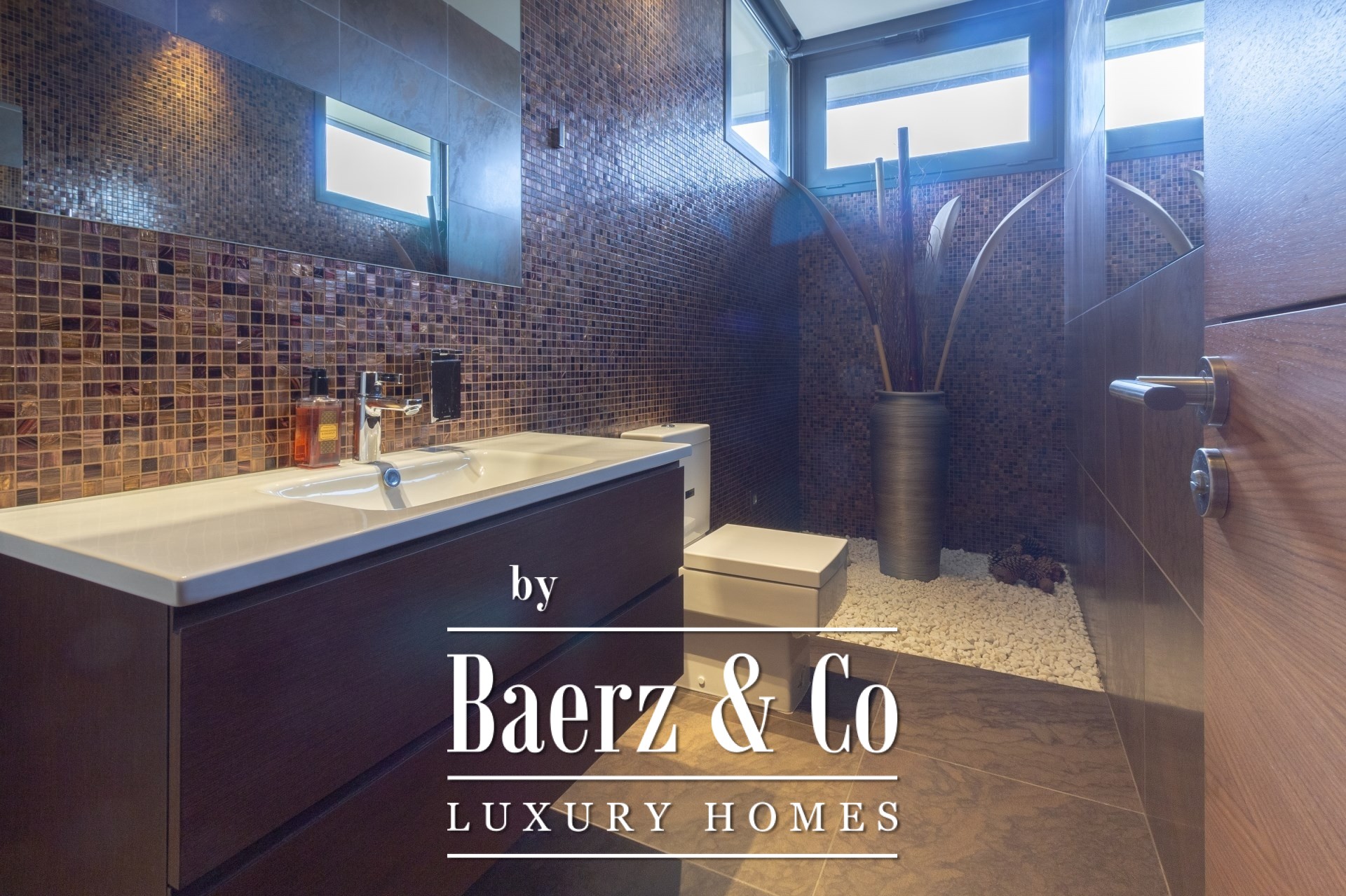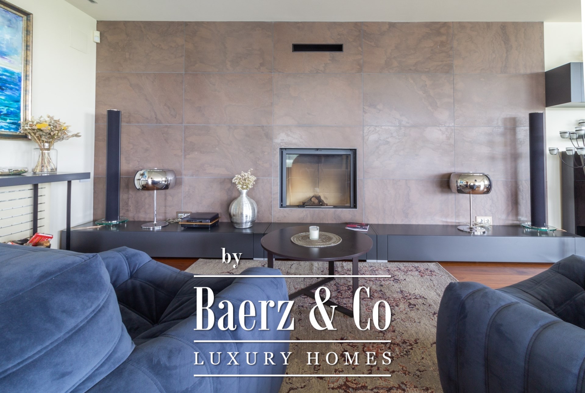Outdoors, mature gardens surround the pool with its waterfall feature, a barbecue and outdoor kitchen, and expansive chill-out spaces. Underfloor heating, ducted air conditioning, electric windows, integrated audio, complete surveillance, and an elevator underscore the emphasis on comfort and security.