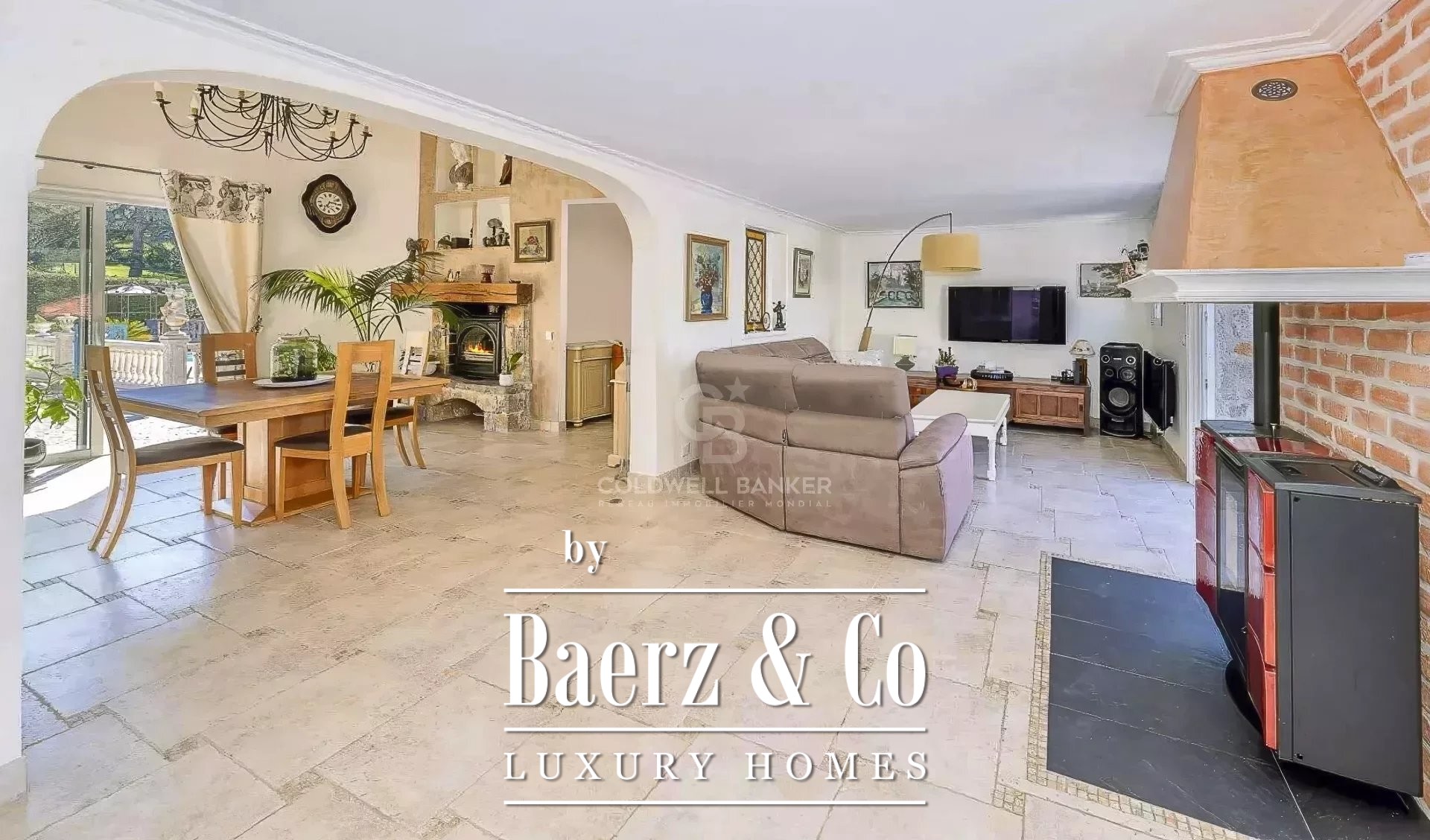 Villa Peymeinade with panoramic countryside views invites a serene lifestyle in one of the region’s most coveted residential enclaves. The property rests on a tranquil 1,380 m² plot, affording privacy and unimpeded vistas. This villa offers 185 m² of living space with a total surface area of 245 m², its architecture engaging both comfort and function. The entrance, marked by an automatic wrought-iron gate, opens onto a granite-paved esplanade accented by solar lighting. Outside, a 100 m² terrace serves as the social heart of the home, complete with a summer kitchen featuring a pizza oven, barbecue, and marble stone basin. The heated swimming pool, bordered by a 150 m² Lebanese marble beach, sets the tone for outdoor relaxation, enhanced by a solar shower, wrought-iron pergola, and gardens.