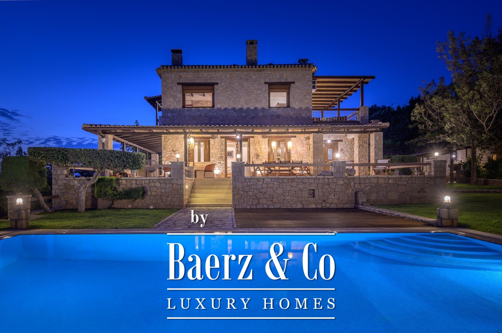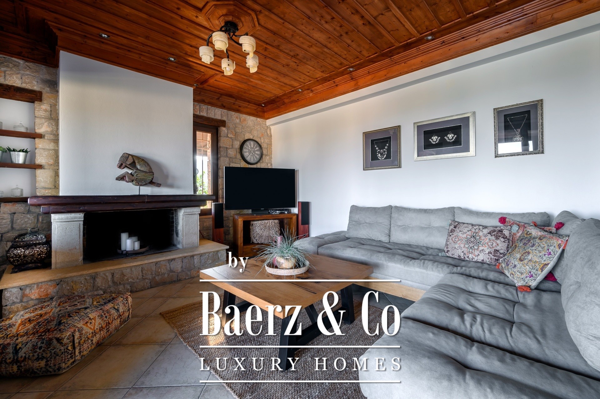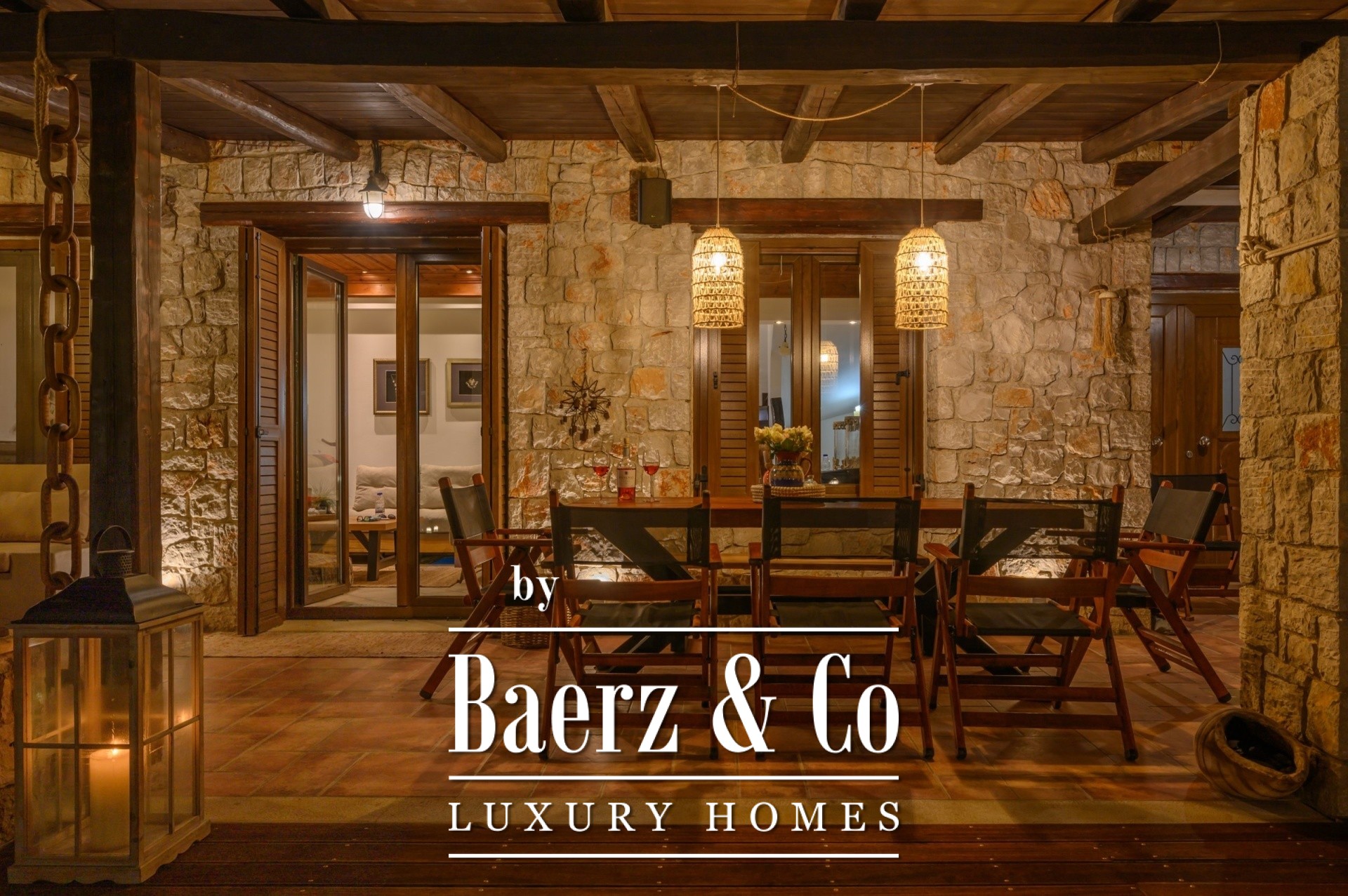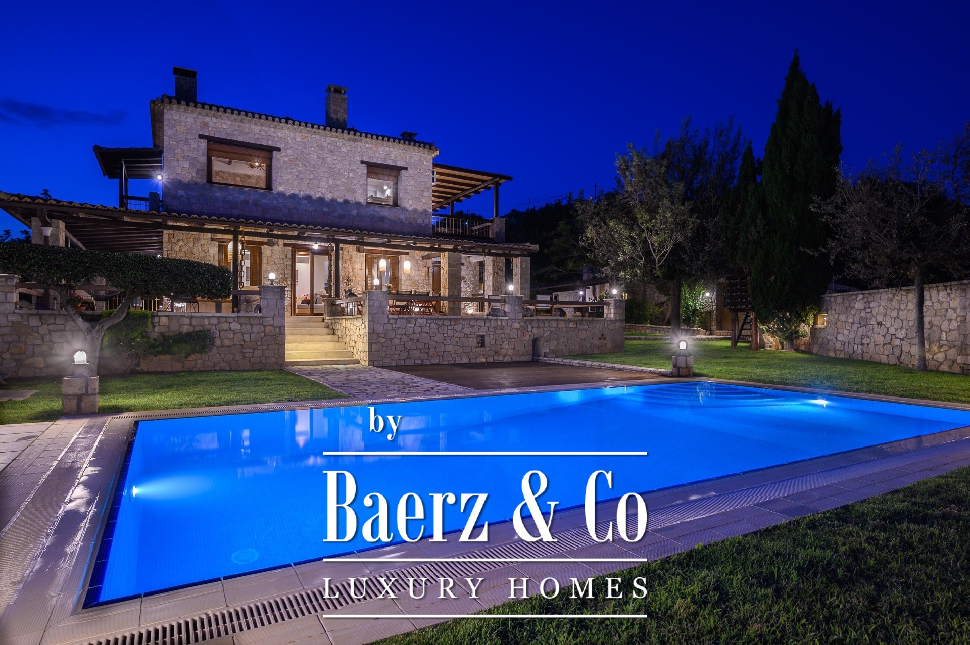Available from our office is a luxurious stone villa located in the wider area of Pylos. Made of high quality stone and wood, this wonderful villa extends over three levels with a total area of 260 sq.m. It is located in such a place where one can enjoy the wonderful view to the sea, experiencing moments of peace and relaxation. On the elevated ground floor there is a living room with a fireplace and views to the pool area, a separate kitchen and dining room, a bedroom and a bathroom.On the first floor there are two bedrooms, one of them with a fireplace and a dressing room, a bathroom and access to a spacious covered balcony. In the basement area we will find a self-contained studio with its own kitchen area and bathroom, the cellar,
