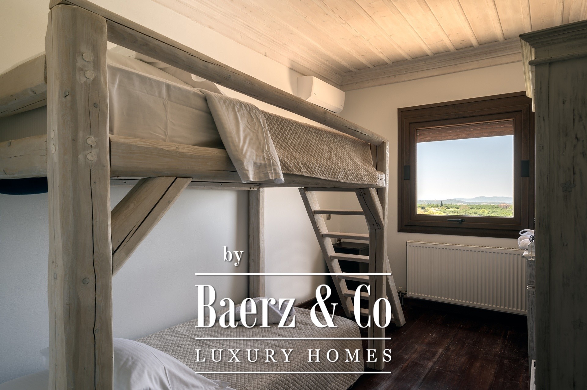 storage room - laundry room and an enclosed garage for two vehicles. Outside, the pool area stands out, which is surrounded by wooden decks and the beautifully landscaped garden and the covered BBQ area with a traditional wood-fired oven. The property has oil heating, air conditioning units for cooling, quality wooden shutters with double glazing, alarm, the internal staircase is made of iroko wood, the floors of the floor are made of oak wood and it is worth noting that the property will be delivered fully furnished and equipped. The property is suitable for permanent or holiday residence, as well as for exploitation due to its ideal location, close to the golf courses and numerous archaeological sites and unique attractions.