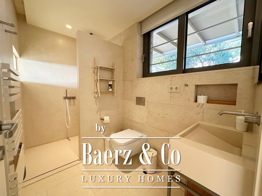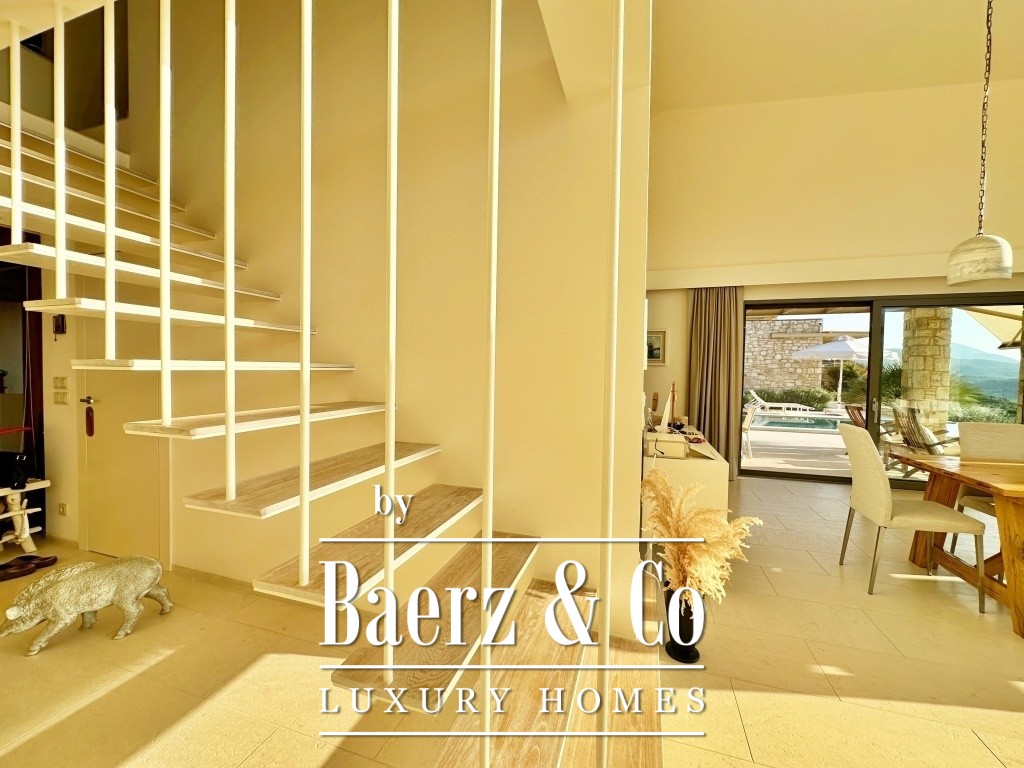 terrace overlooking the landscape - The residence has an inverter heat pump and cooling and heating system (DAIKIN) with in-wall integrated fan coils in all rooms and under floor heating in the master house and partially in the basement. **Second House-Guest House:** - Bright and spacious living room and kitchen in an open plan layout. - Fully equipped kitchen with integrated appliances - 2 Bedrooms with unique decoration and en-suite bathroom. - Separate walk-in closet - Private terrace with garden view and direct access to the pool. The villa has a panoramic swimming pool surrounded by beautiful gardens, creating an idyllic space for relaxation and entertainment. The main features include: - Alarm system with 7 surveillance video cameras controlled via mobile phone - Air conditioning - Custom made barbeque with worktop -All over iron pergolas some with rooftop cover -Outdoor shower (cold and hot water) - Private parking - storage room -motorized sliding metal entrance gate -Solar panels system for hot water, tank 750 liters -4 drinking water reservoirs each of 1500 liters -Automatic garden irrigation system with rain water reservoir - Easy access to beaches, restaurants and shops Your opportunity to own an elegant and luxurious retreat in the beautiful area of Gialova. For more information or to arrange a viewing, contact us today.