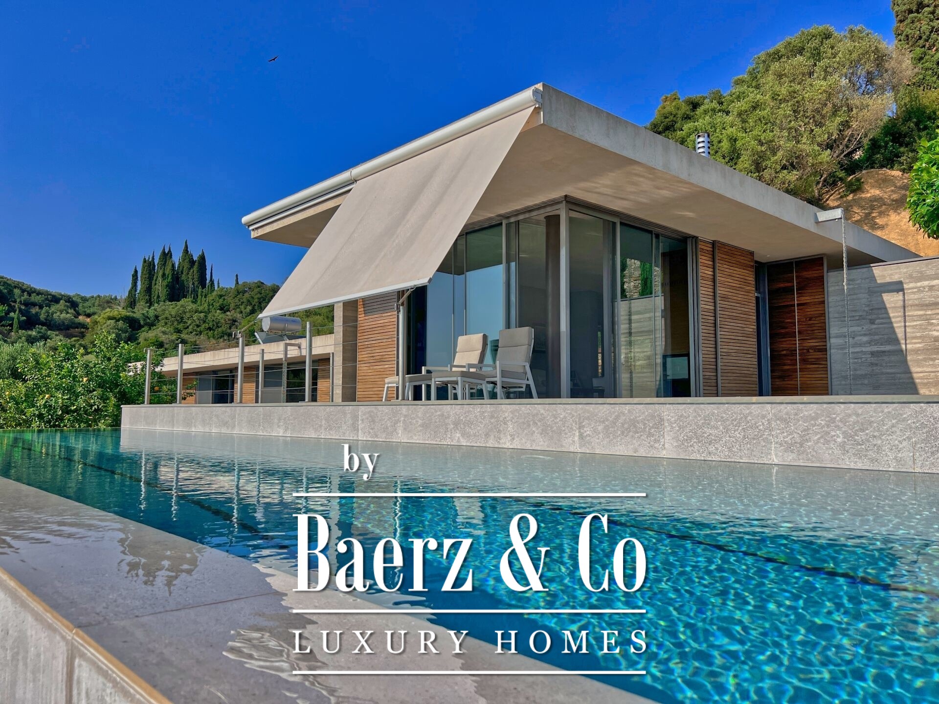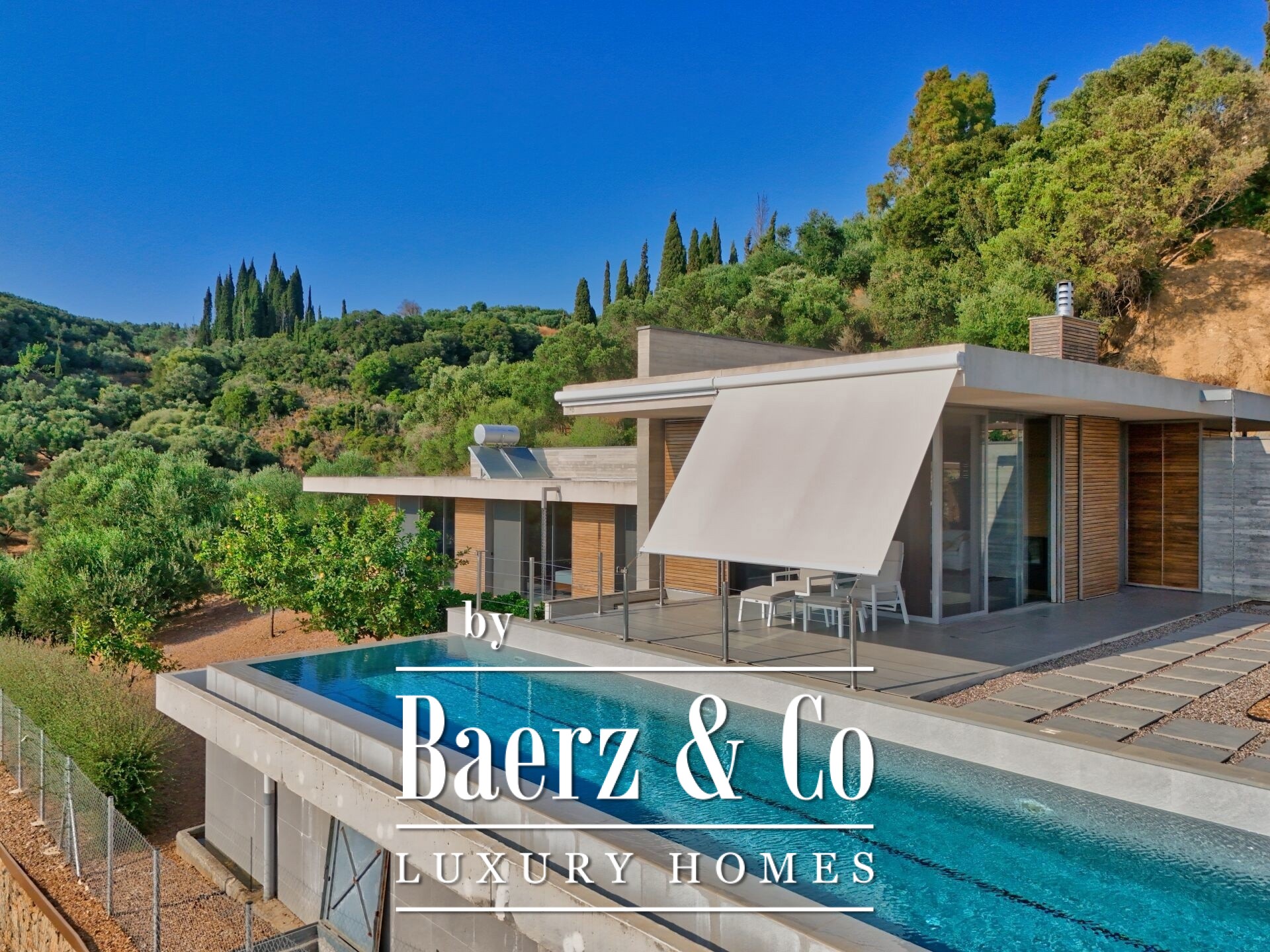 The infinity pool, measuring an impressive 3 by 25 meters, serves not only as a stunning architectural centerpiece but also as a fully functional lap pool for dynamic swimming and exercise. Adjacent to the fully equipped kitchen, a beautiful outdoor BBQ area has been created, featuring weathered steel elements — the perfect setting for hosting guests and enjoying unforgettable moments against the backdrop of Ionian sunsets.