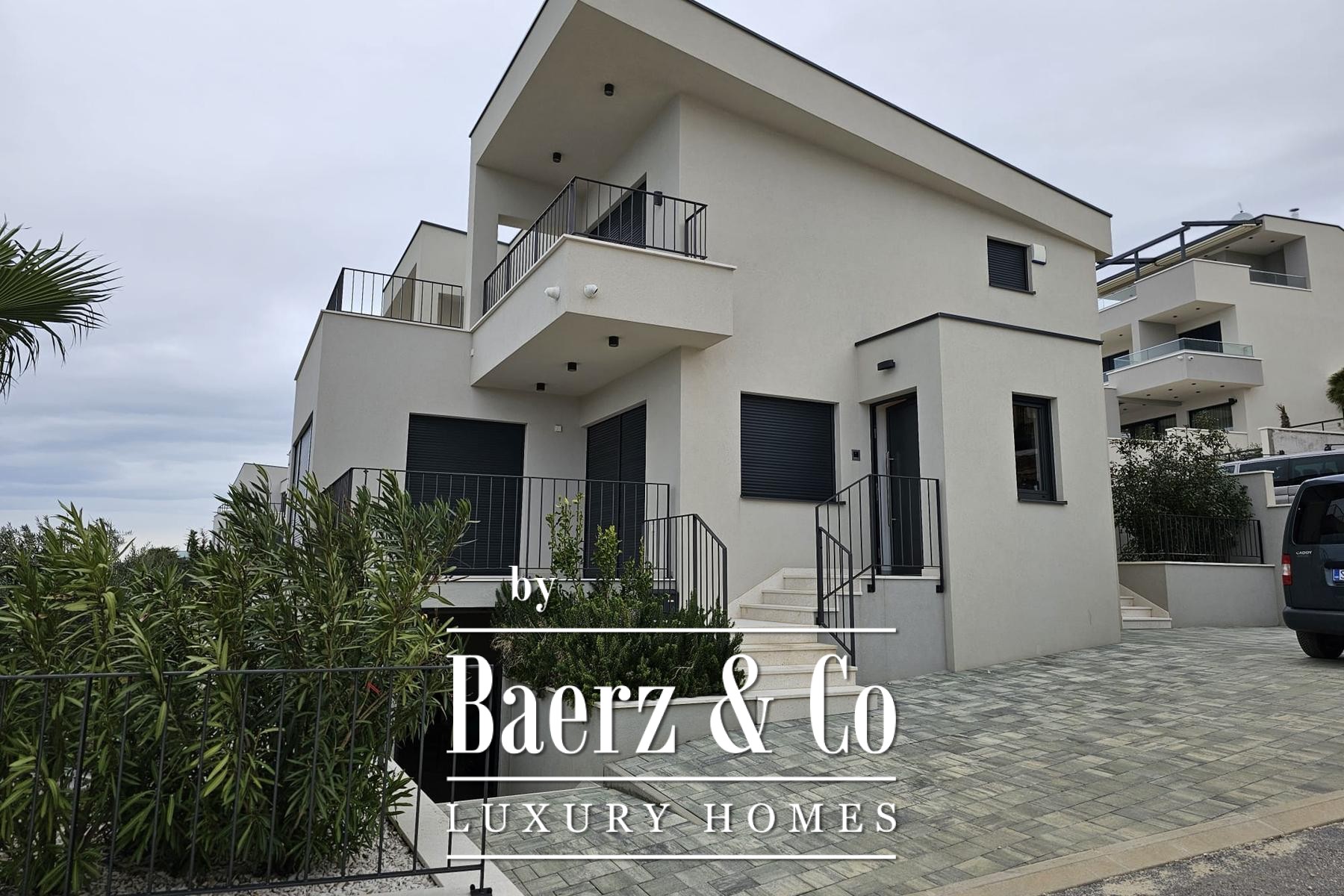 Townhouse Podstrana offers a refined modern residence distinguished by panoramic views across the Adriatic. This recently built villa presents 180 m² of living space on a 507 m² plot, just 400 metres from the shore. The architecture uses clean lines and high-quality materials, featuring anthracite aluminium windows with triple-layered glass, natural stone inside and out, and automated shutters that manage both light and privacy with subtle precision.