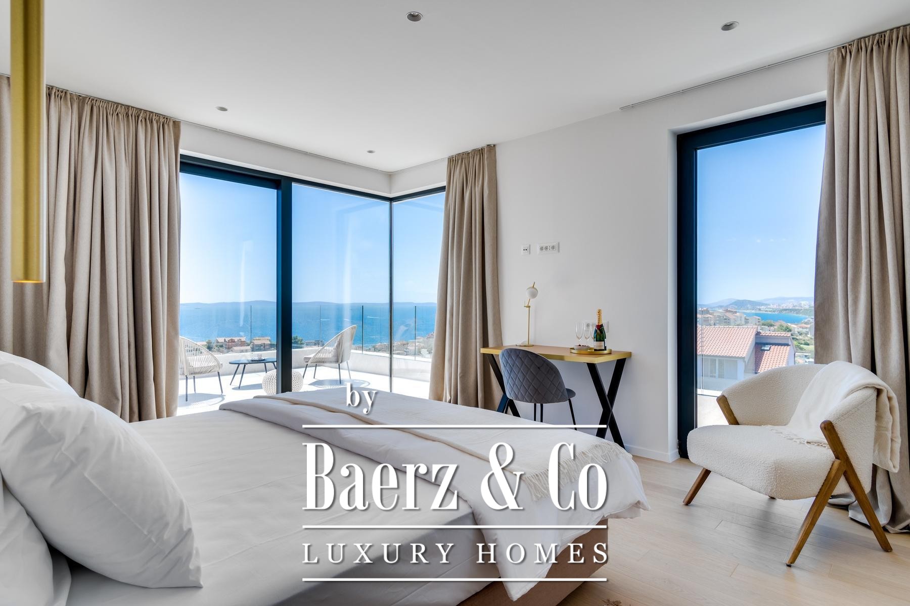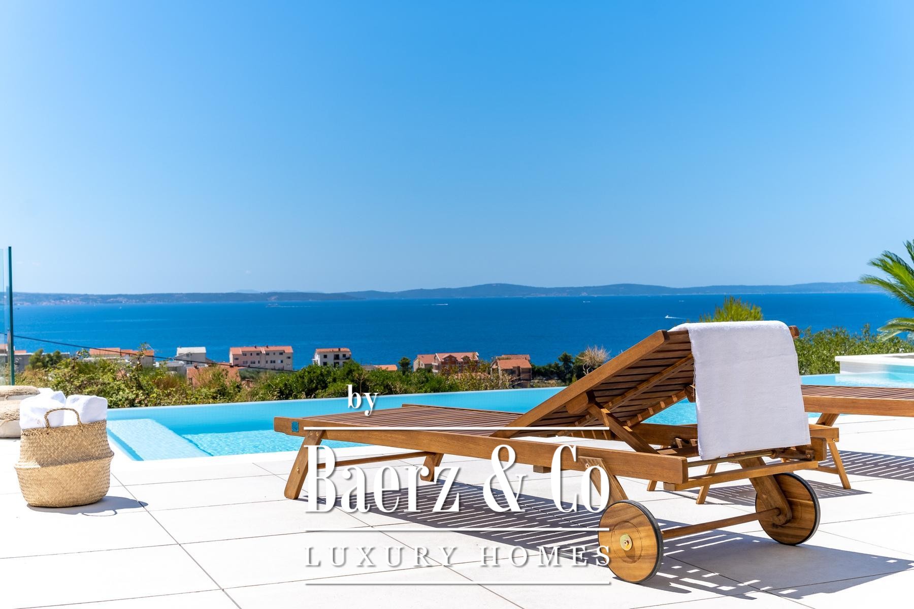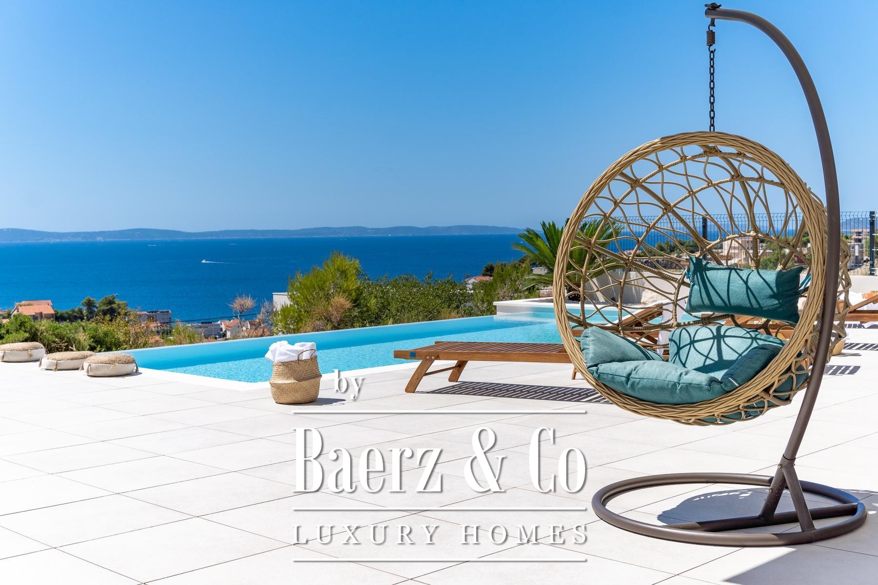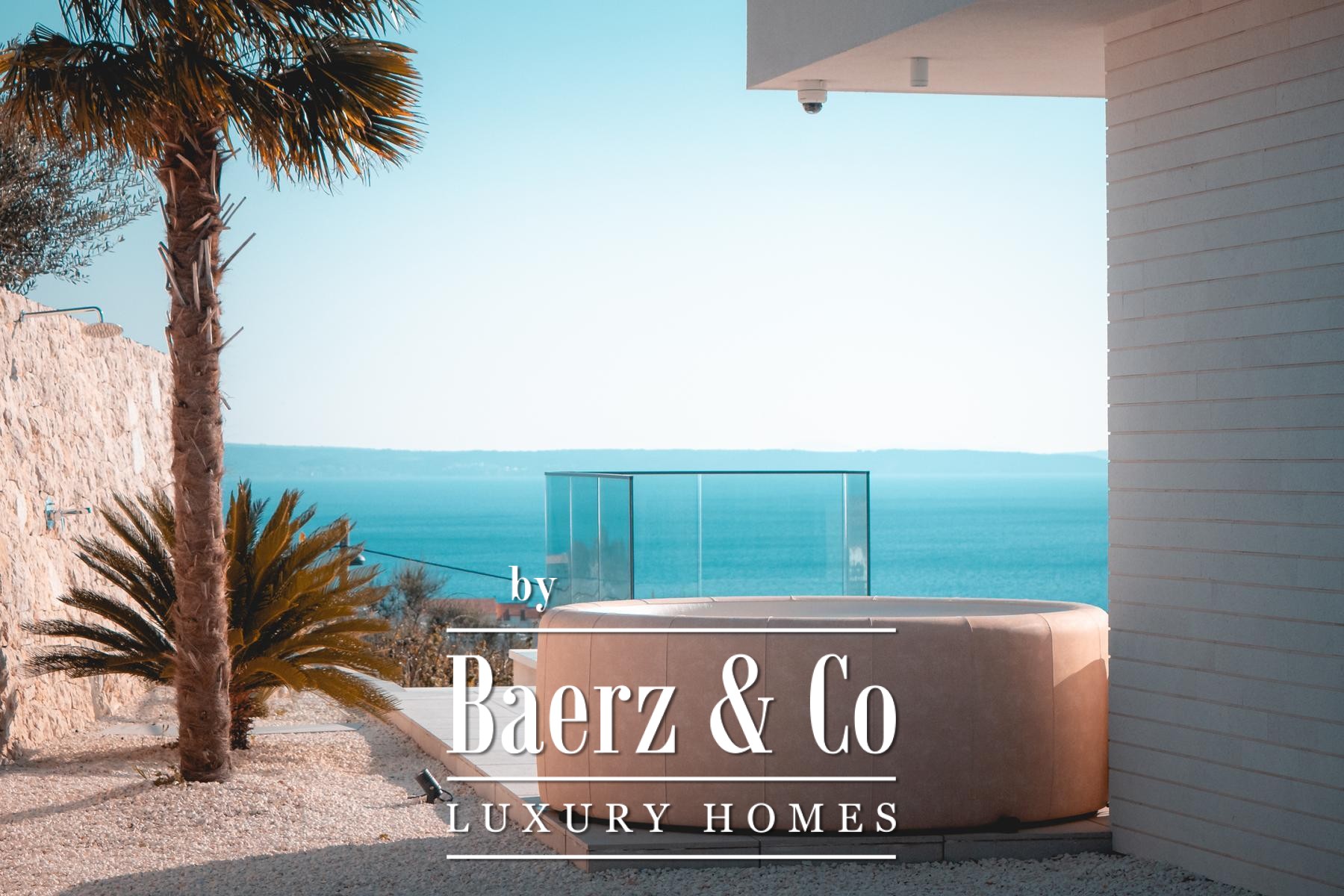 Upstairs, three bedrooms with en-suite bathrooms offer sanctuary, two enjoying terraces with open sea views. The uppermost floor is reserved for the master suite: a private terrace, a tranquil bathing space, and uninterrupted panoramas. High-quality finishes, private parking, and thoughtful outdoor spaces distinguish the property, while its location places daily essentials within a short walk, completing an atmosphere of understated luxury. The villa in Podstrana is defined by clarity of design and a strong sense of place.
