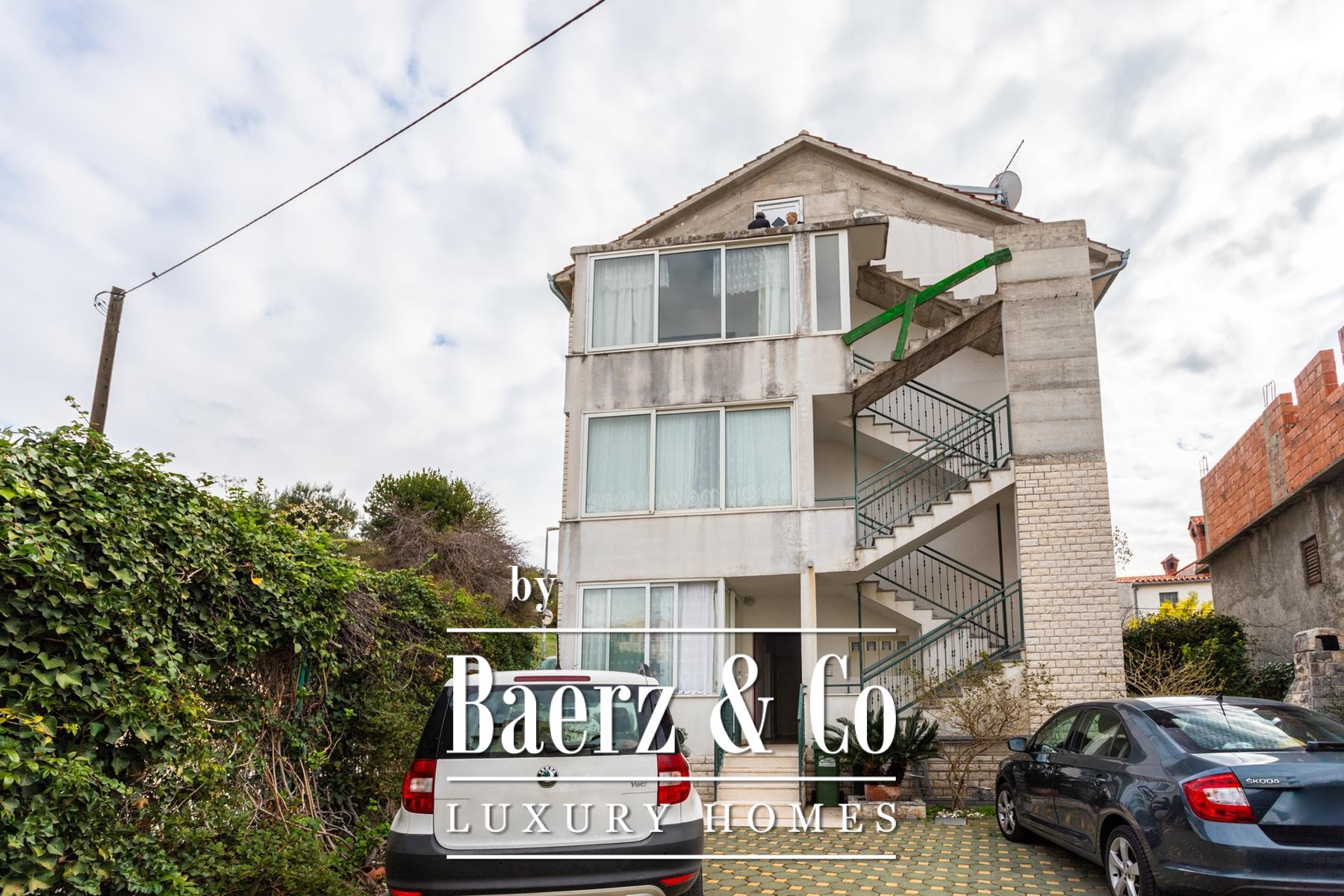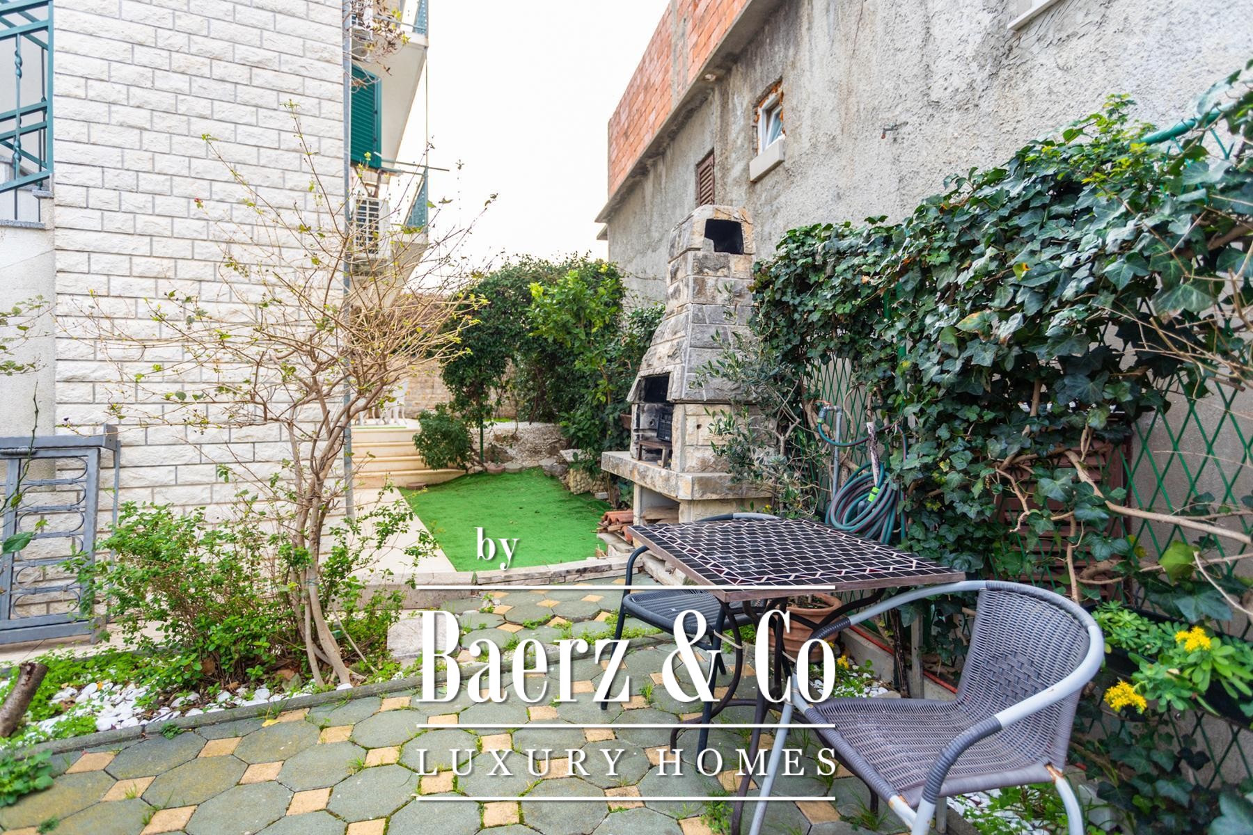 A further 70 m² attic space, featuring a 7 m² south-facing balcony, remains unfinished and offers a vantage that frames an elegant view of the island of Brač. Across the property’s 340 m² of internal area and 307 m² plot, the layout is structured for flexible multi-generational living or discreet investment potential. Each apartment is matched with its own rhythm of light and privacy, while the generous courtyard easily accommodates four cars.