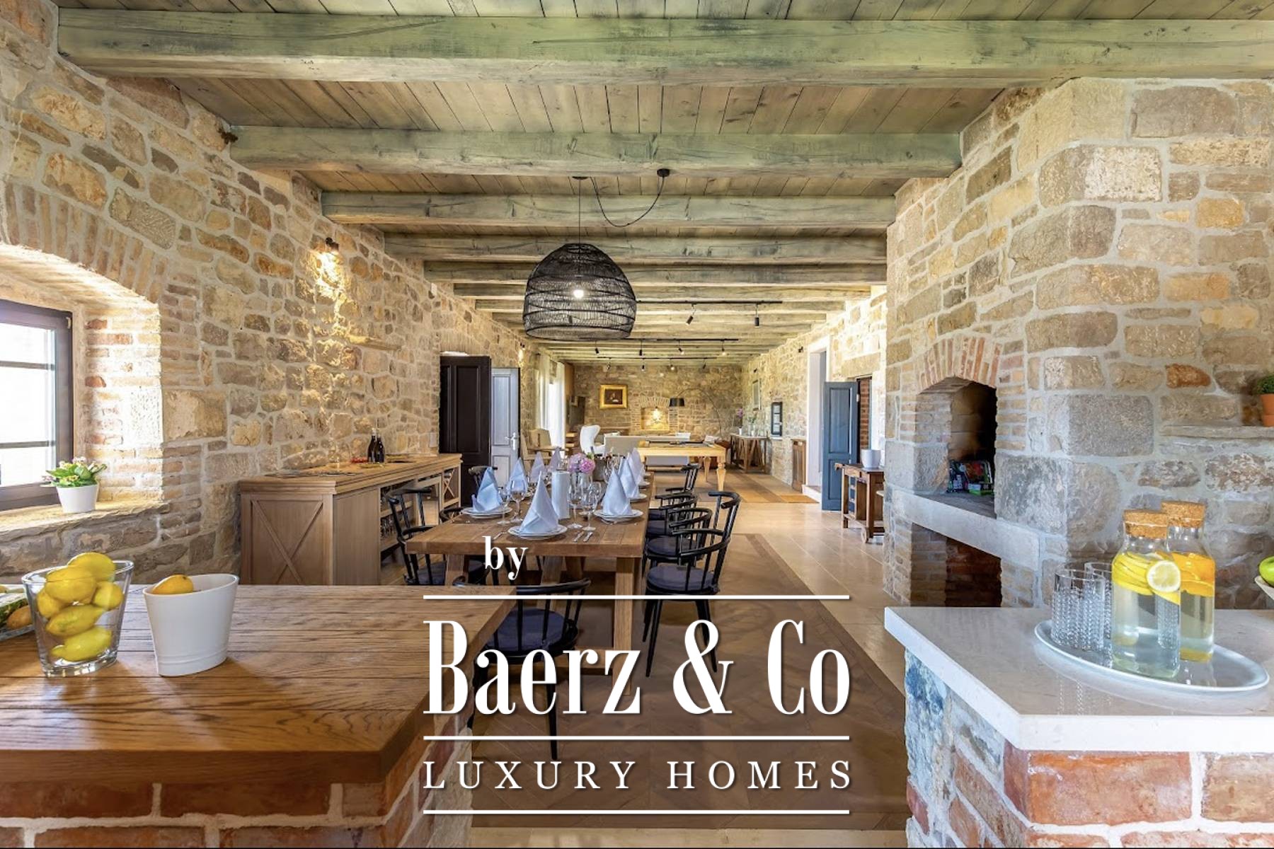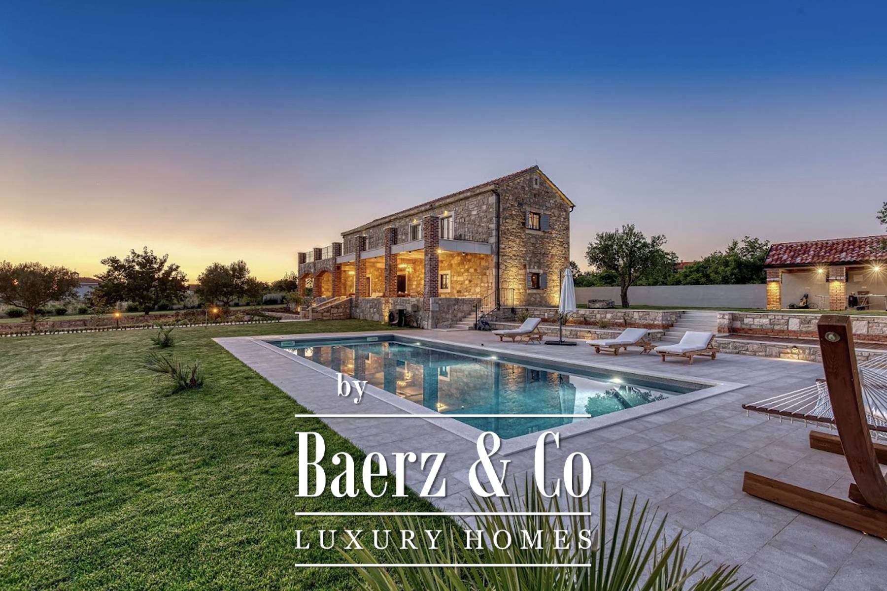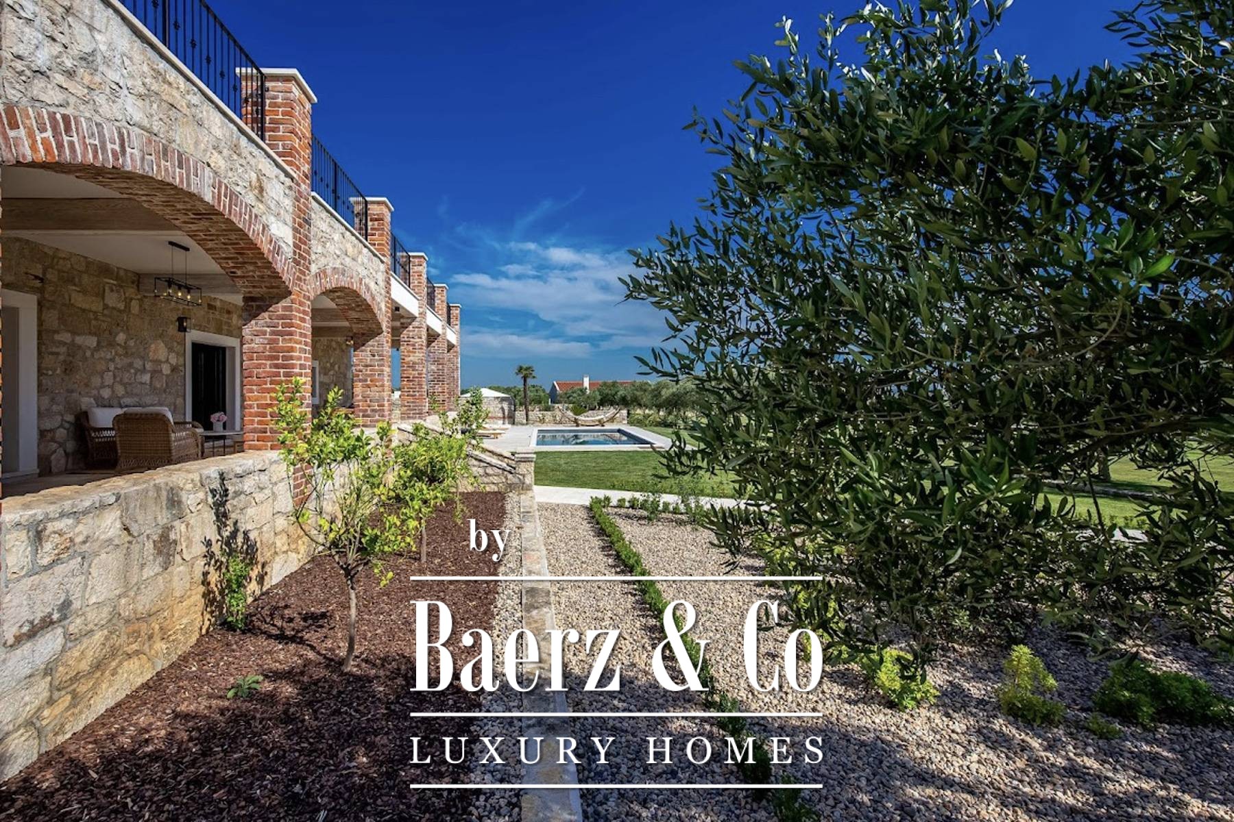 Stone villa Poličnik Zadar stands as a rare expression of Mediterranean architecture, set within a generous 7,800 m² garden distinguished by mature olive and palm trees. This villa, offering 360 m² of living space and five bedrooms across two floors, seamlessly blends rustic Dalmatian character with modern minimalism, resulting in a refined and inviting environment.