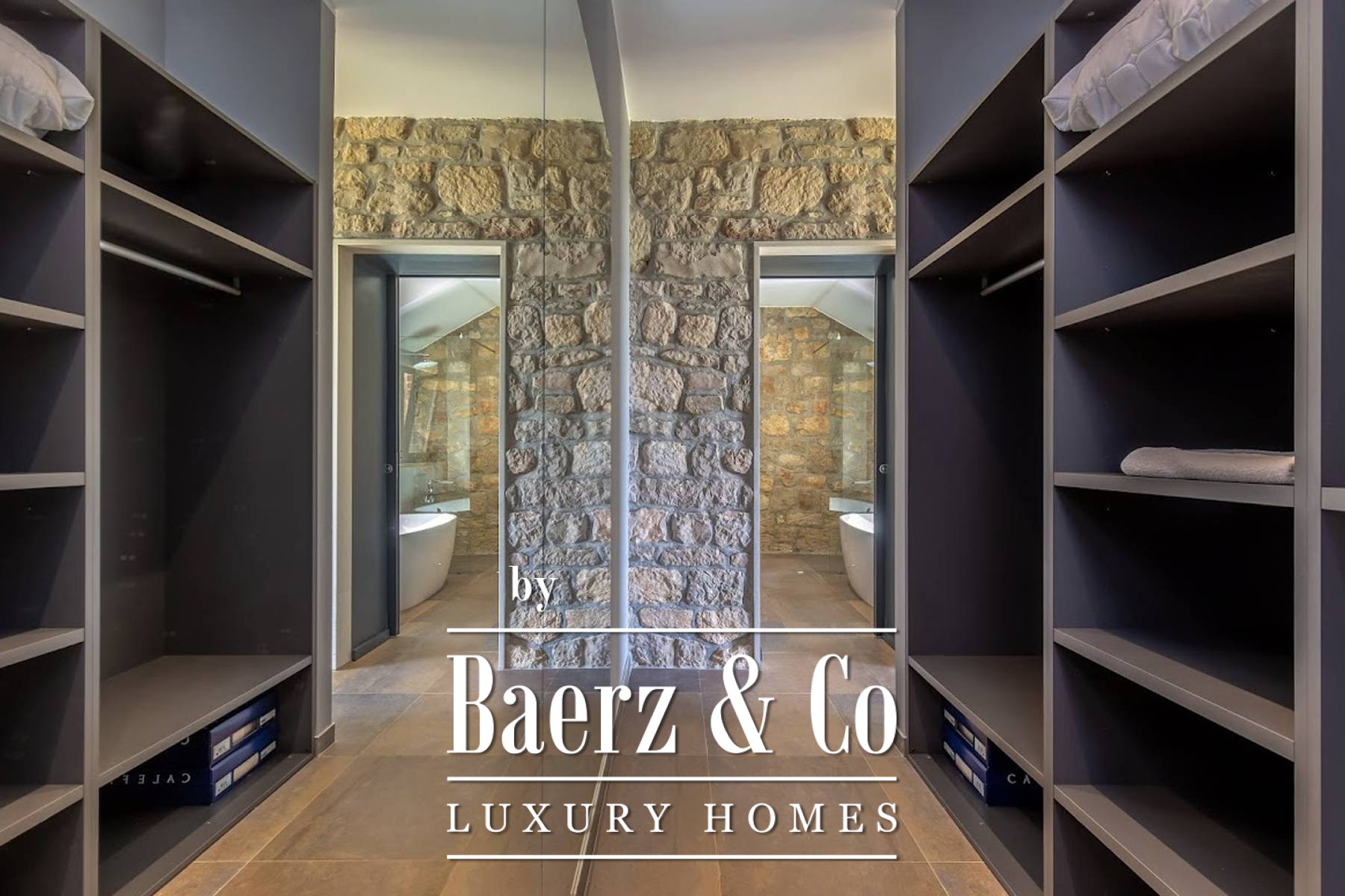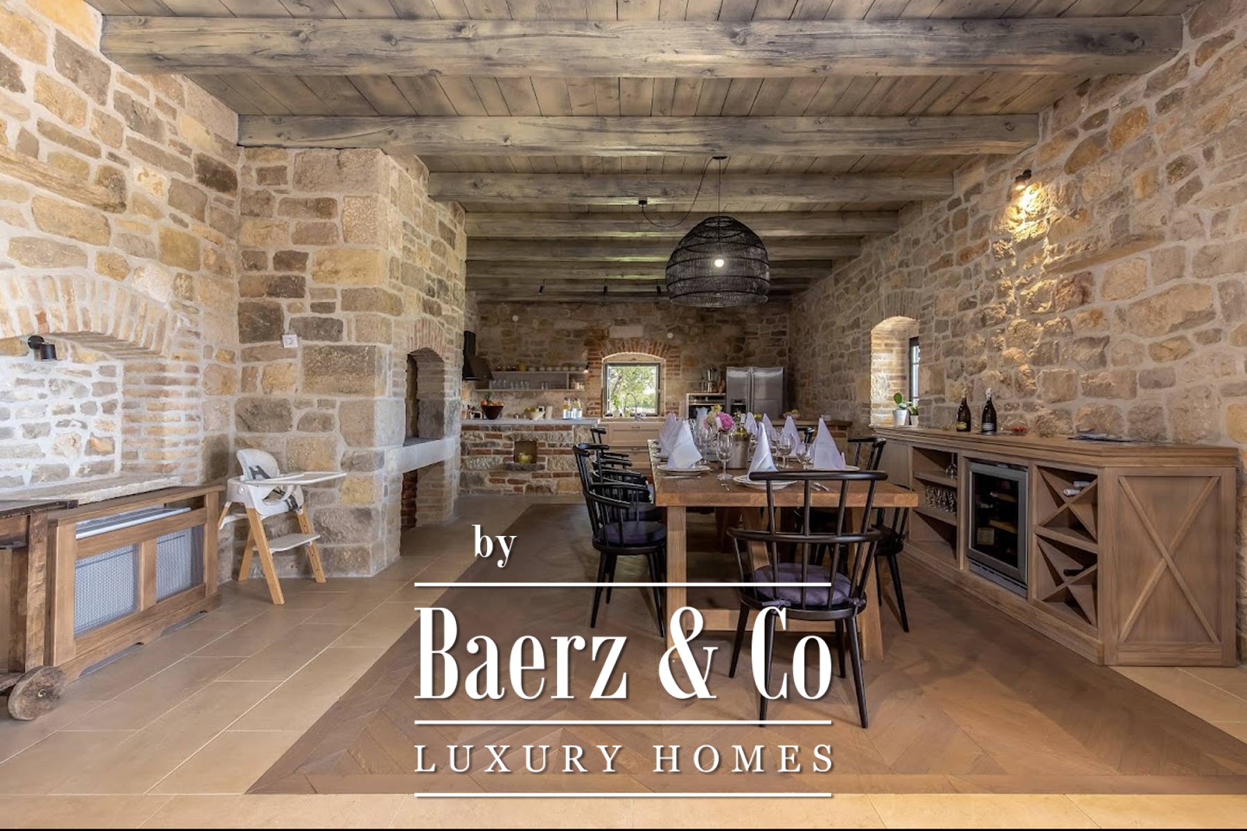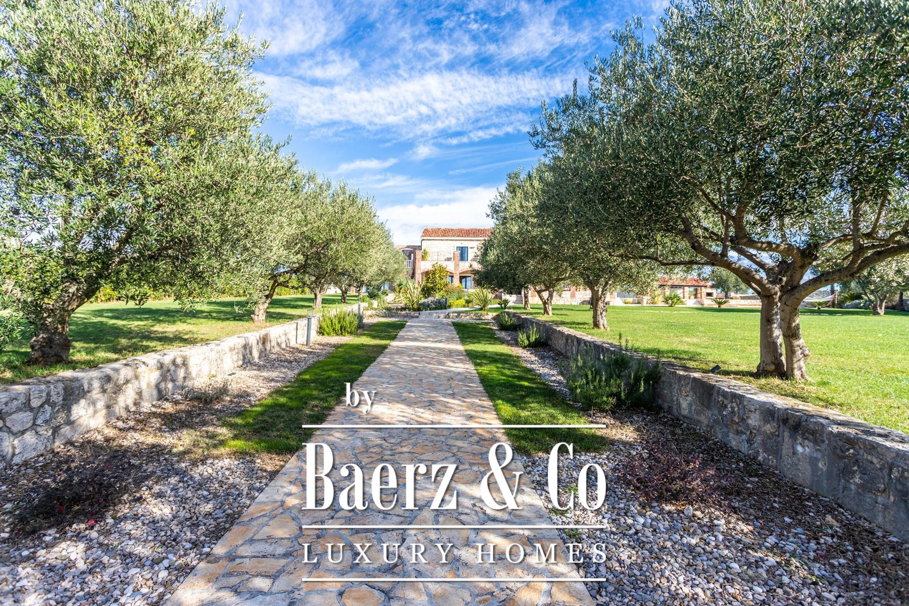 Stone villa Poličnik Zadar stands as a rare expression of Mediterranean architecture, set within a generous 7,800 m² garden distinguished by mature olive and palm trees. This villa, offering 360 m² of living space and five bedrooms across two floors, seamlessly blends rustic Dalmatian character with modern minimalism, resulting in a refined and inviting environment.