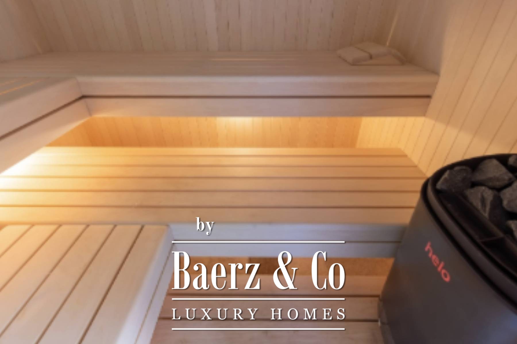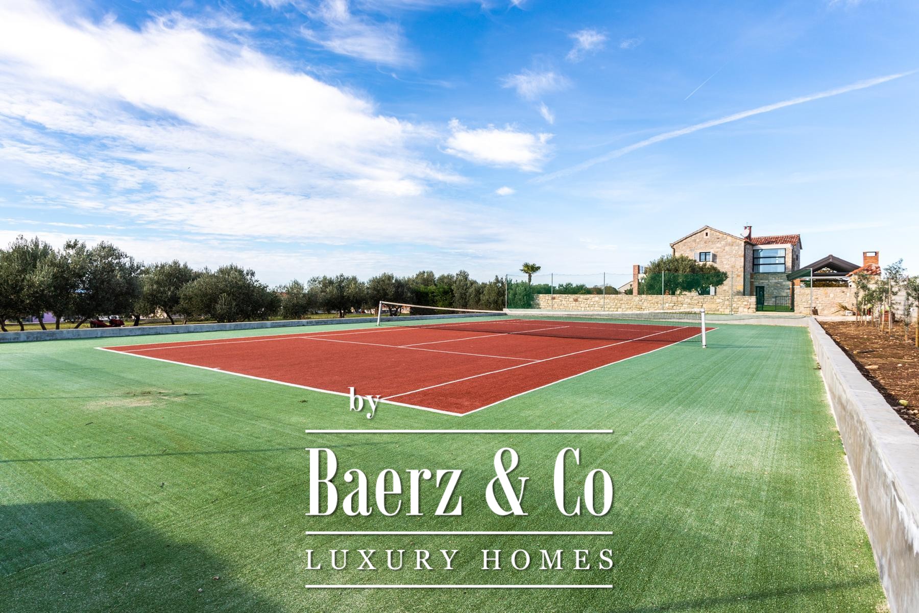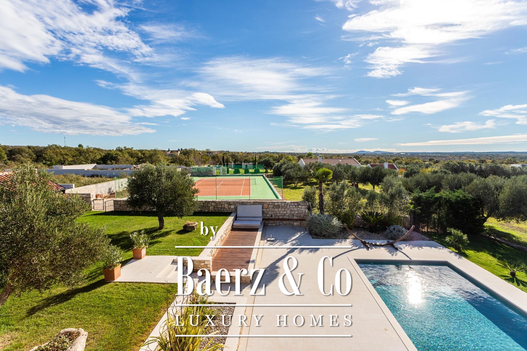 The landscaped grounds are defined by a private tennis court, a heated swimming pool with a spacious sunbathing area, and shaded spaces for relaxation. A dedicated barbeque area, sauna, gym, and covered table tennis table complete the setting, while a private orientation and the expansive lawns secure a sense of discretion and tranquility.