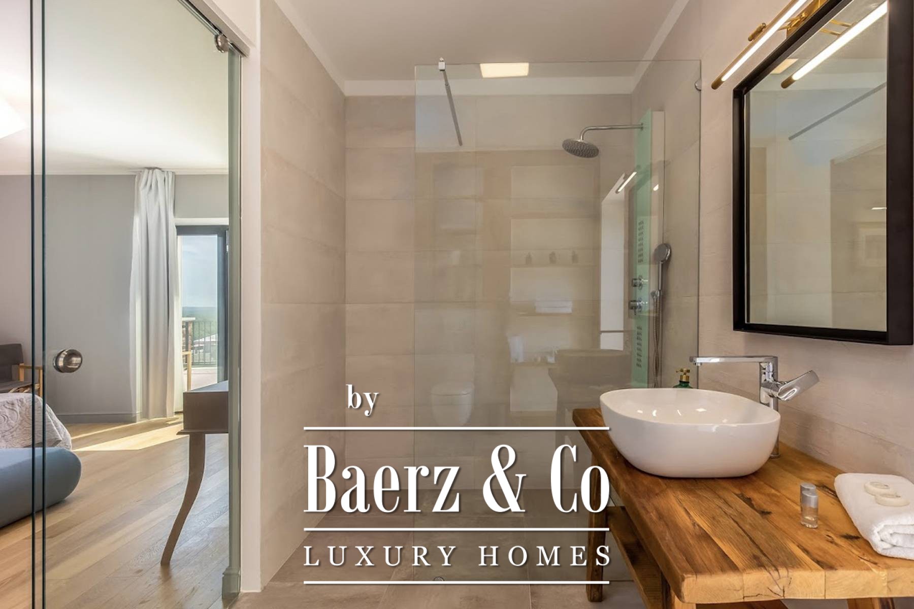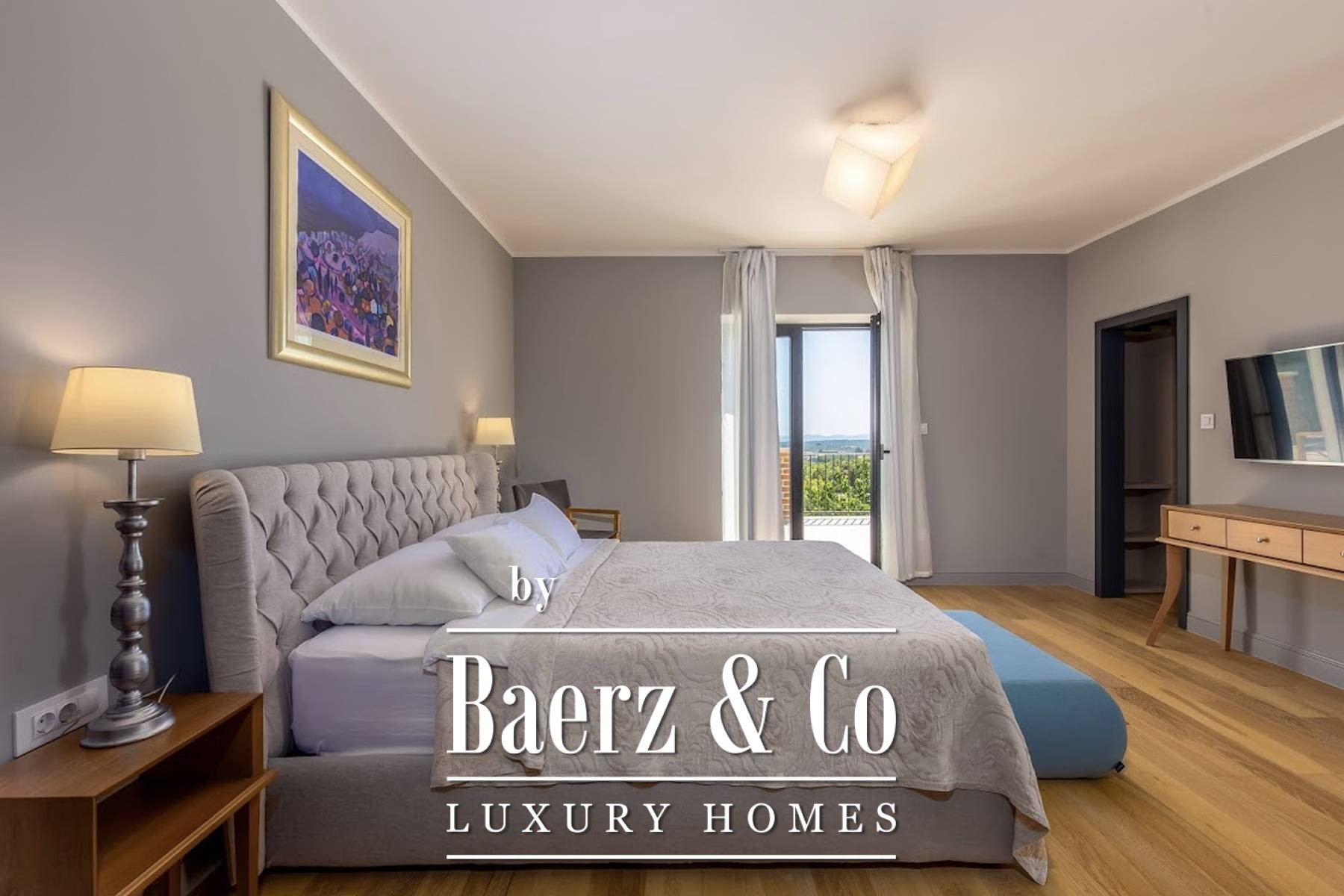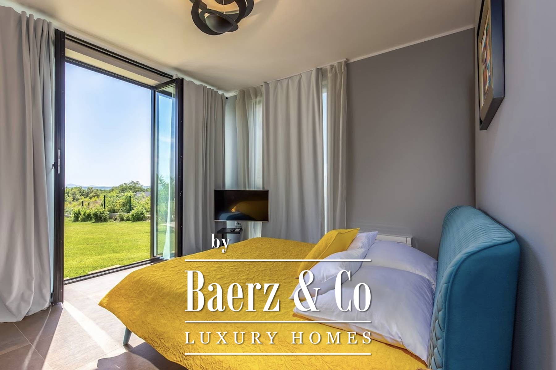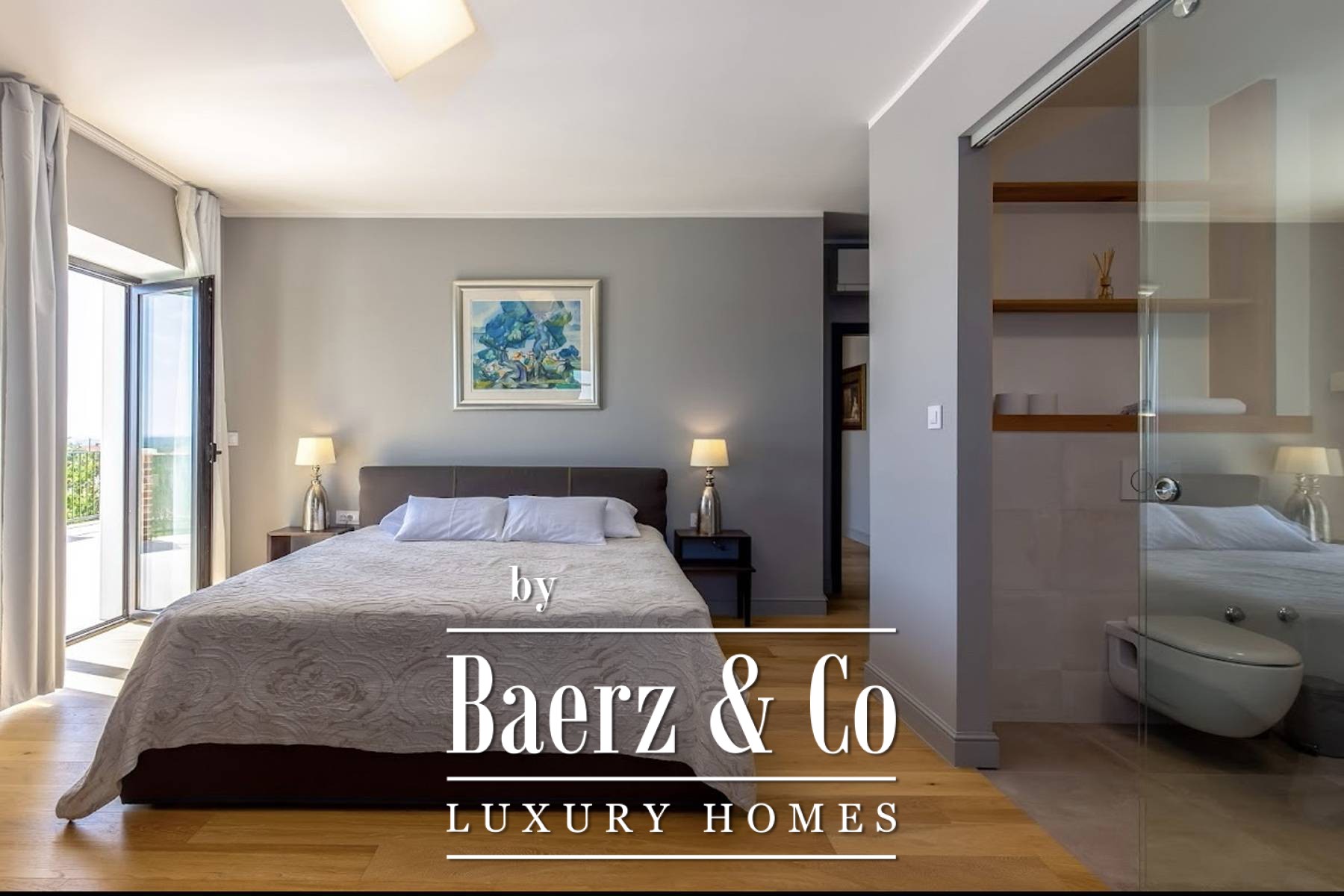 The ground floor welcomes with a fully appointed kitchen, open dining and living areas, a billiard space, and direct access to the garden. A guest bedroom with private terrace access and wardrobe, along with practical amenities such as storage and laundry, add to the functional design. Upstairs, four bedrooms open to a generous terrace, and the two primary suites offer en suite bathrooms, ensuring comfort and privacy for residents and guests alike. Large windows invite views of the garden and the Dalmatian sky.