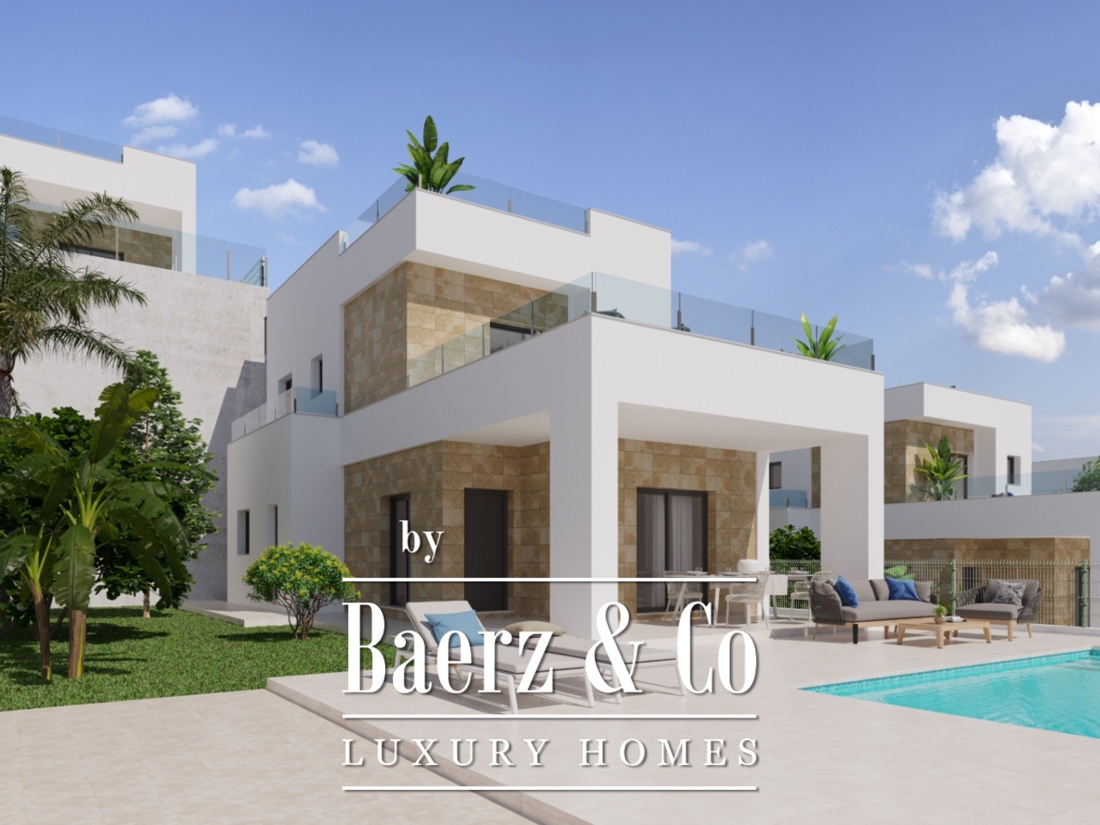 The villas include a spacious living-dining room with large windows that allow direct access to the terrace, a modern kitchen equipped with quartz countertops and high-end furniture, 3 spacious bedrooms with built-in wardrobes, lined and with drawers, and 3 elegant bathrooms equipped with furniture, mirrors with lighting and designer taps. The floors are made of large-format porcelain and the finishes are of high quality.
