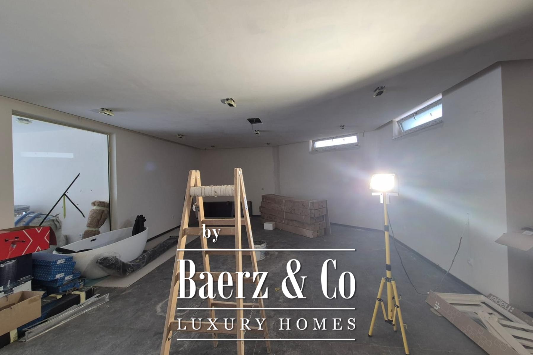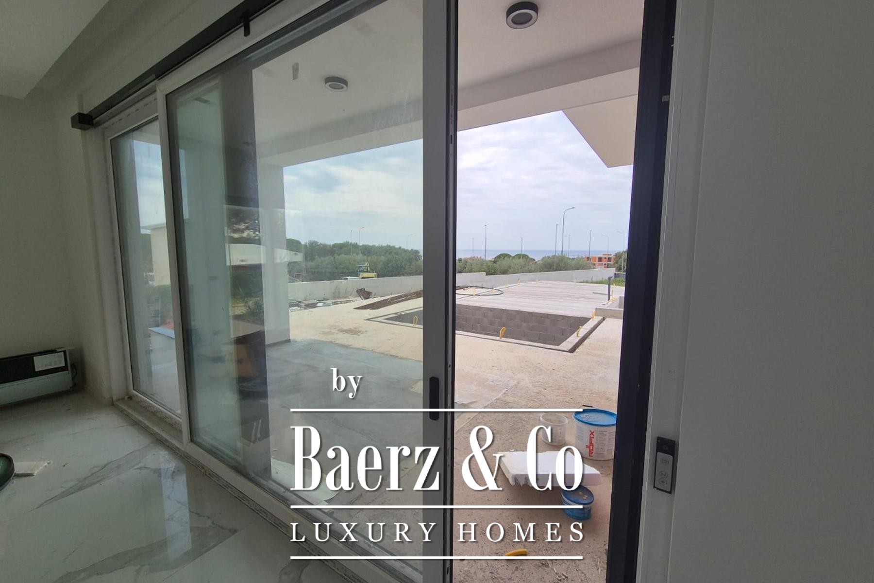 The ground floor welcomes you with an entrance hall, where an open living room, dining space, and kitchen unfold in a seamless flow. Floor-to-ceiling Schuco sliding glass walls line the perimeter, introducing gentle natural light and connecting the interior to the outdoor terrace where a heated pool, jacuzzi, and a summer kitchen set the tone for relaxed gatherings.