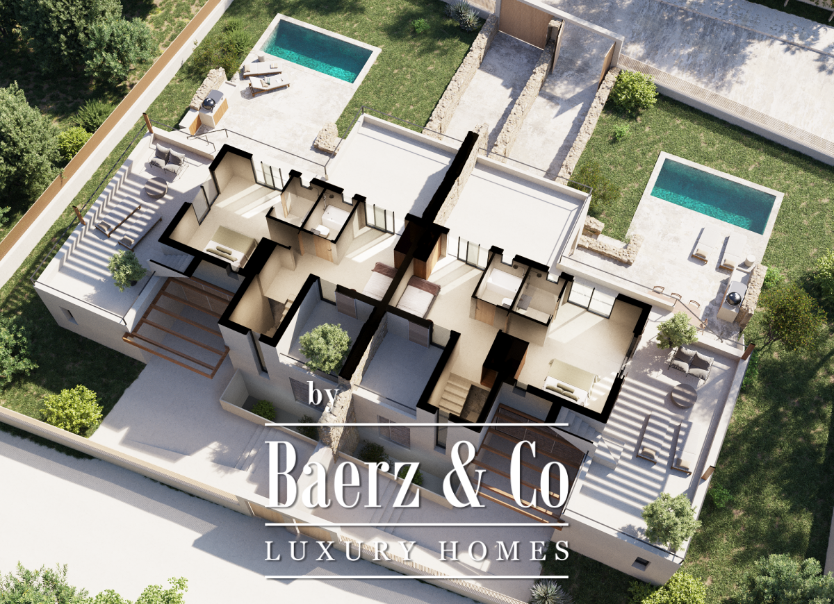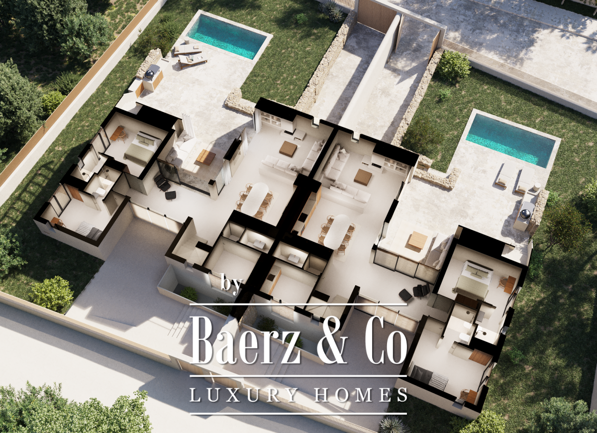 Villa Port d'es Torrent invites you into a private haven where Balearic charm meets contemporary lines, with the Mediterranean just a short walk away. Each villa, part of an intimate semi-detached development in a serene residential pocket, stands on its own within a 500 m² plot and offers a generous 300 m² of refined living space. The villa Port d'es Torrent presents four en-suite bedrooms and four bathrooms, set across two light-filled floors. An open-plan layout enhances spatial flow, bringing together the living, dining, and modern L-shaped kitchen with natural wood accents, all seamlessly connected to the garden through expansive windows.
