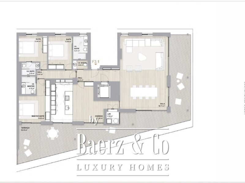 The separation to the bedroom area is made by a corridor that distributes the 3 suites. The master suite also has access to the terrace.