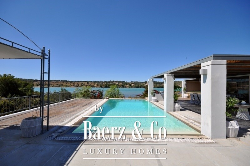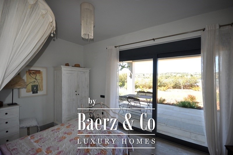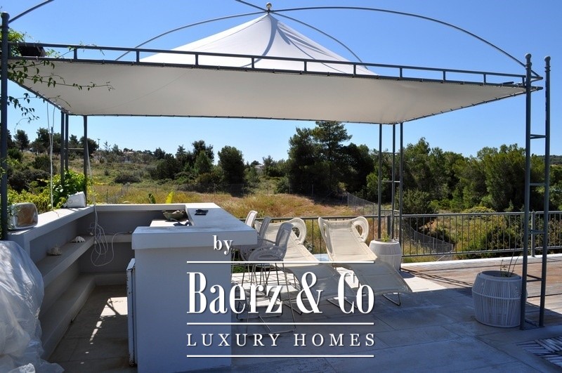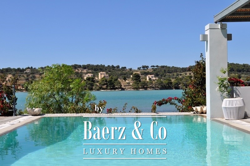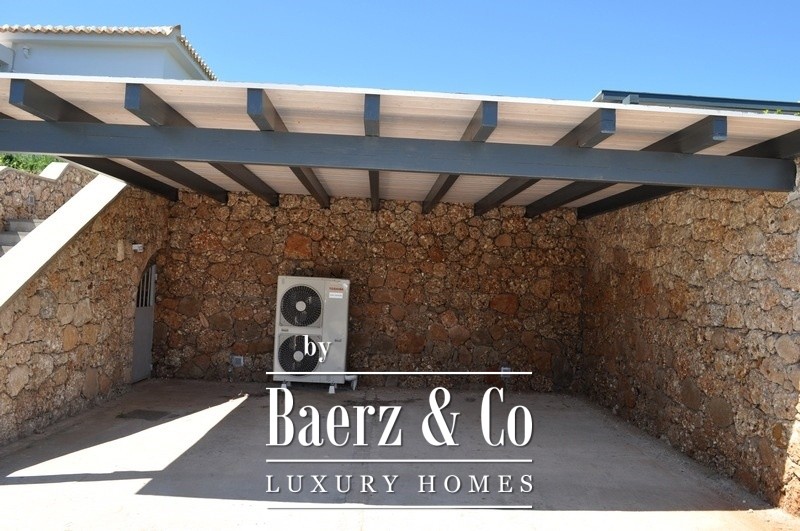 by a stone wall of traditional architecture and has a swimming pool with a nice view of the sea and also an outdoor pergola. There is also available an exterior parking area with a pergola and a direct vehicle access to it. In terms of location, this dreamy house is just 5 minutes from the port and the marina, 200km from the airport and 180 km from Athens.