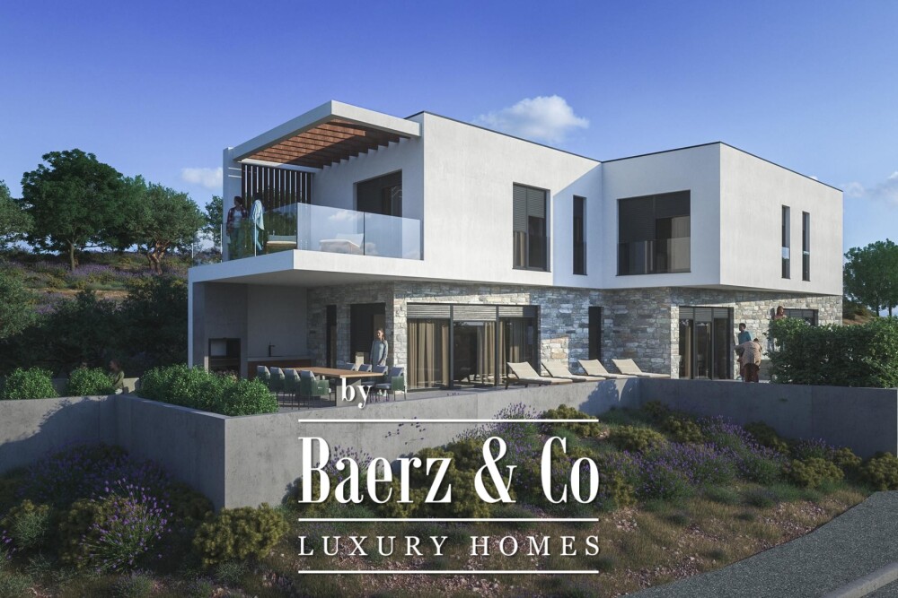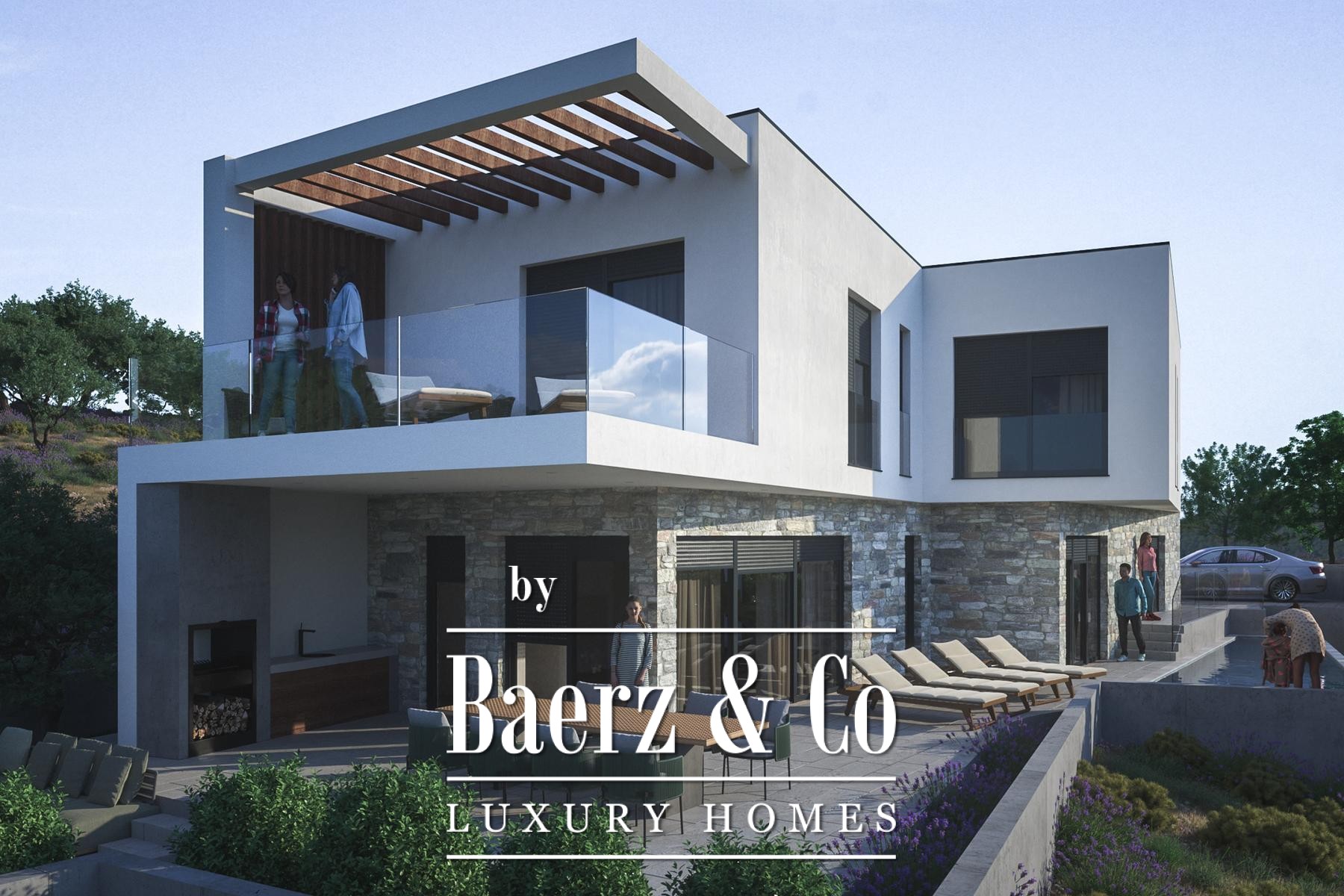 Upstairs, four bedrooms each feature en suite bathrooms and dedicated wardrobes, unified by access to a pergola-shaded terrace overlooking the private 562 m² plot. Below, a covered summer kitchen and a heated concrete swimming pool with sunbathing area extend the rhythm of indoor spaces into the open air. Materials include porotherm brick, Styrofoam façade insulation, PVC joinery, and underfloor heating, with customizable floors in parquet or ceramics.