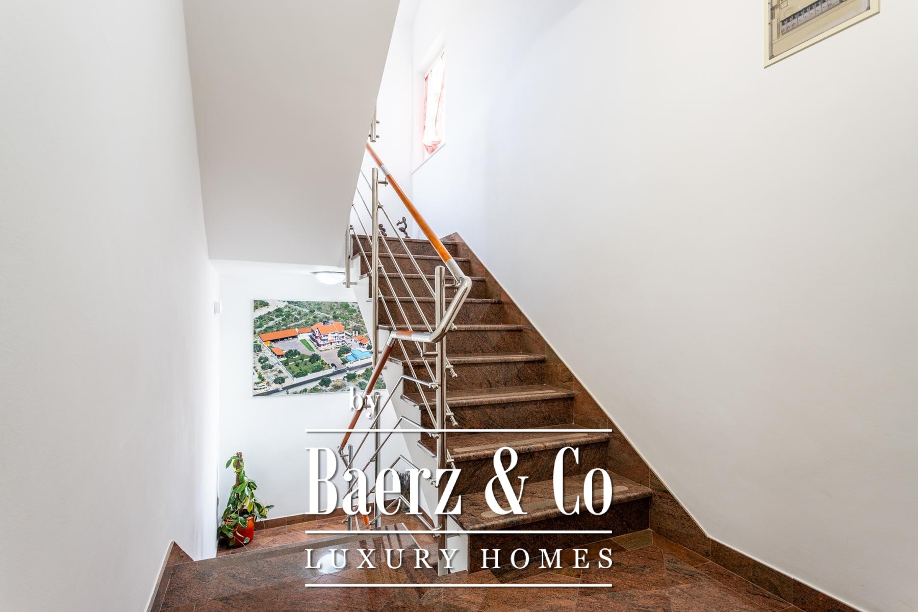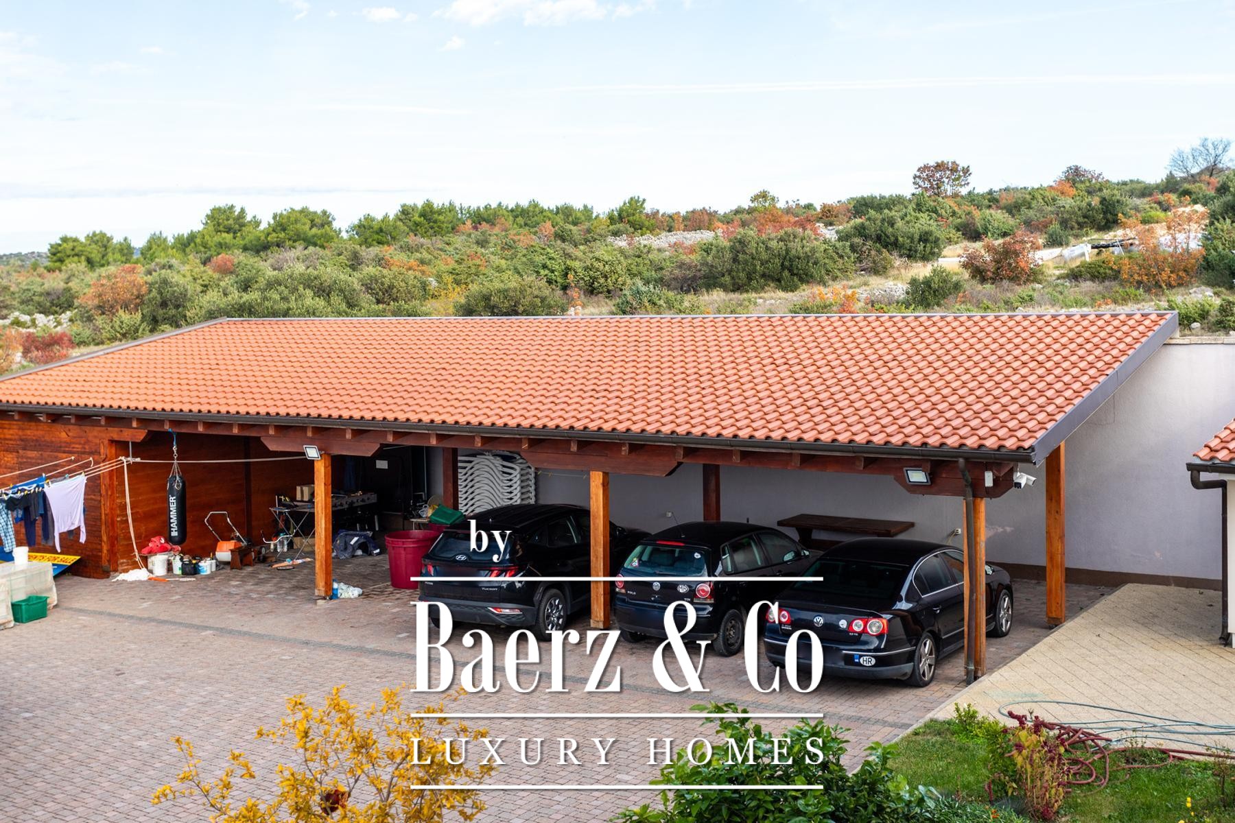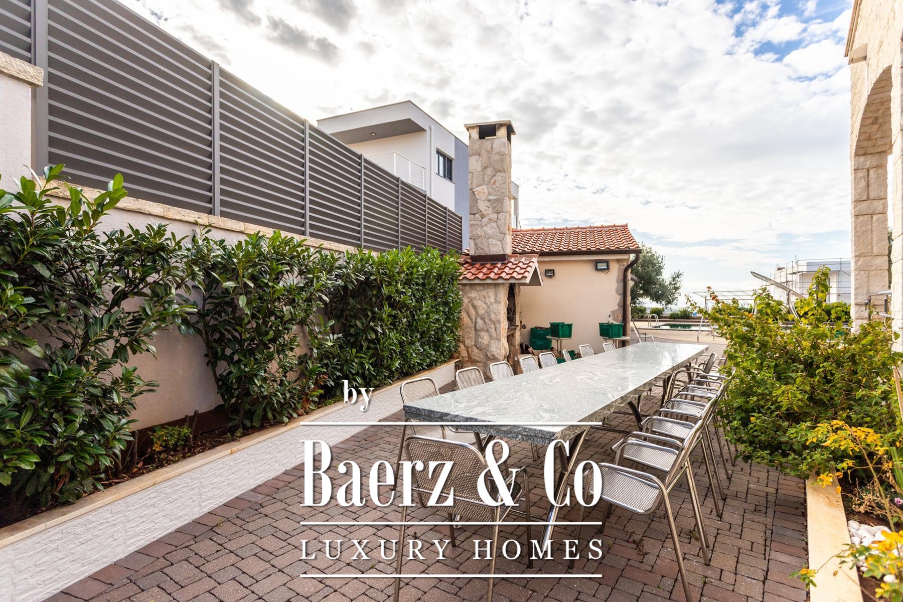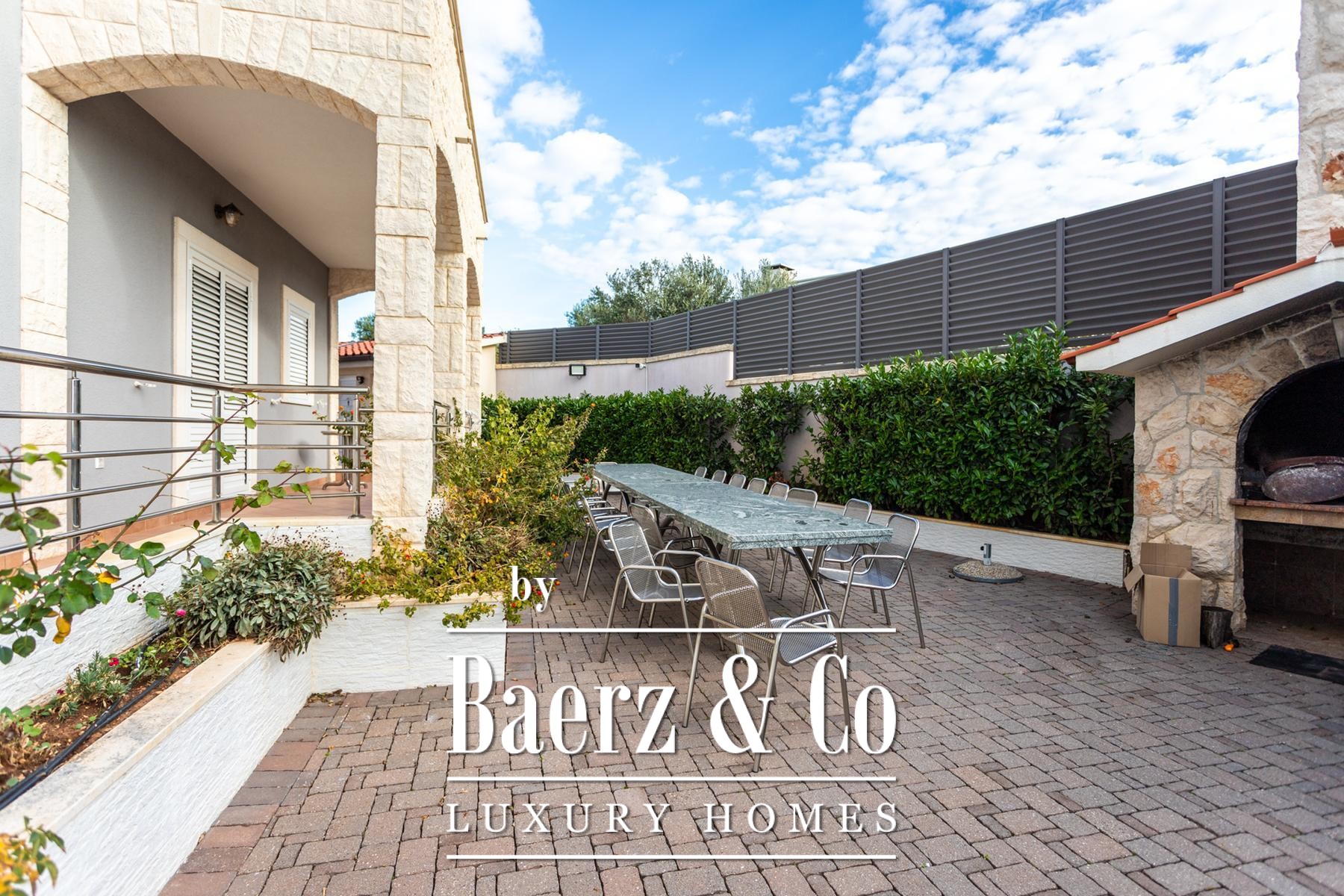 Villa Primošten is a property defined by its clear geometry, sea views, and the discreet luxury of space. This villa, built in 2001, comprises 1,052 m² of living area set on a 1,536 m² plot, offering a rare scale and privacy. The layout spans three levels. The ground floor introduces a kitchen, living room, and dining space along with two well-proportioned bedrooms and a studio apartment complete with its own bath. Each of the two upper floors houses two independent apartments, each featuring two bedrooms, a bathroom, an open kitchen and dining area, and private terraces framing uninterrupted sea views. A fully equipped gym is situated on the second floor. Central heating ensures year-round comfort. Outside, a 110 m² swimming pool with integrated sprinklers is ringed by mature greenery and a thoughtfully landscaped yard. Auxiliary spaces include outdoor restrooms, a tavern, bar, laundry room, tool shed, generator room, and a covered parking area for six cars. The villa is offered fully furnished and equipped, supporting either private enjoyment or continued focus as a luxury villa for sale in Primošten.