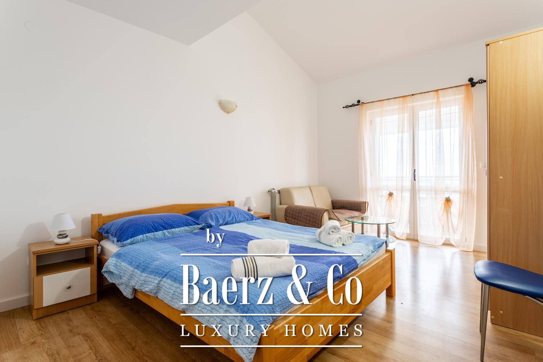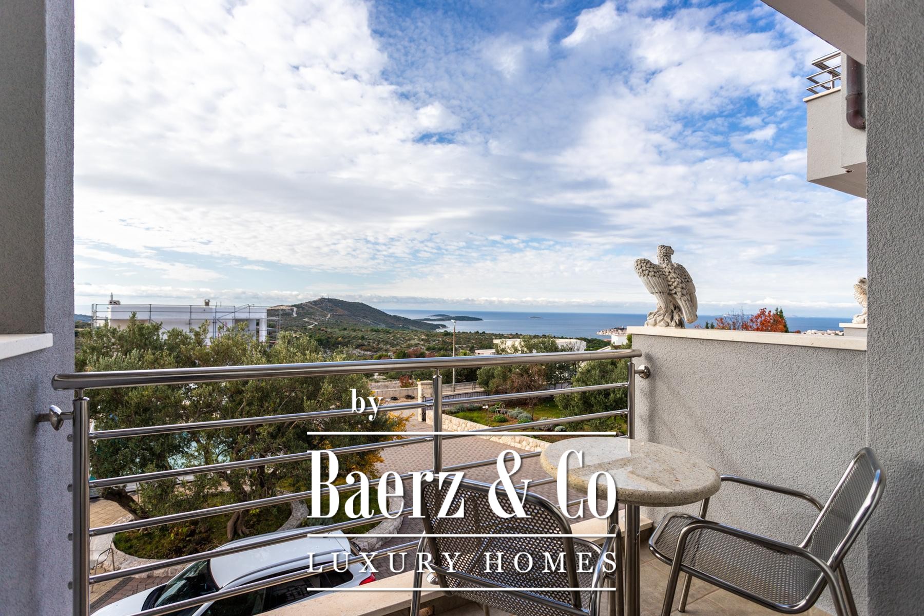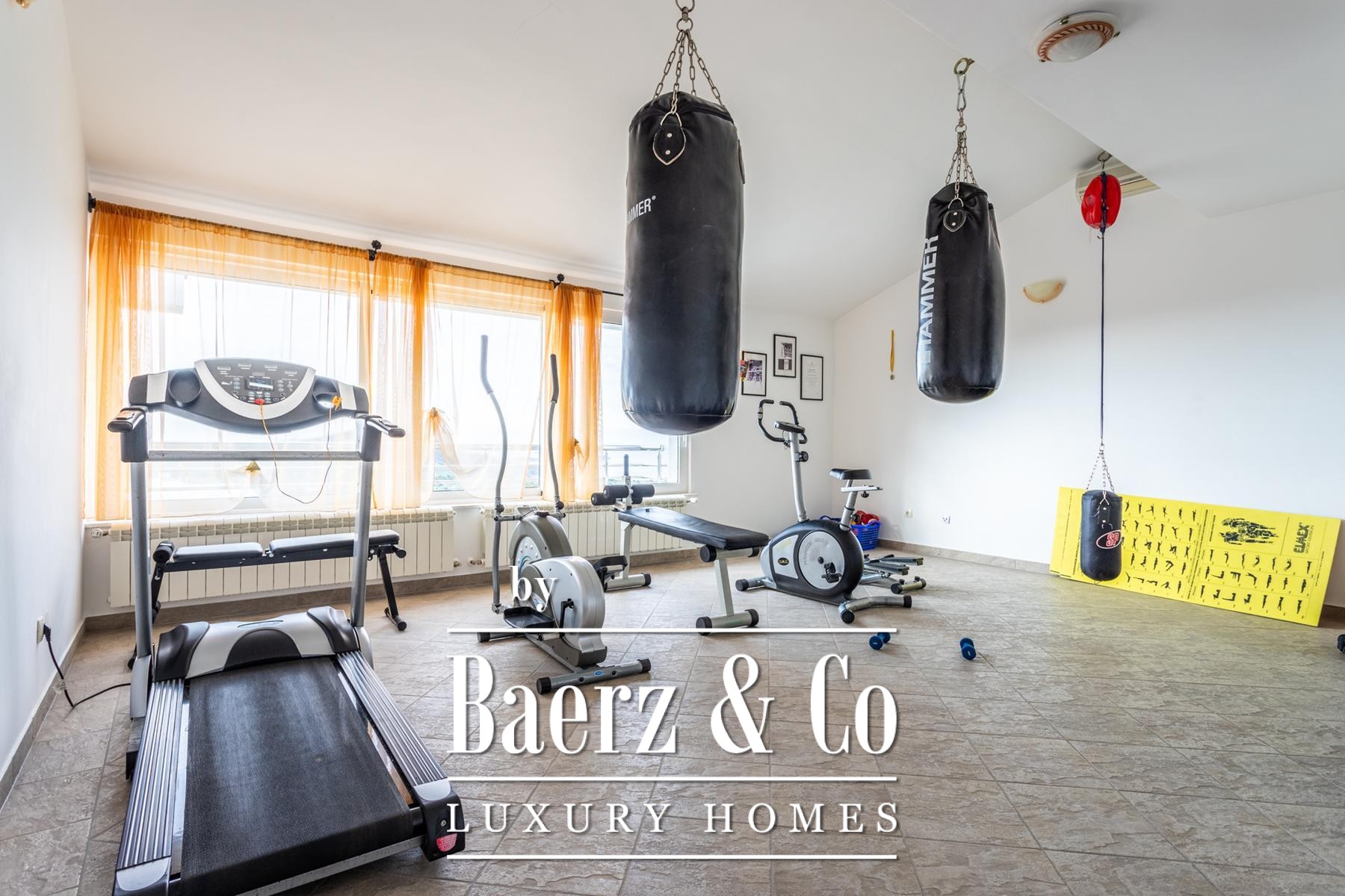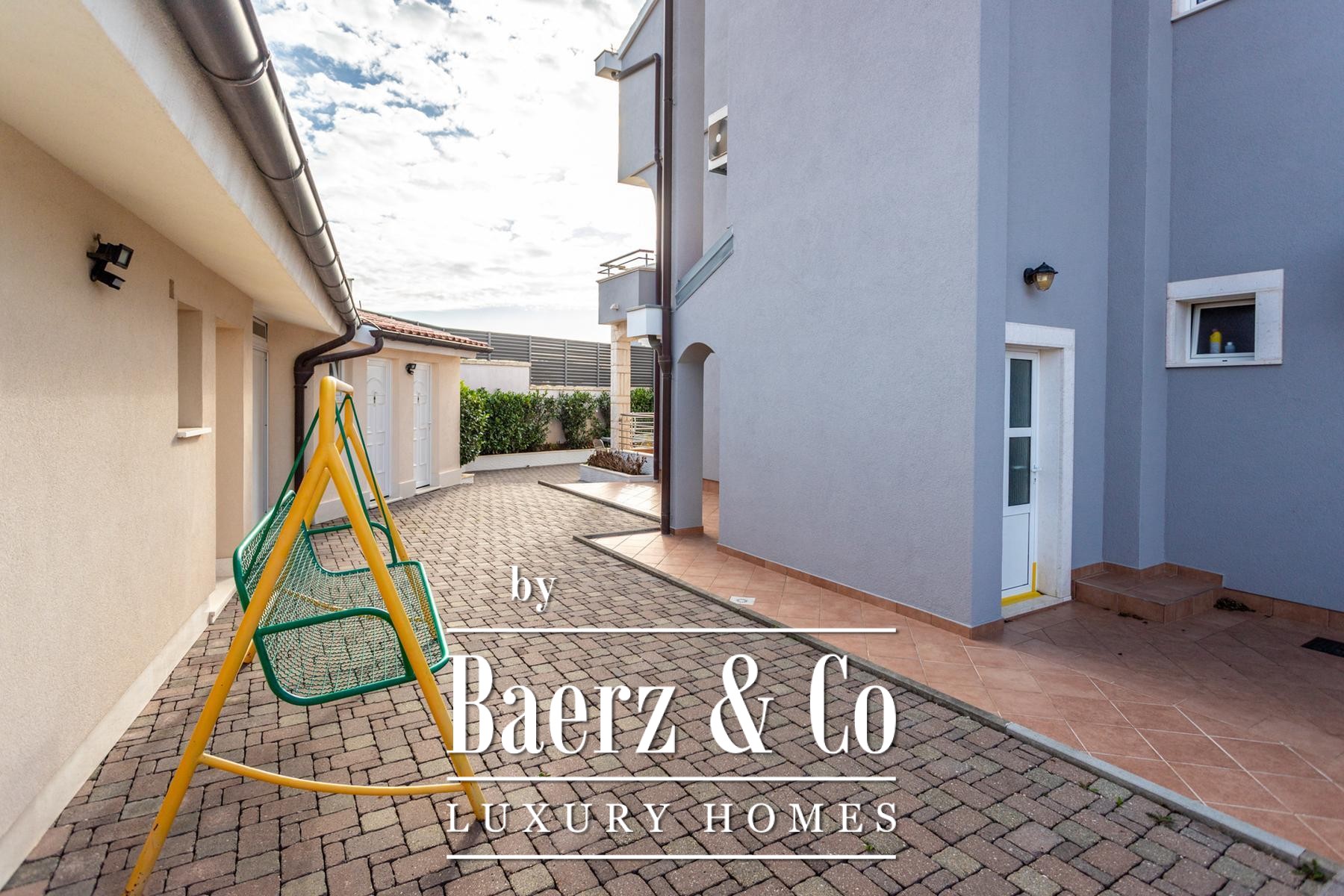 Villa Primošten is a property defined by its clear geometry, sea views, and the discreet luxury of space. This villa, built in 2001, comprises 1,052 m² of living area set on a 1,536 m² plot, offering a rare scale and privacy. The layout spans three levels. The ground floor introduces a kitchen, living room, and dining space along with two well-proportioned bedrooms and a studio apartment complete with its own bath. Each of the two upper floors houses two independent apartments, each featuring two bedrooms, a bathroom, an open kitchen and dining area, and private terraces framing uninterrupted sea views. A fully equipped gym is situated on the second floor. Central heating ensures year-round comfort. Outside, a 110 m² swimming pool with integrated sprinklers is ringed by mature greenery and a thoughtfully landscaped yard. Auxiliary spaces include outdoor restrooms, a tavern, bar, laundry room, tool shed, generator room, and a covered parking area for six cars. The villa is offered fully furnished and equipped, supporting either private enjoyment or continued focus as a luxury villa for sale in Primošten.
