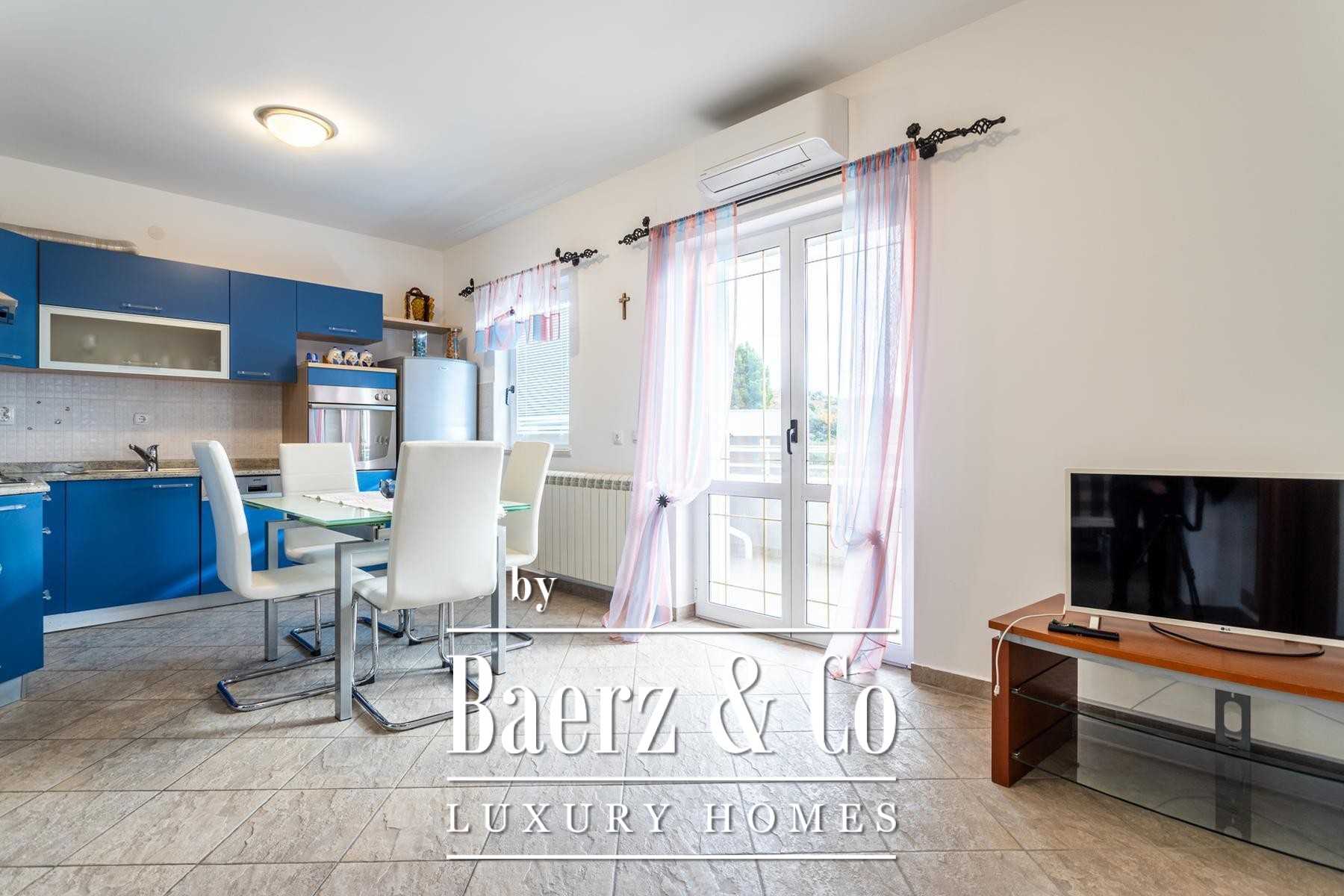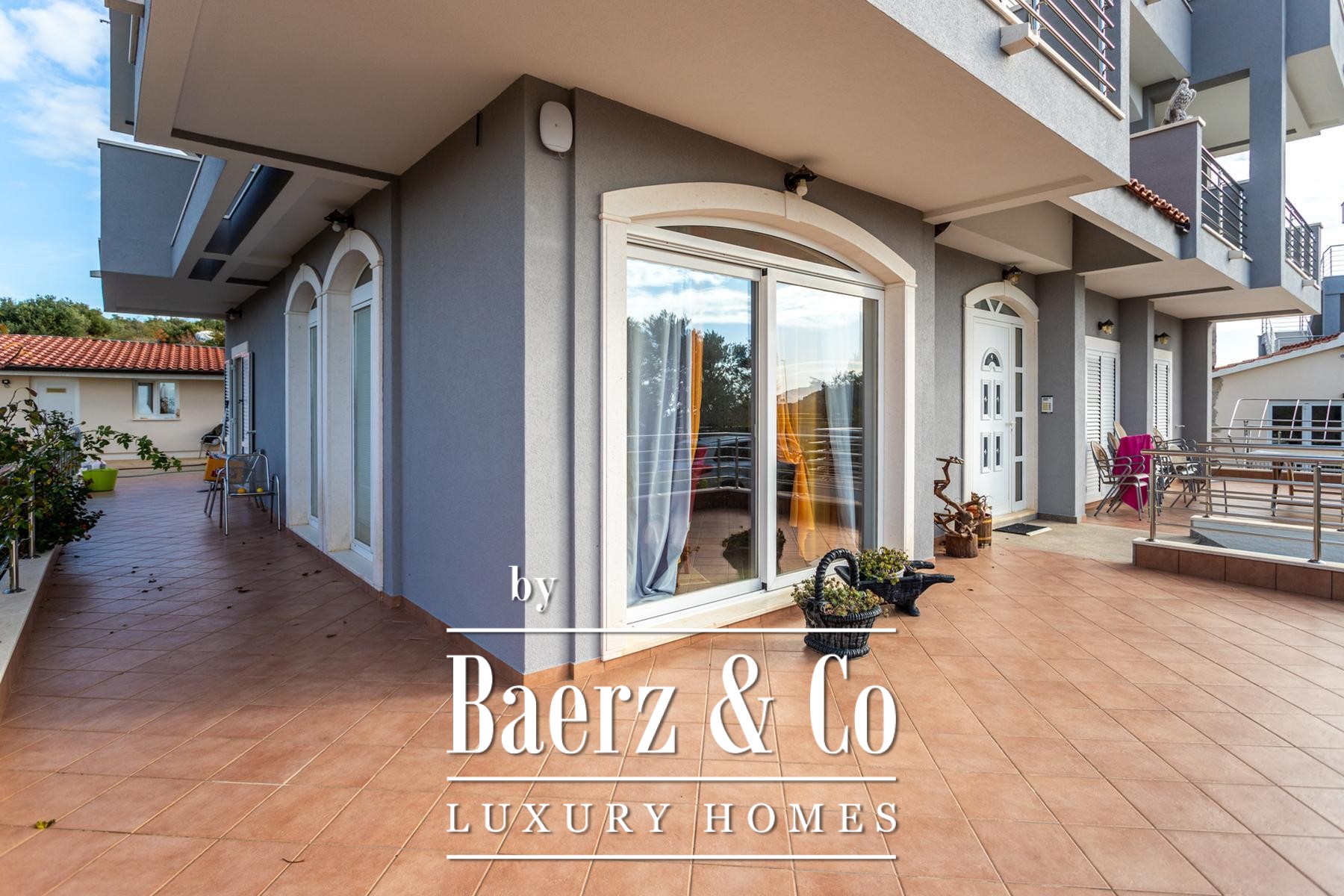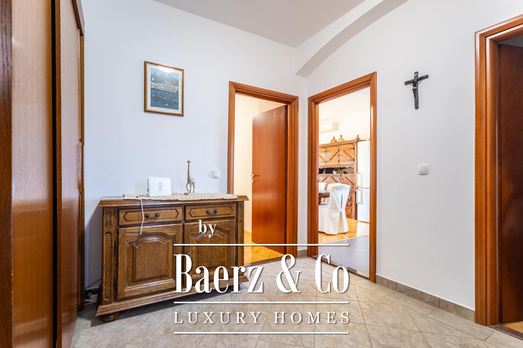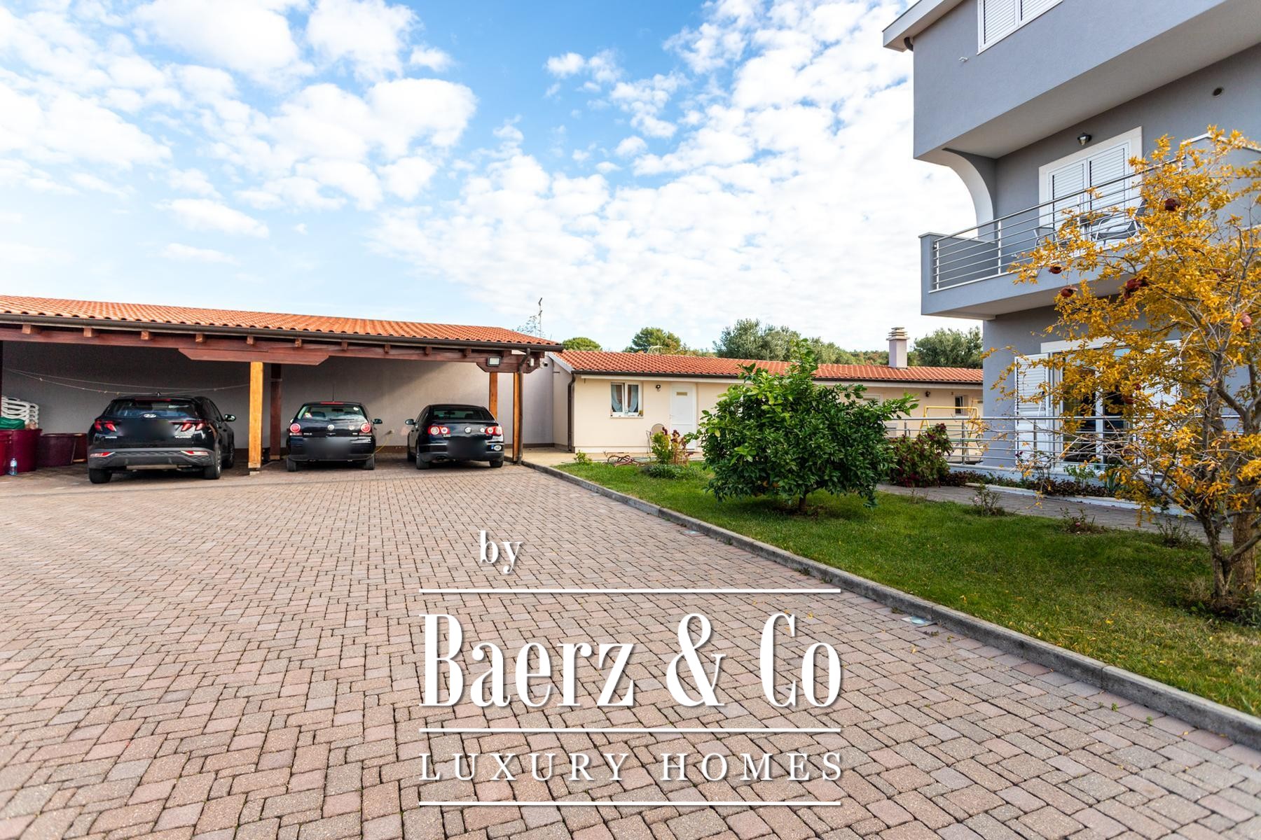 Villa Primošten is a property defined by its clear geometry, sea views, and the discreet luxury of space. This villa, built in 2001, comprises 1,052 m² of living area set on a 1,536 m² plot, offering a rare scale and privacy. The layout spans three levels. The ground floor introduces a kitchen, living room, and dining space along with two well-proportioned bedrooms and a studio apartment complete with its own bath. Each of the two upper floors houses two independent apartments, each featuring two bedrooms, a bathroom, an open kitchen and dining area, and private terraces framing uninterrupted sea views. A fully equipped gym is situated on the second floor. Central heating ensures year-round comfort. Outside, a 110 m² swimming pool with integrated sprinklers is ringed by mature greenery and a thoughtfully landscaped yard. Auxiliary spaces include outdoor restrooms, a tavern, bar, laundry room, tool shed, generator room, and a covered parking area for six cars. The villa is offered fully furnished and equipped, supporting either private enjoyment or continued focus as a luxury villa for sale in Primošten.