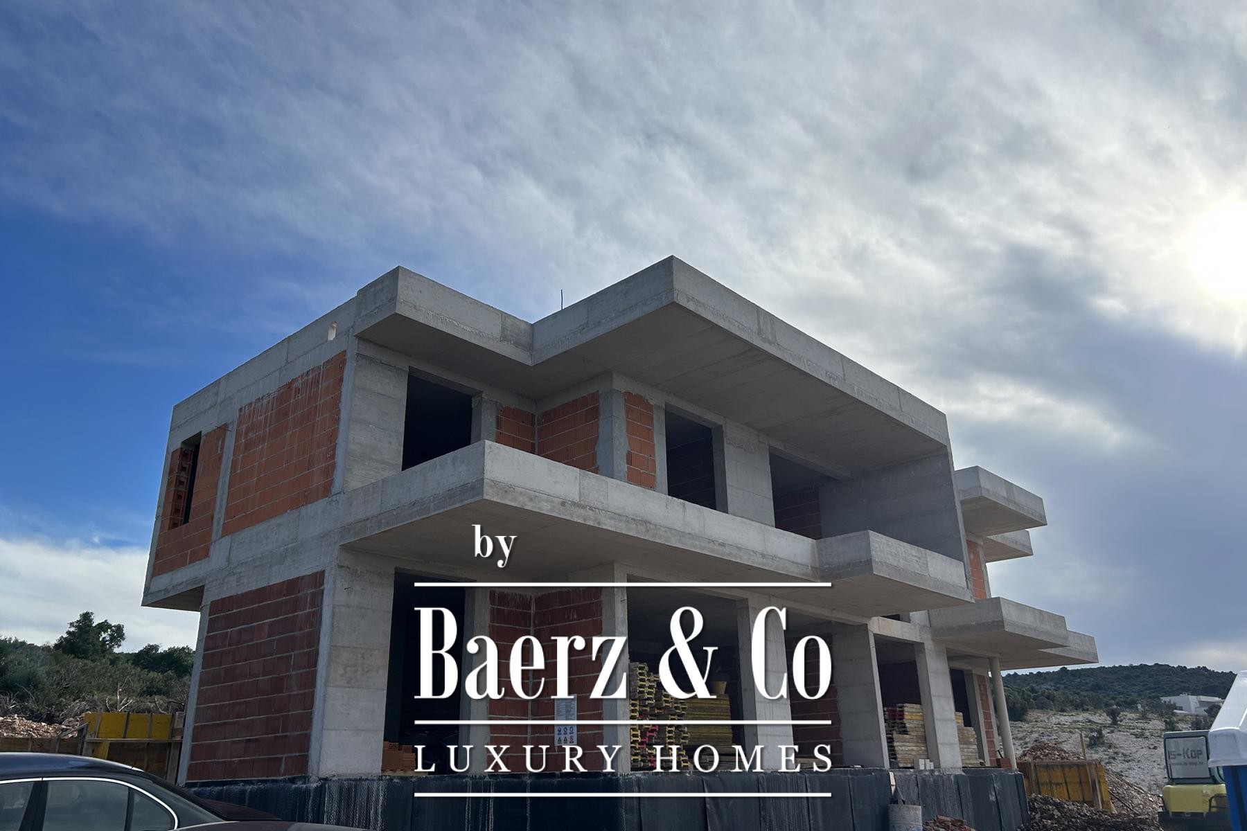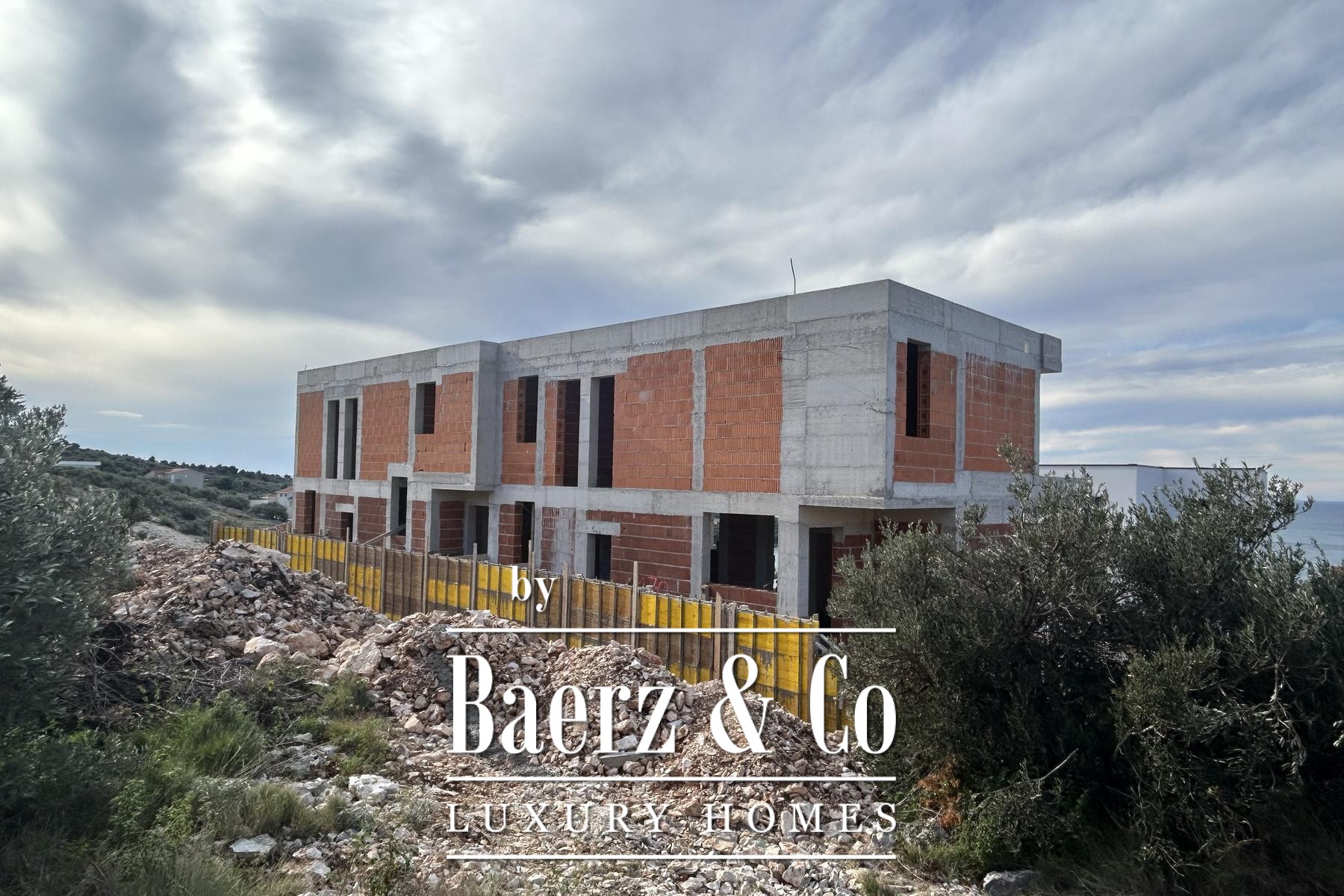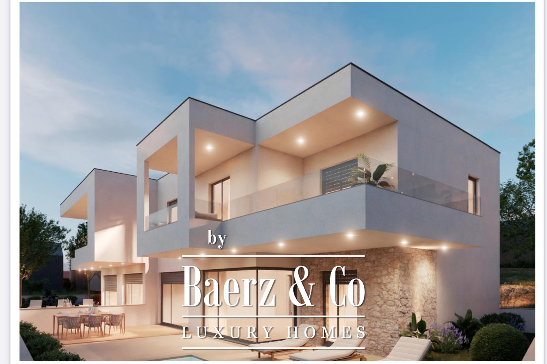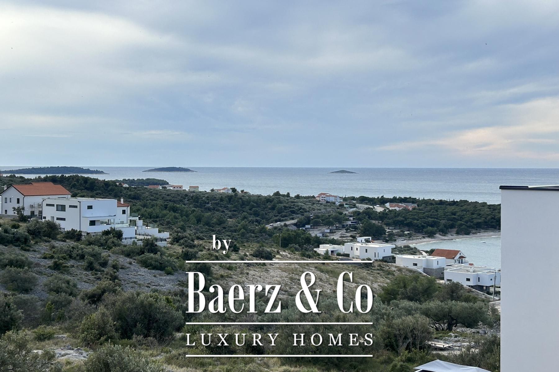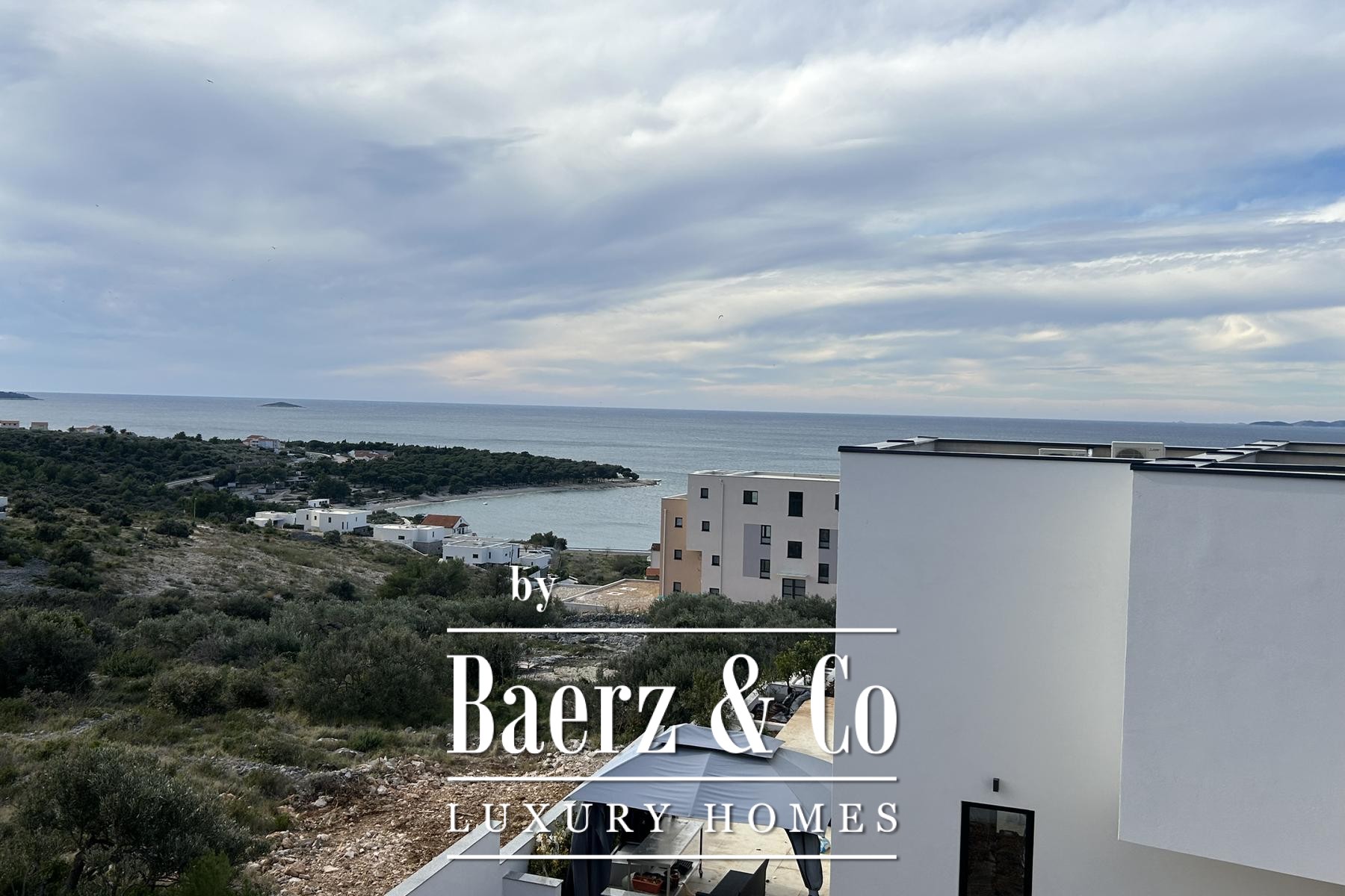 This semi-detached house Primošten presents 166 m² of refined living space, thoughtfully distributed across two luminous levels on a plot of 473 m². The residence stands moments from the Adriatic, offering uninterrupted panoramic sea views from every principal room. On the ground floor, an open layout unites living, dining, and kitchen, accented by direct access to a covered terrace. Here, outdoor dining and a barbecue area seamlessly merge with the adjacent pool and sunbathing terrace, framed by an 86 m² landscaped garden.