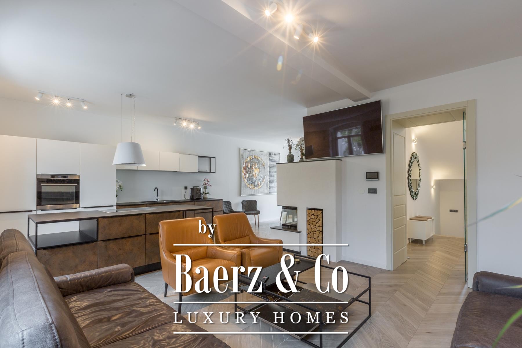 Upon entering, a compact lobby sets a restrained tone, opening into a fluid open-plan living space. Here, a modern wood-burning fireplace anchors the lounge, while glass walls invite light and lead to the garden, the covered summer terrace, and the heated pool. The dining area and maximally equipped kitchen echo the house's clean lines and emphasis on modern comfort.
