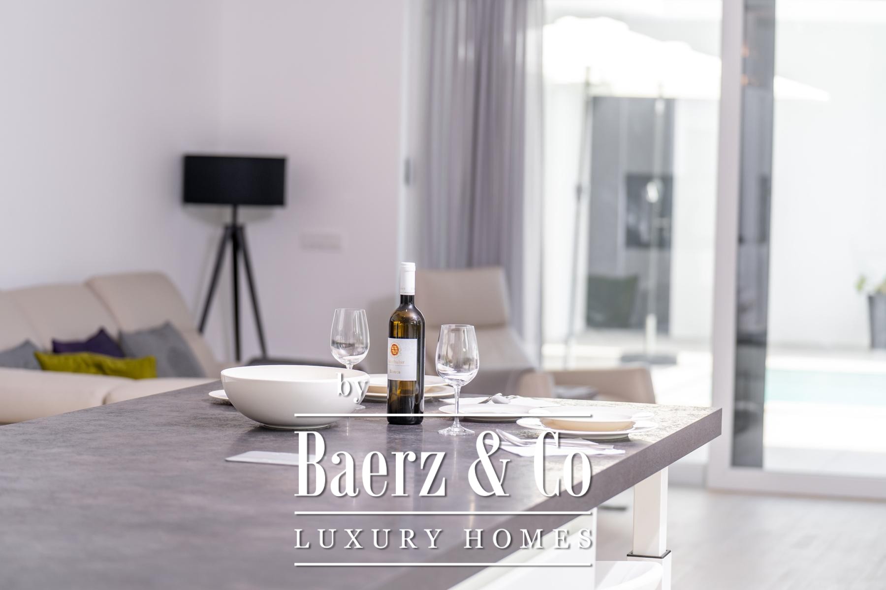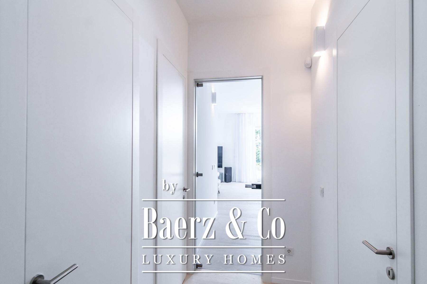 above today’s standards. To achieve waterproofing and protection from capillary moisture, the concrete slab floor was treated with XYPEX waterproofing additive. The floors were additionally protected with classic SIKA waterproofing coatings. A total of 21 cm of rigid floor styrofoam insulation was installed. Except in the bathrooms and laundry room, light-toned parquet flooring was laid throughout. Such floors provide exceptional indoor climate conditions and living comfort.3. ROOF STRUCTUREThe most modern insulation for flat roofs has been installed. The roof features a vapour barrier, sloped EPS thermal insulation 25-32 cm thick, SIKA waterproof membrane 1.8 mm thick, geotextile, and a 10 cm layer of gravel. This construction ensures long-term functionality and a very pleasant indoor climate.4. LOAD-BEARING STRUCTUREStrip foundations, horizontal and vertical reinforced concrete tie beams, reinforced concrete ceiling structure. The central part of the villa is reinforced with reinforced concrete walls. The building is statically resistant to the seismic zone in which it is located according to seismic maps.ARCHITECTURAL PLANNINGThe villa is designed so that external influences such as wind and rainfall have minimal adverse effects. The villa is protected from winds by the surrounding forest, its orientation, and its single-storey height. Winds are hardly felt.The villa features large glass walls and abundant natural light. All glass walls are covered by more than two metres of roof overhang. This provides shade during the summer months, preventing sunlight from entering the interior. In winter, the sun moves lower on the horizon, entering and heating the space when it is most needed. The building has been constructed with energy class “A”. The interior ceiling height is 303 cm.