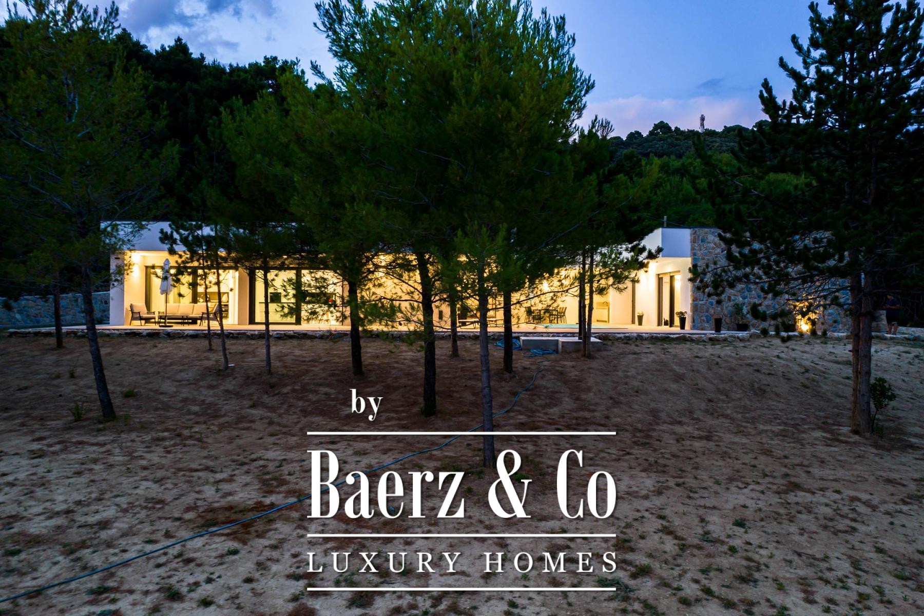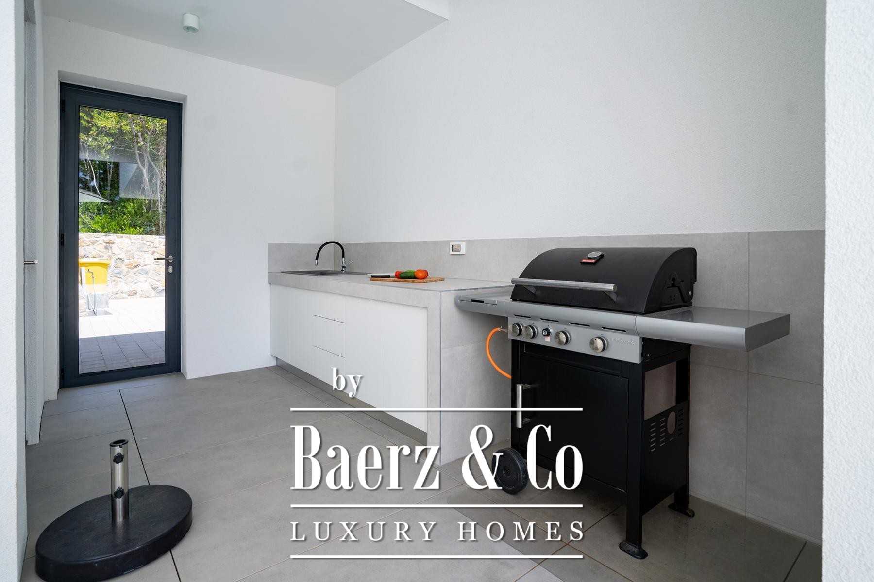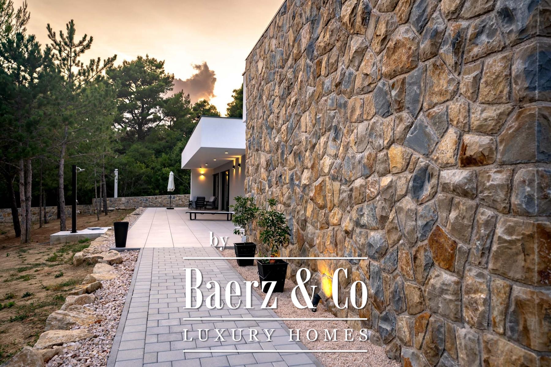 Beautiful villa situated on approx. 5,000 m² of a peaceful area of the island of Rab, in the village of Palit. Surrounded by dense forest and with private access via a bridge over a stream, this beautiful villa which is a rarity on the market offers complete privacy and uniqueness. Additional privacy is ensured by steel motorized sliding gates at the entrance to the property. The gates can be opened via remote control and mobile application. The property and villa are covered by security cameras. An alarm device is installed in the building. Due to the way it is built, the villa is technically designed so that wind and rainfall impacts are not felt.The villa is located approx. 1.0 km from the nearest beach, and approx. 2.0 km from the centre of the town of Rab. Access to the villa is provided by an asphalt road suitable for large trucks.The villa is a modern ground-floor house with a flat roof, sized 406 m². The entire roof is connected with pipelines through a sand filter to a 50 m³ cistern, ensuring that during the hot summer months there is never a shortage of rainwater for watering flowers and other plants. The entire rainwater system can be redirected via valves for household use as well.A preparation for the installation of a solar power plant has been left on the roof surface.CONSTRUCTIONStructurally, the villa is built in the highest quality:1. EXTERIOR WALLTotal thickness approx. 52 cm. The load-bearing part is clay block masonry 38 cm thick. The façade is finished with 12 cm of styrofoam insulation and a Baumit top coat. The interior finish consists of gypsum-karton boards glued directly to the wall. Such an exterior wall guarantees the highest building physics standards regarding thermal performance and water-vapour diffusion.2. GROUND FLOOR FLOORSThey are insulated far