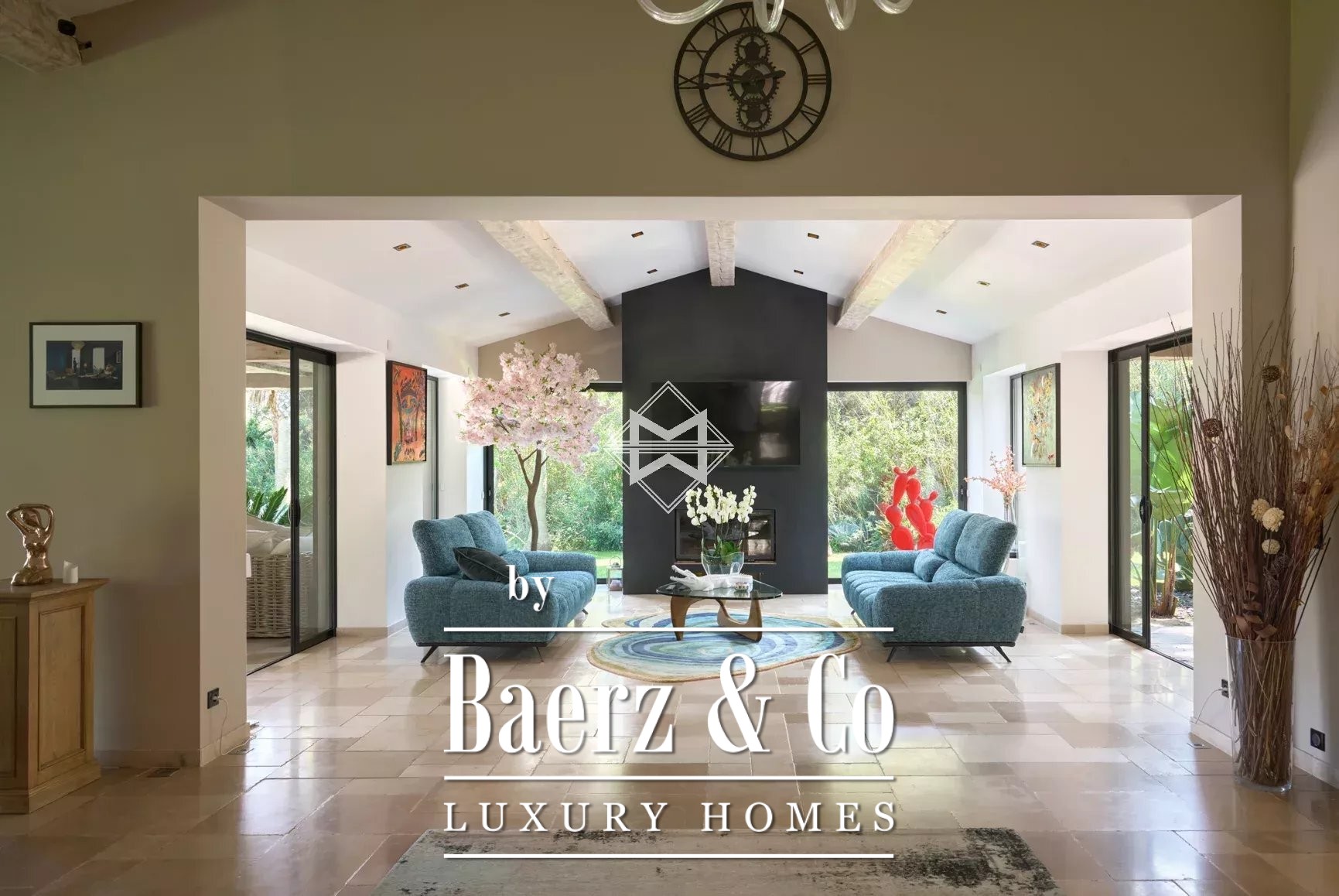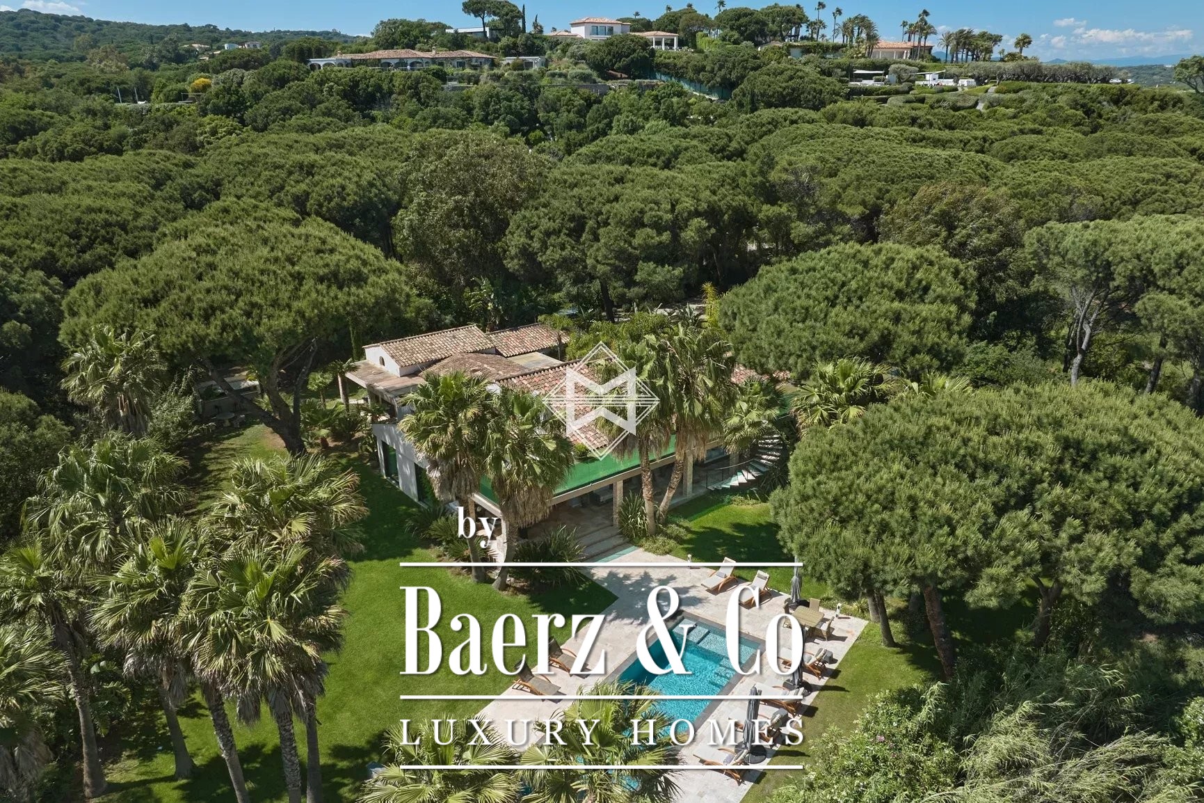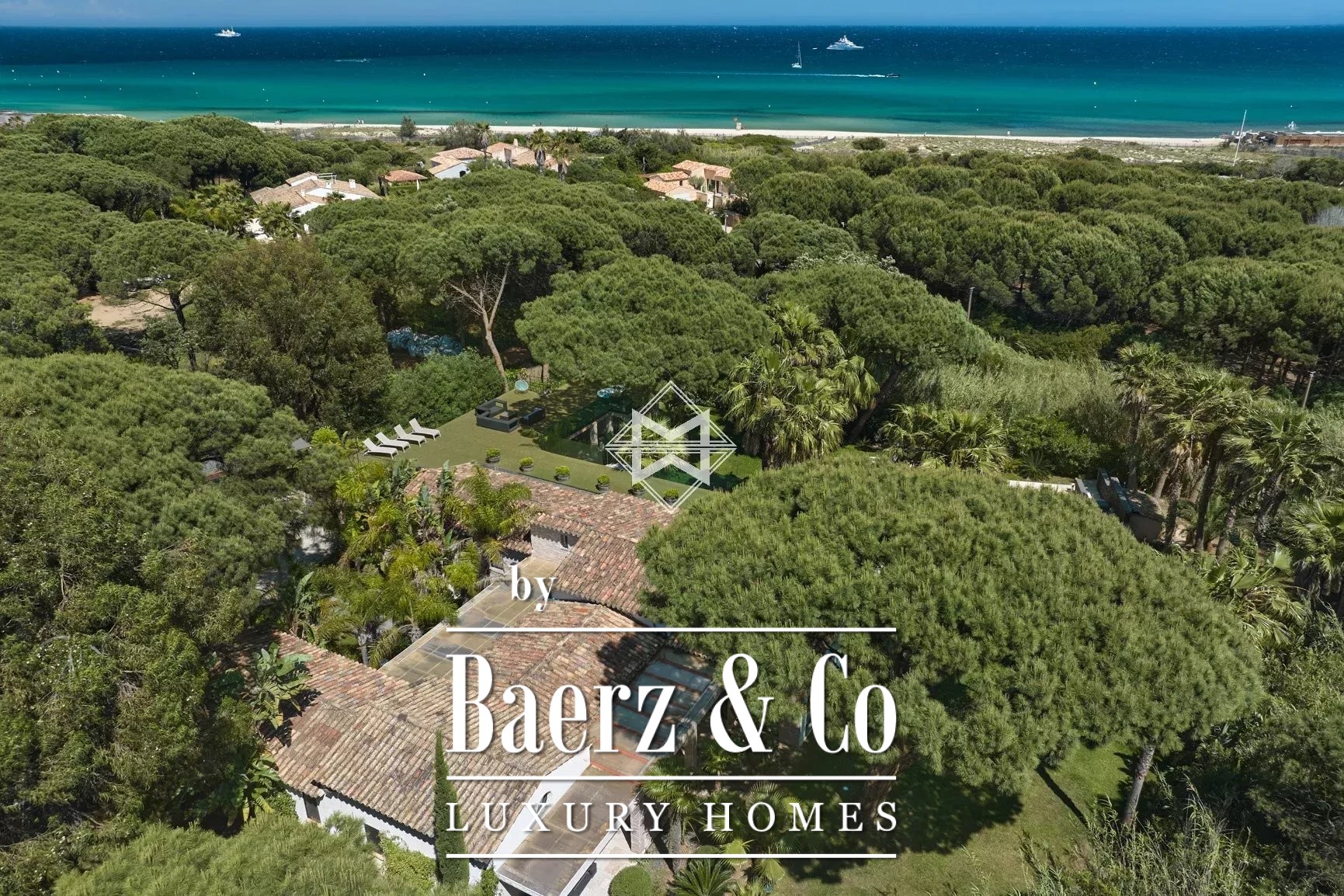 Villa Ramatuelle captures the essence of understated luxury, positioned just 150 metres from the renowned Pampelonne Beach. This single-level villa encompasses 450 m² of carefully composed living space, set within a tranquil 2,948 m² flat plot, shielded from view and immersed in natural beauty. The heart of the property is a generous living area seamlessly joining a dining room, both opening onto a broad terrace that frames views of abundant greenery.