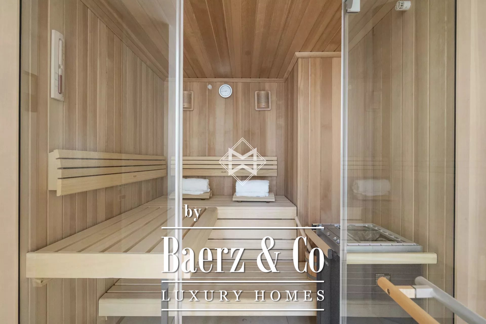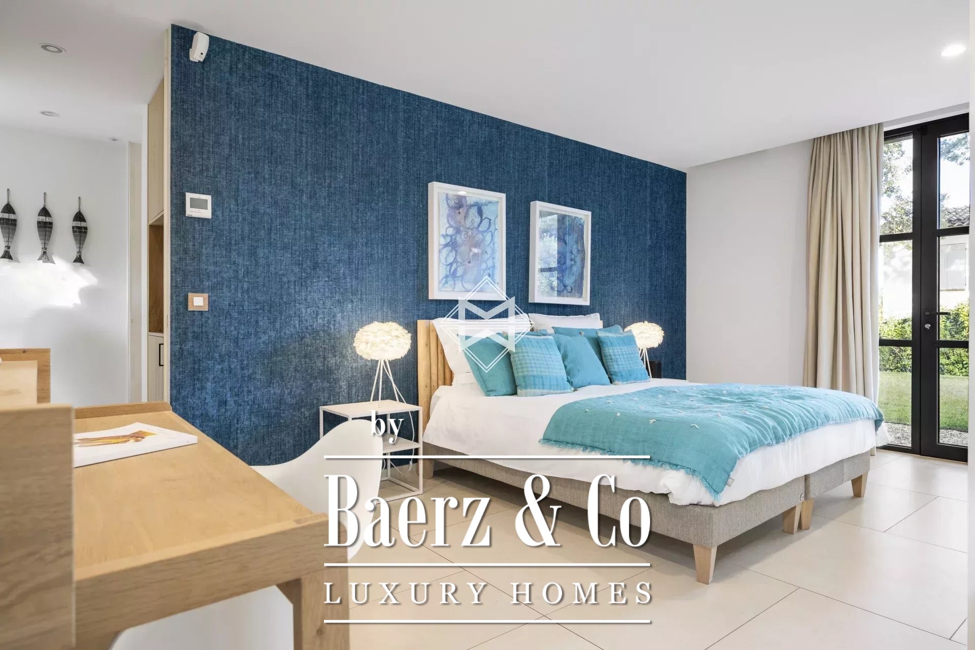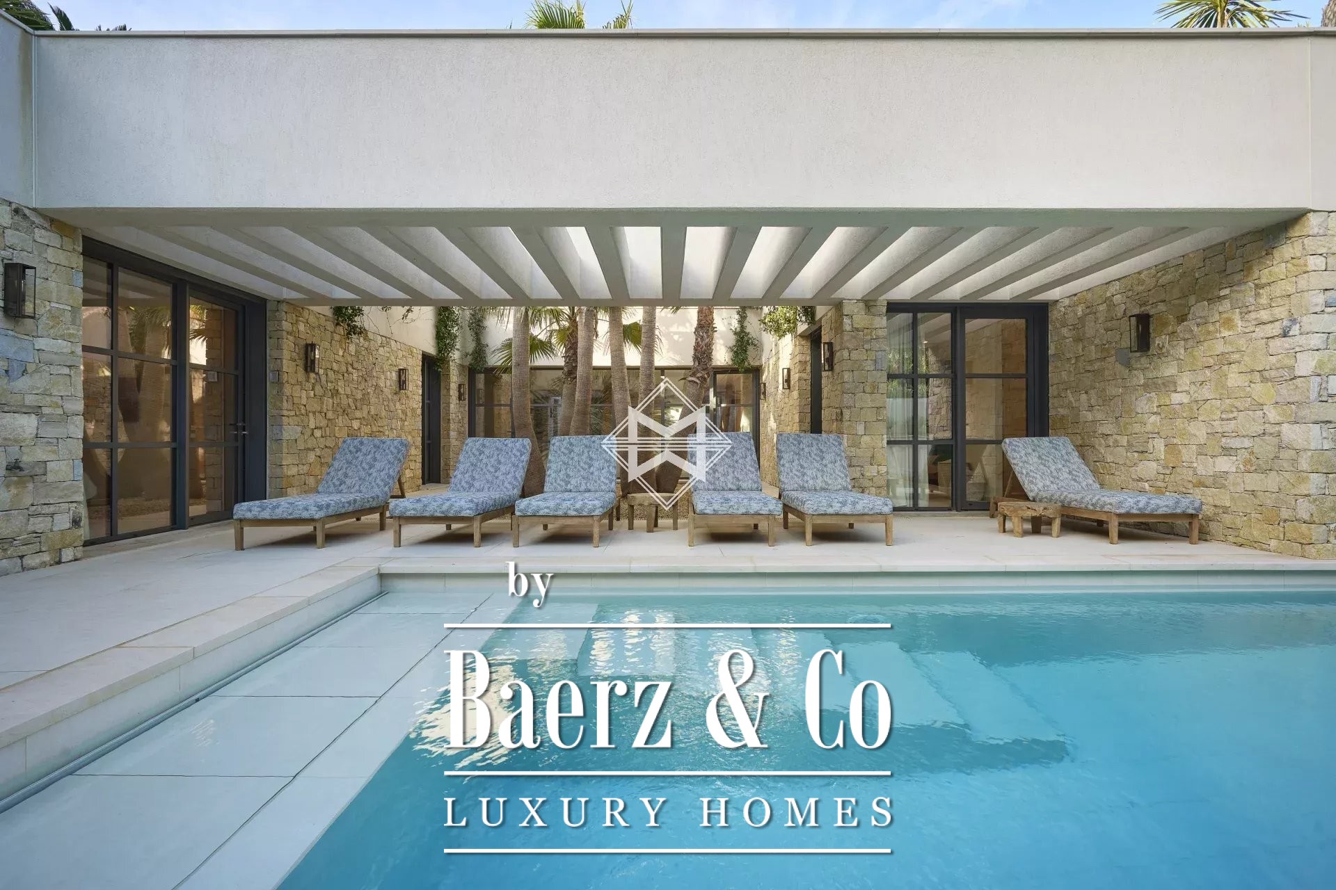 At the core of the villa, a fully equipped open-plan kitchen blends form and function, while heated floors and advanced amenities ensure year-round comfort. The outdoor areas invite quiet leisure as well as convivial gatherings, with a heated pool, outdoor dining space, and a lounge surrounded by mature landscaping. Security and convenience are prioritized with features including air-conditioning, double glazing, sliding windows, electric shutters, video security, and a safe.
