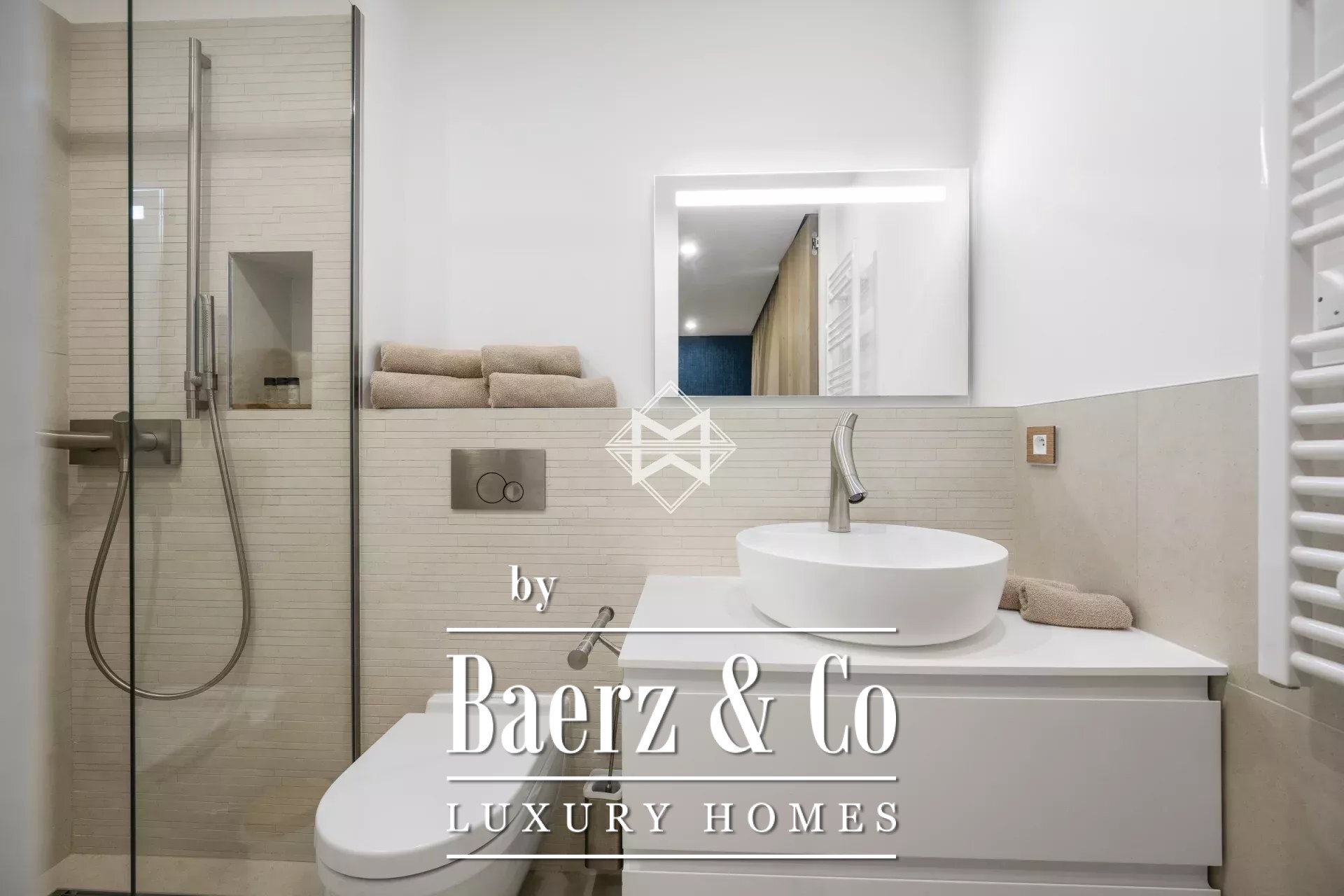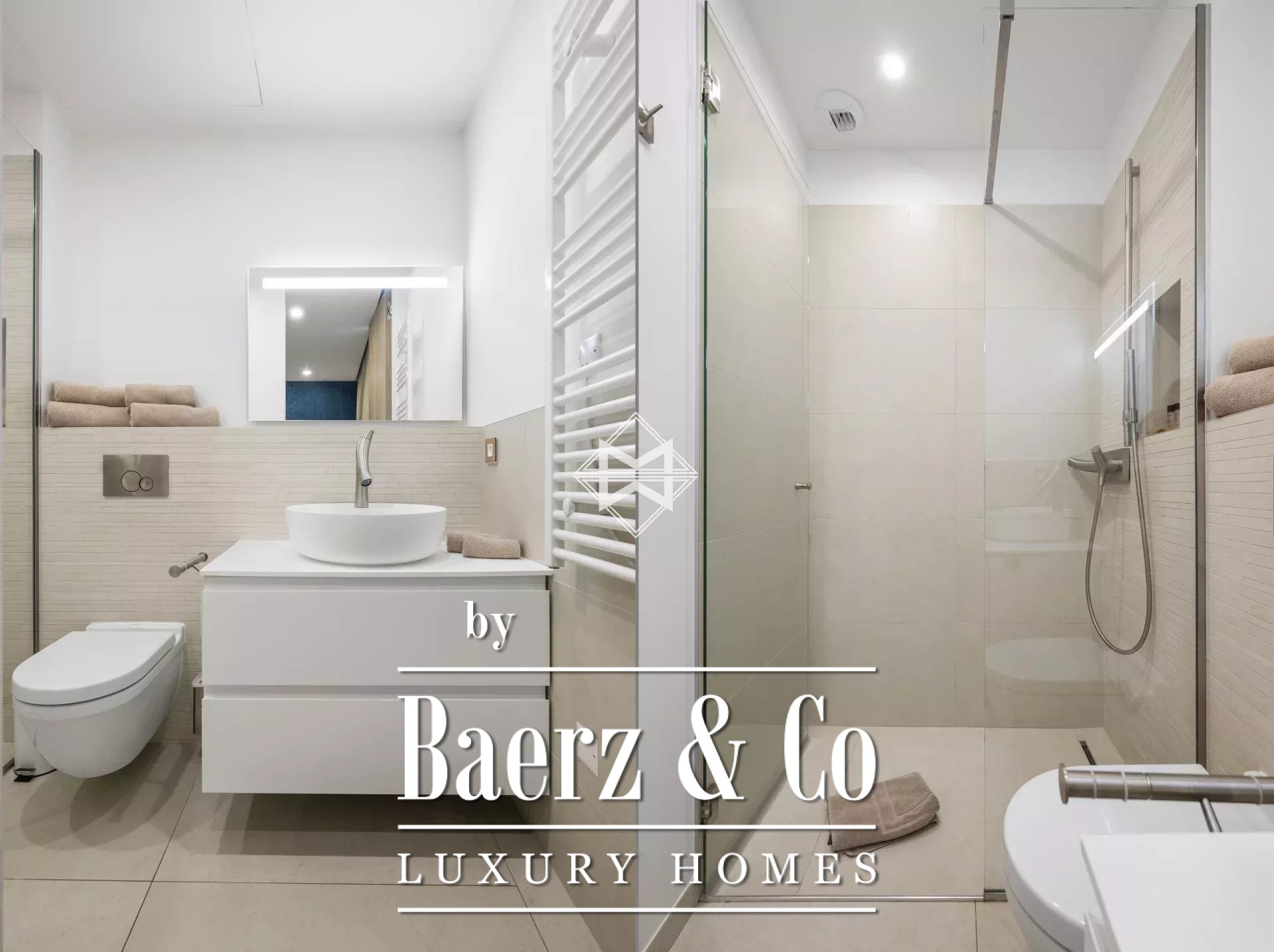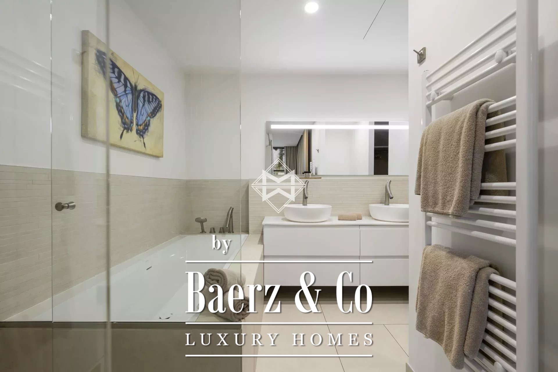 At the core of the villa, a fully equipped open-plan kitchen blends form and function, while heated floors and advanced amenities ensure year-round comfort. The outdoor areas invite quiet leisure as well as convivial gatherings, with a heated pool, outdoor dining space, and a lounge surrounded by mature landscaping. Security and convenience are prioritized with features including air-conditioning, double glazing, sliding windows, electric shutters, video security, and a safe.