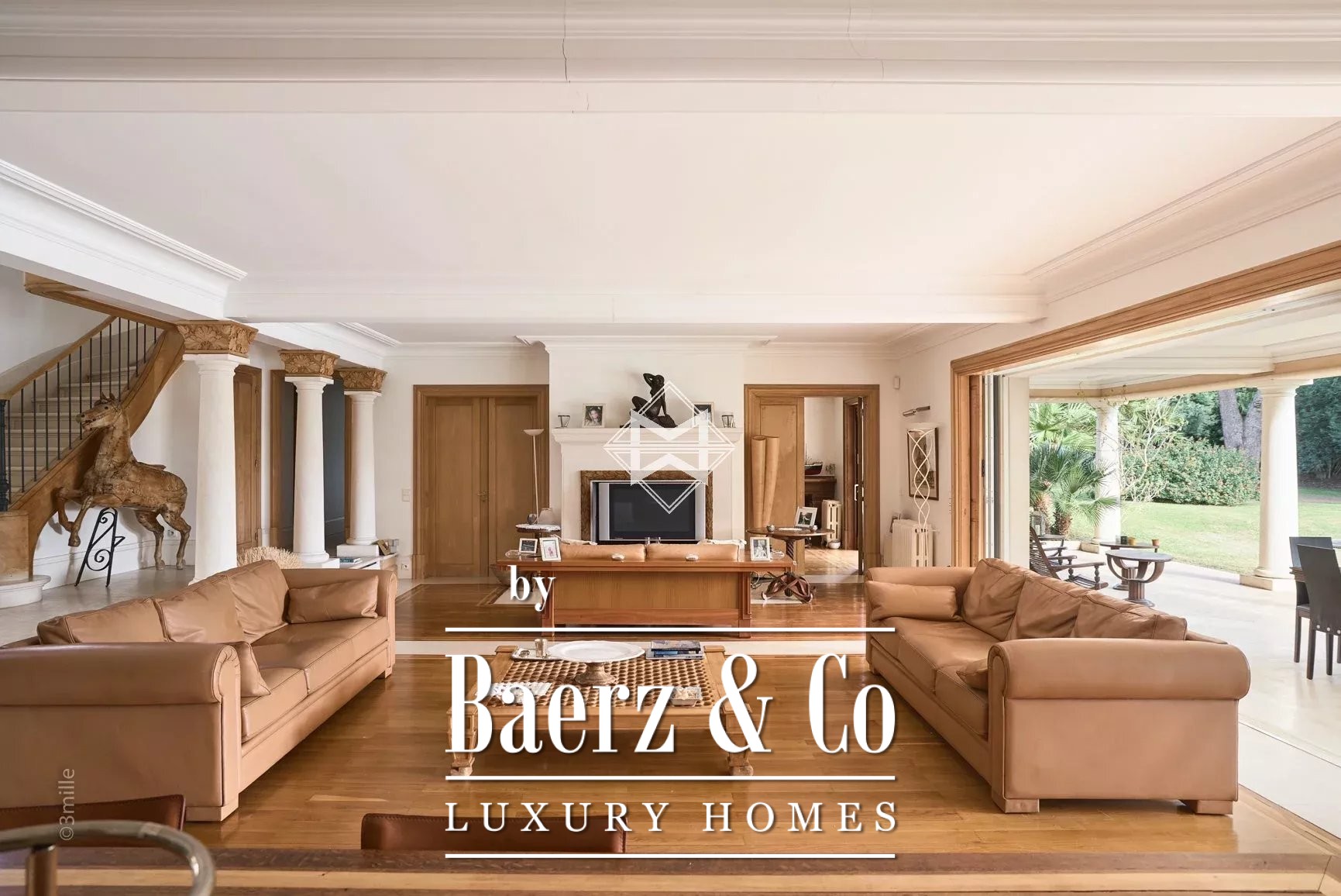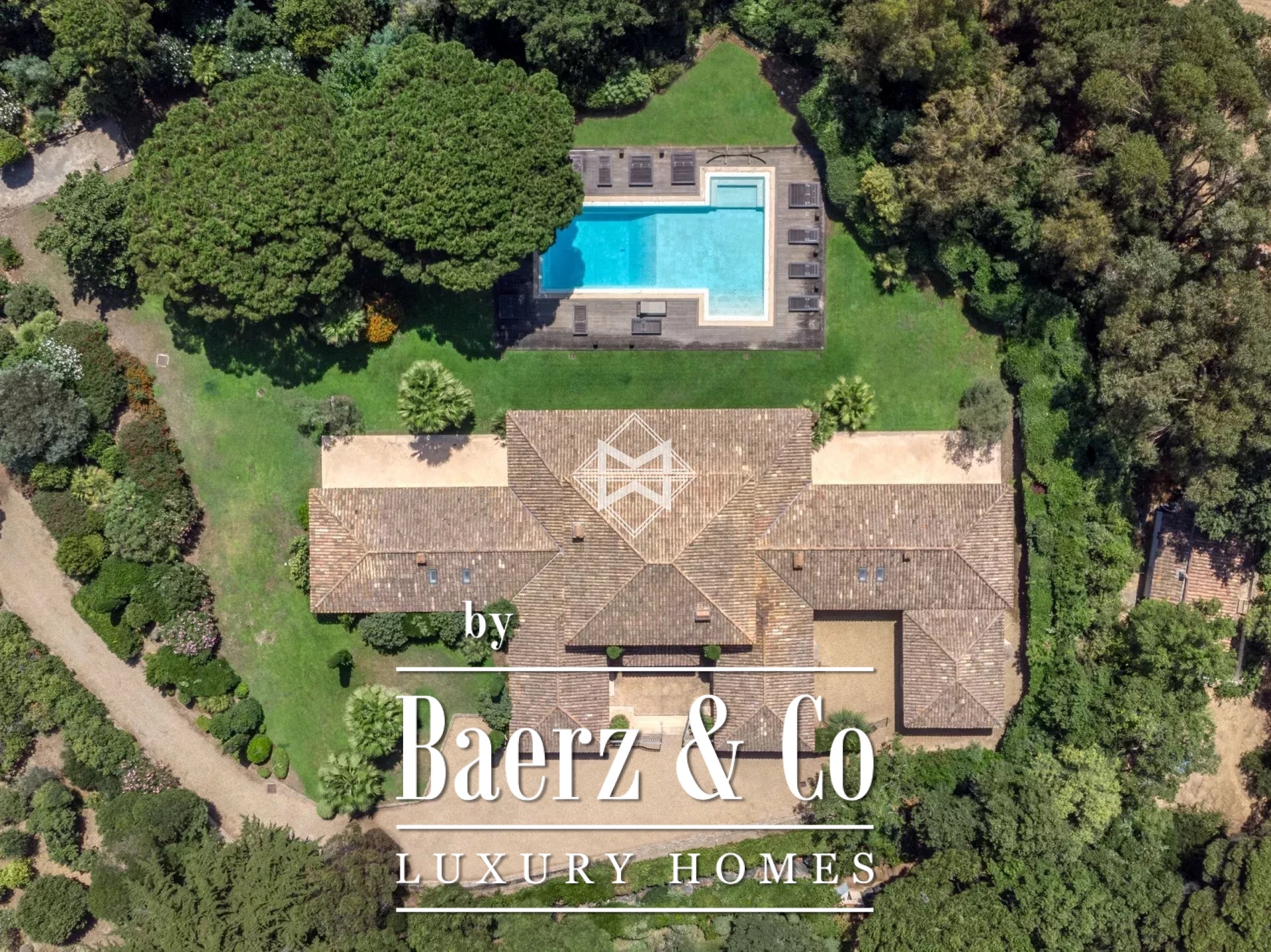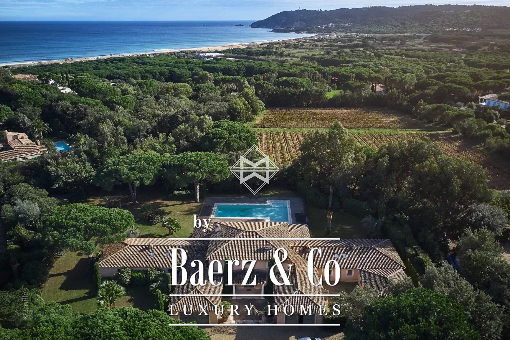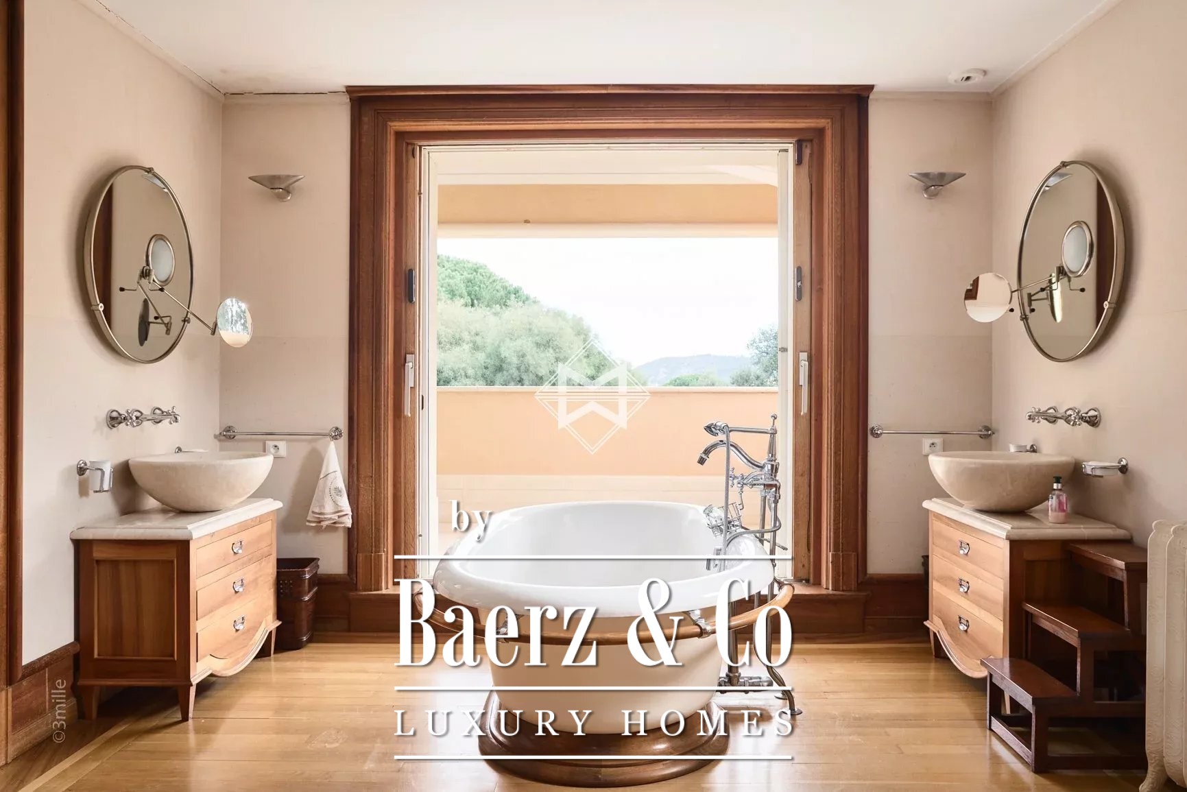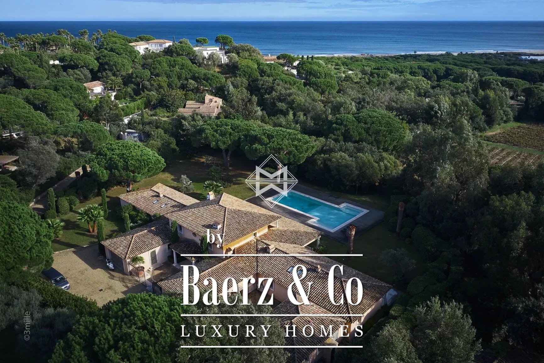 Villa Ramatuelle stands moments from the iconic Pampelonne beach, drawing the eye with its 590 m² of refined living space and distinctive Empire-style interiors. This villa in Ramatuelle opens onto an elegant sequence of generously proportioned rooms, where light traverses expansive glazing and each material has been selected for its quality and resonance.