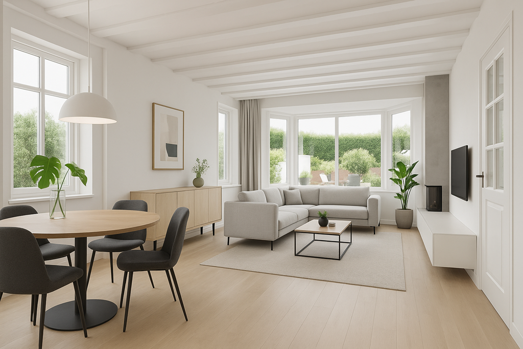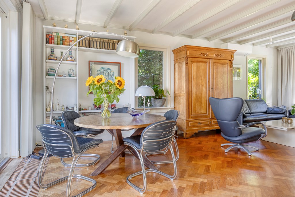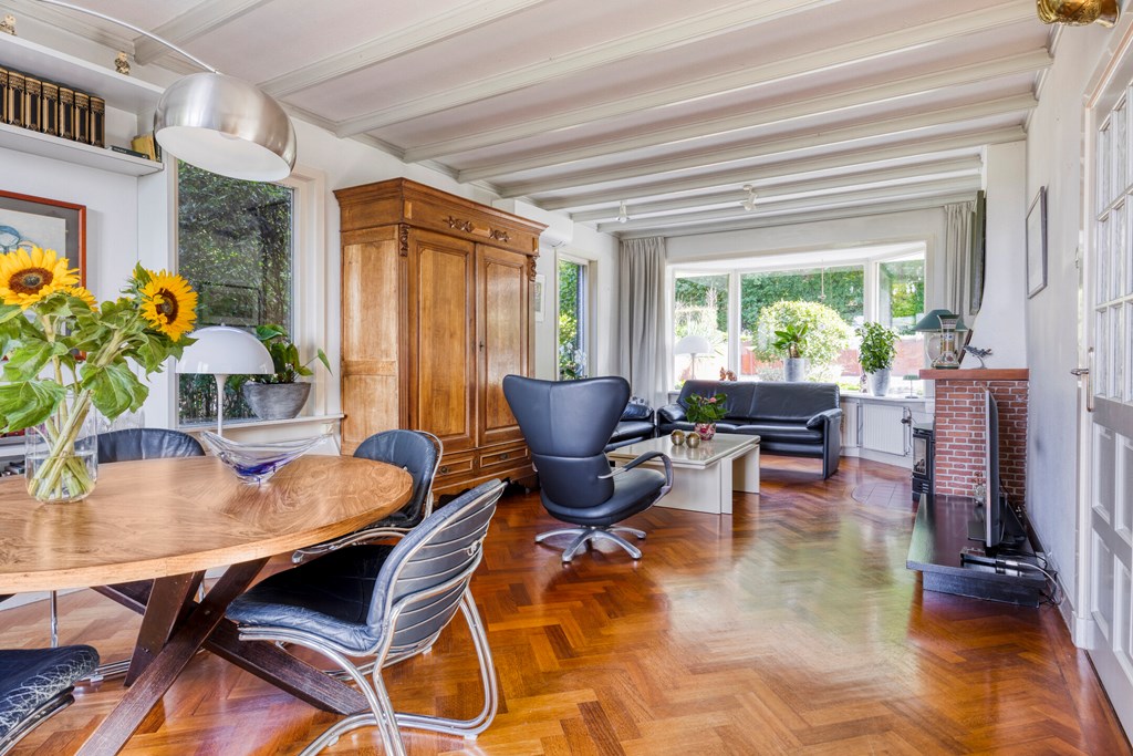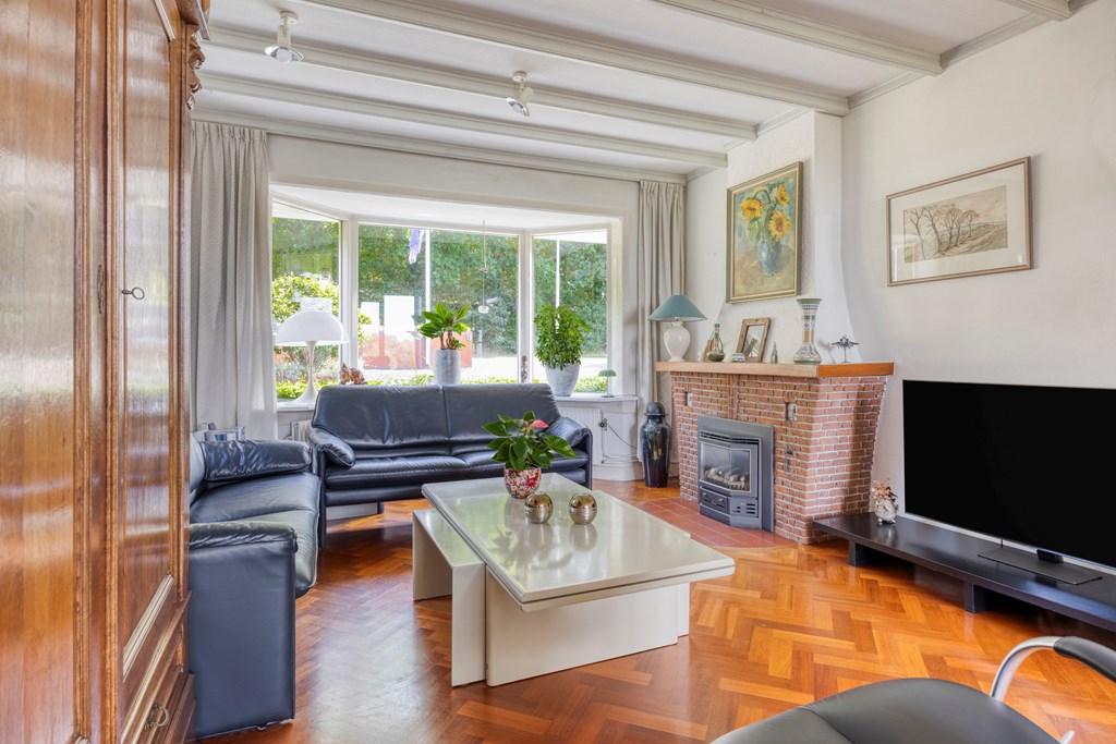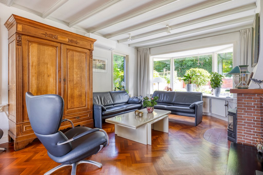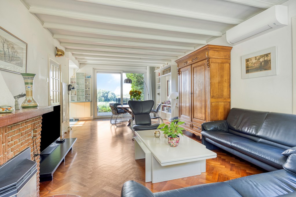 The living room is the heart of the home and exudes warmth thanks to the combination of large windows, a cozy fireplace, and characterful wooden support beams. The open layout offers plenty of scope for arranging a sitting area and dining space, while the sliding door to the garden creates a direct connection to the outdoors. Thanks to the air conditioning, this room is comfortable in every season.