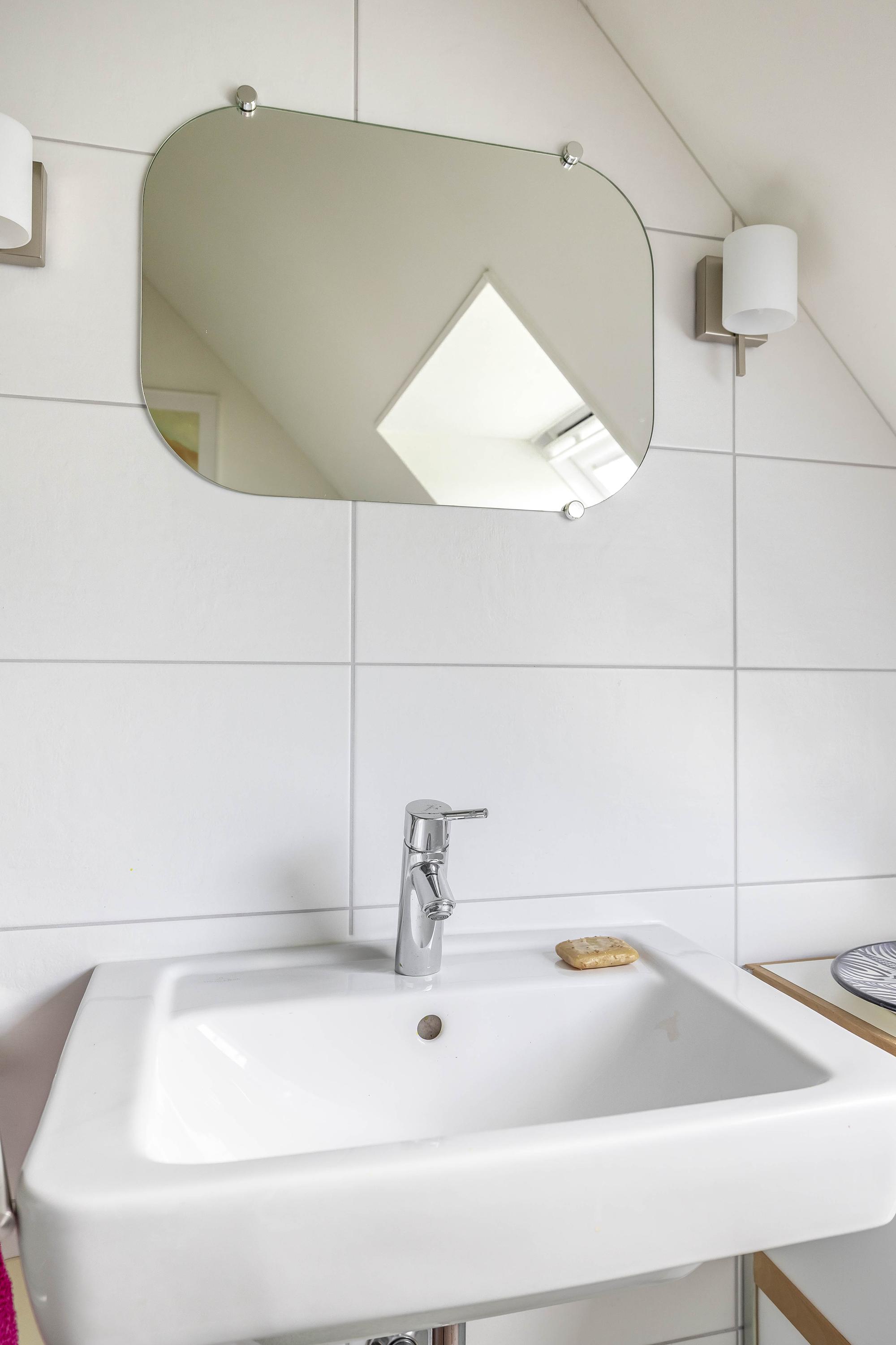 The bathroom on this floor is separated from the landing by a glass wall with a glass door. It has vinyl flooring and the walls are partially tiled. A large Velux skylight provides the necessary light. The bathroom is equipped with a wall-mounted toilet, a washbasin with mixer tap, and a shower cubicle with thermostatic tap, which can be closed off with a sliding door.