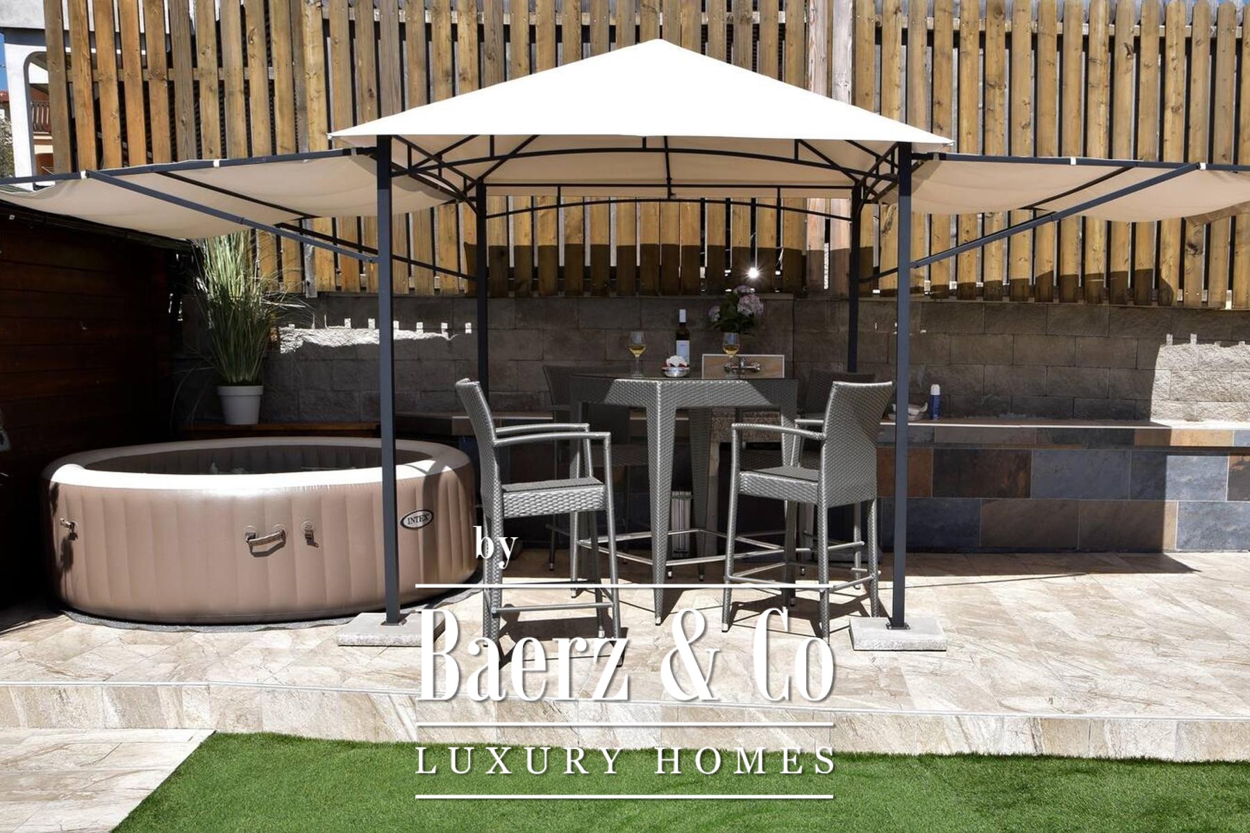 Outdoors, the landscaped garden is anchored by a heated saltwater pool measuring 4 by 7 metres, a garden house and a garage, all designed for effortless day-to-day living. Two electric vehicle chargers and oil-fired central heating ensure the property is well-adapted for year-round use. Electric shutters provide peace of mind.