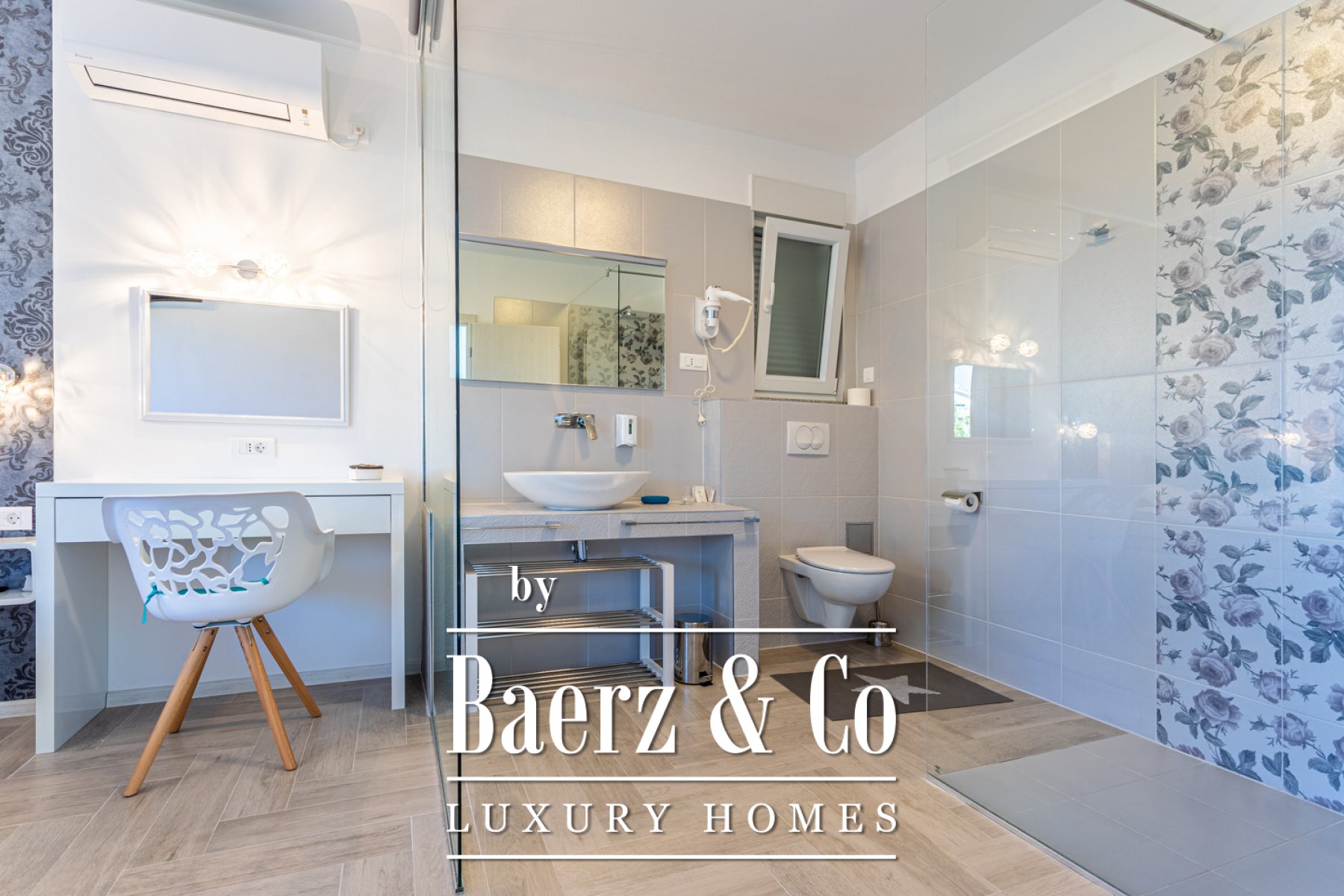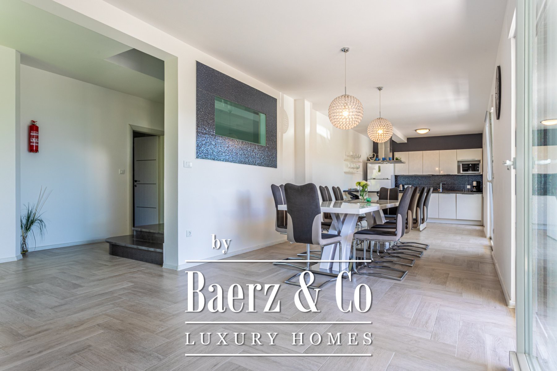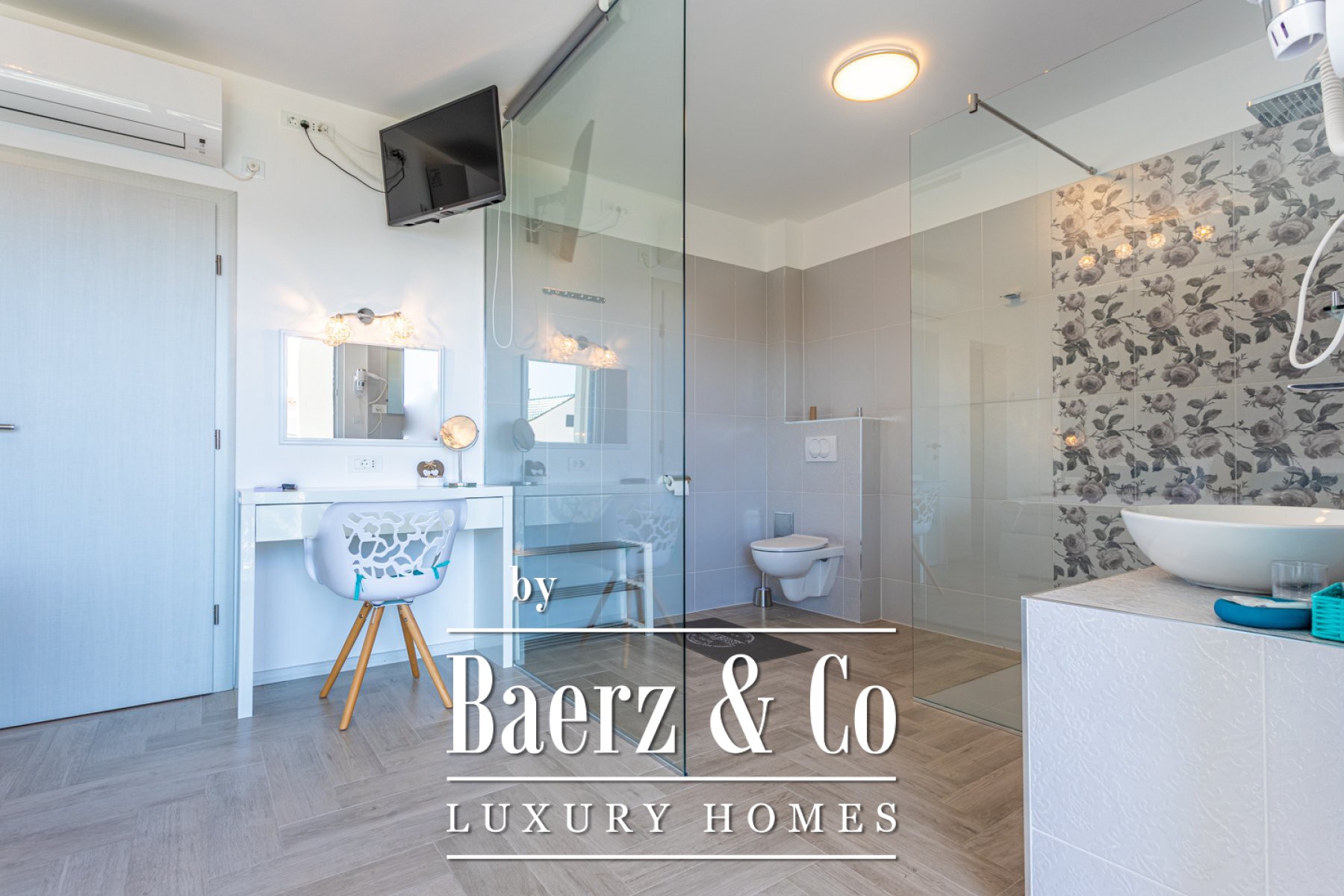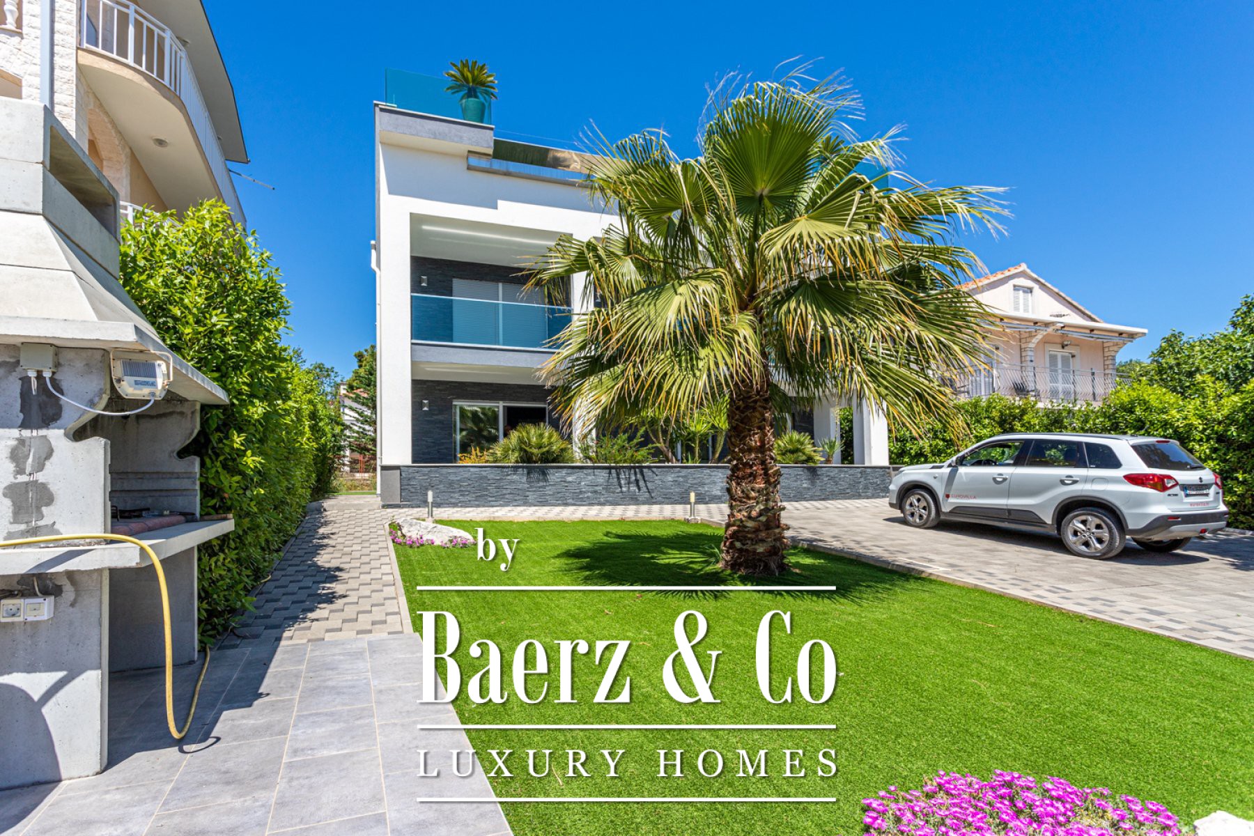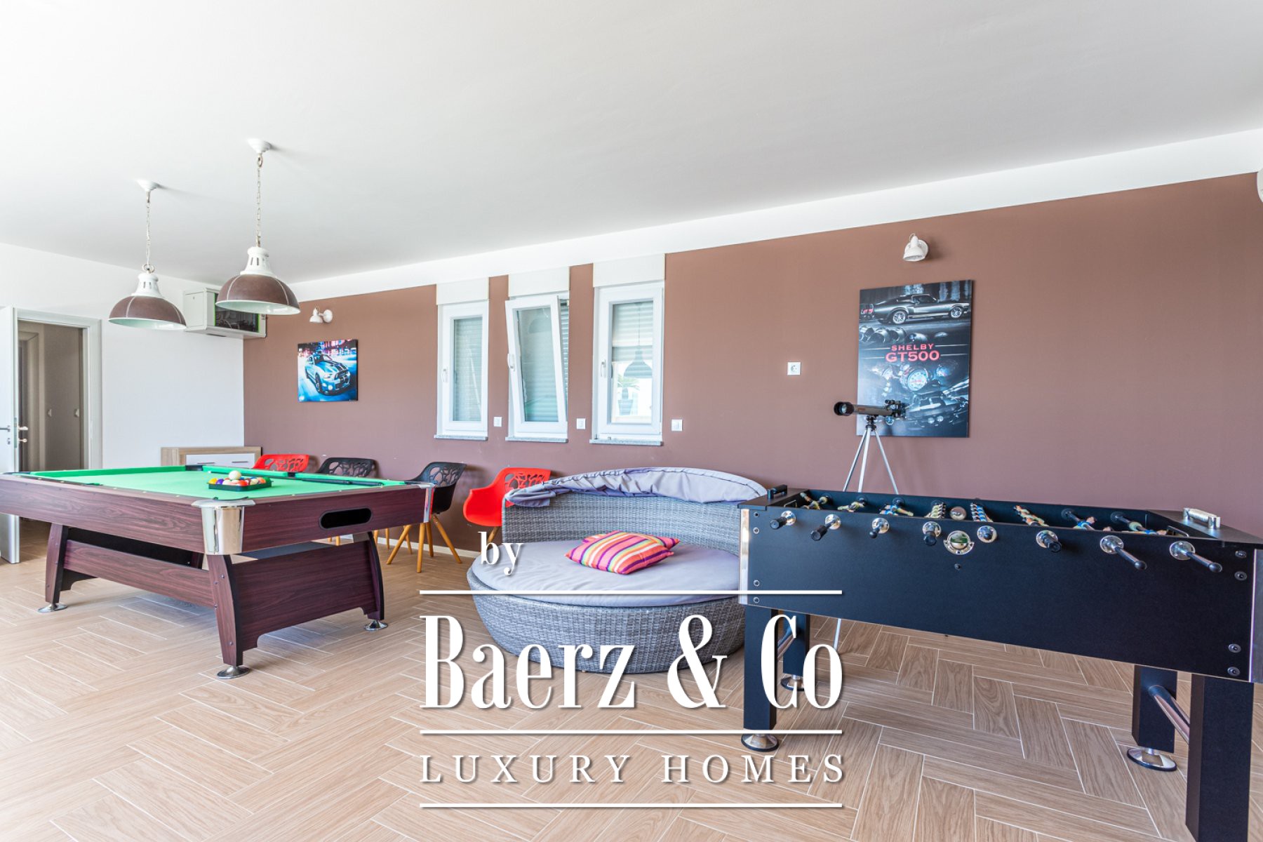 with landscaping and parking for several vehicles. The first floor consists of a living room with access to a loggia with a beautiful sea view and three en suite bedrooms. The second floor is designed as a recreation area that includes two toilets, sauna, playroom (billiards, table football), summer kitchen and a spacious terrace with jacuzzi, shower, sun deck and overflow pool overlooking the sea.