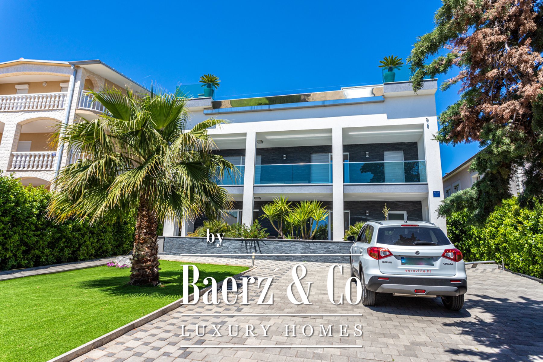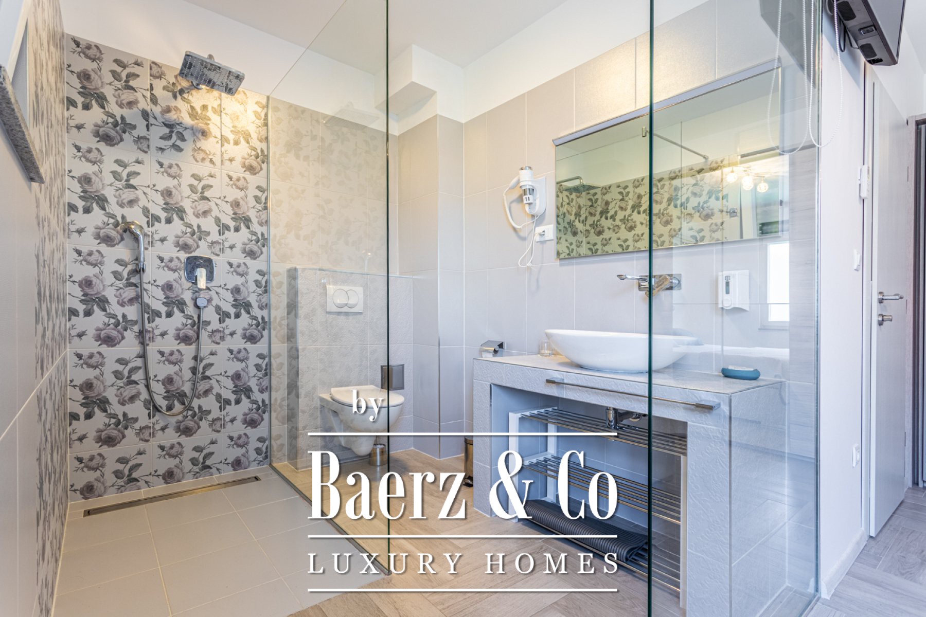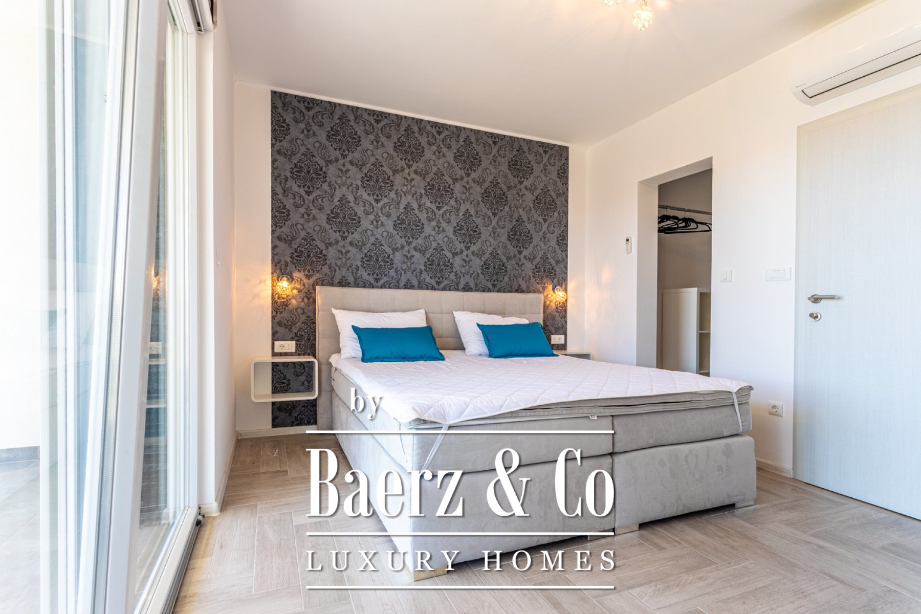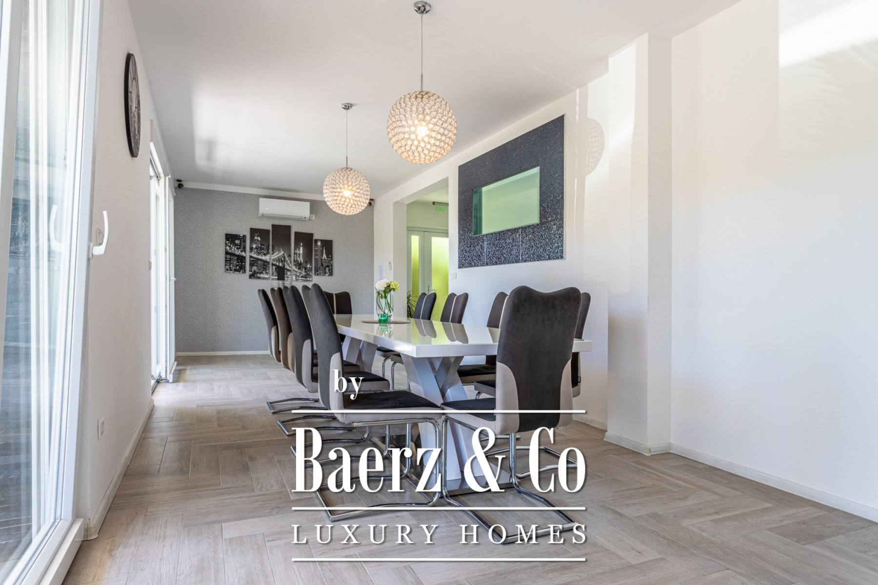 with landscaping and parking for several vehicles. The first floor consists of a living room with access to a loggia with a beautiful sea view and three en suite bedrooms. The second floor is designed as a recreation area that includes two toilets, sauna, playroom (billiards, table football), summer kitchen and a spacious terrace with jacuzzi, shower, sun deck and overflow pool overlooking the sea.